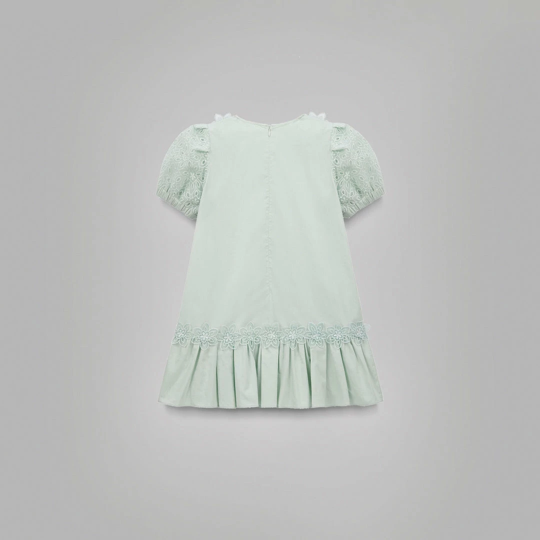 This kids dress is cut from mint organic cotton poplin. It is designed with a lace frill bib and diamante buttons. The dress is loose fitting and is finished with a peplum hem. Check the Size Guide to find your perfect fit.