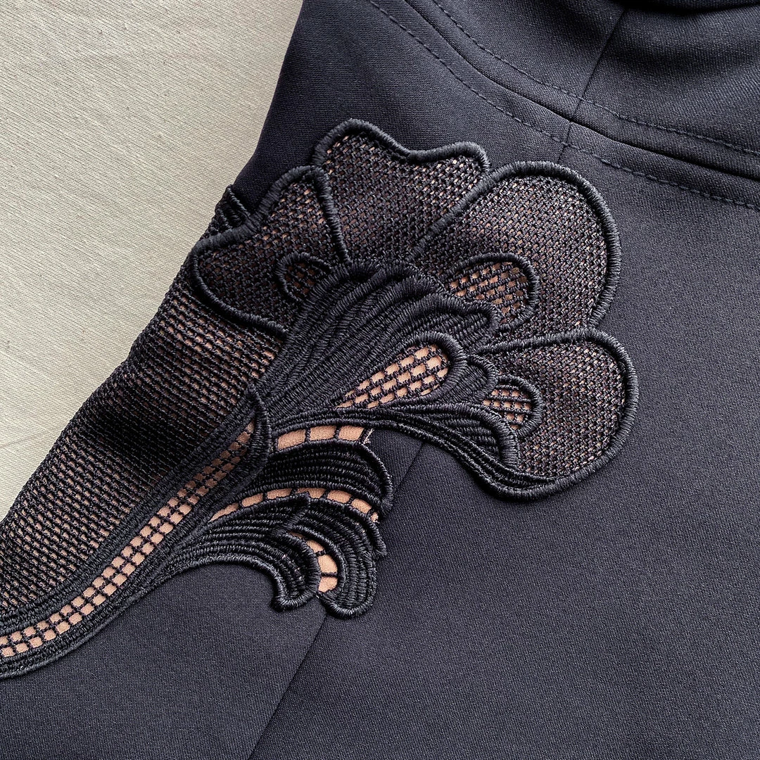 This mini dress is cut from black bonded crepe. It is designed with underwired bust cups and spaghetti straps. It features lace trim motifs at the waist with tan lining. The skirt flares out to a mini length. Check the Size Guide to find your perfect fit.