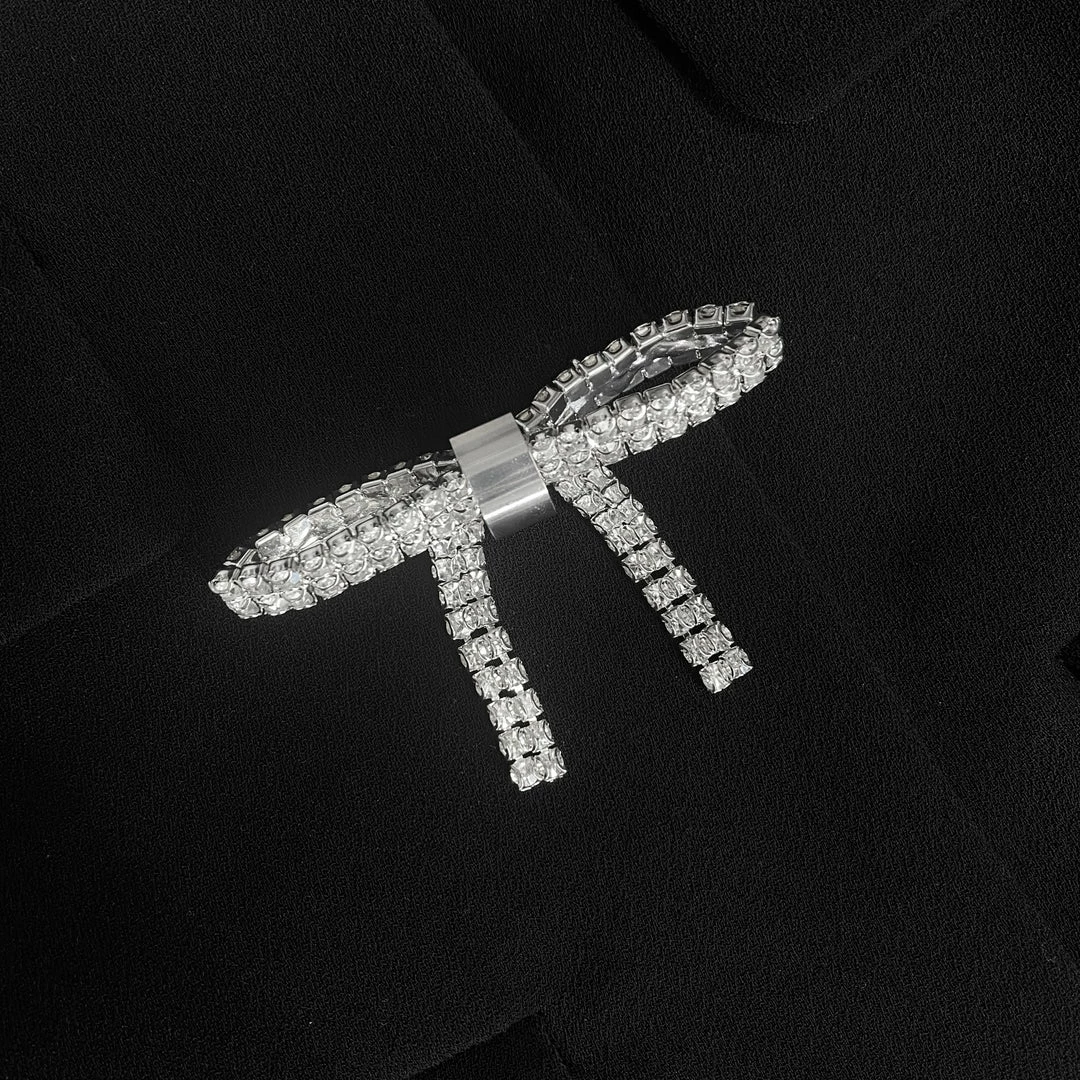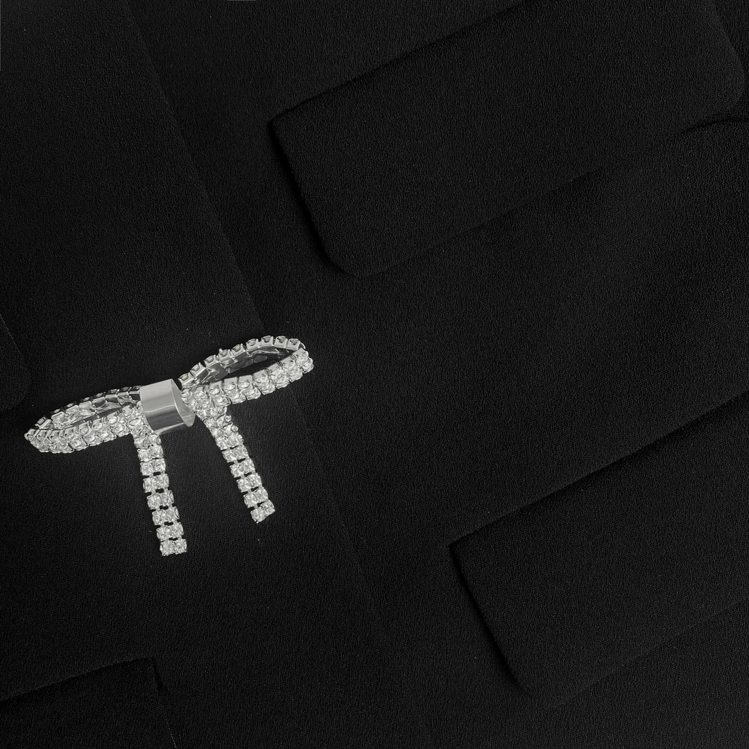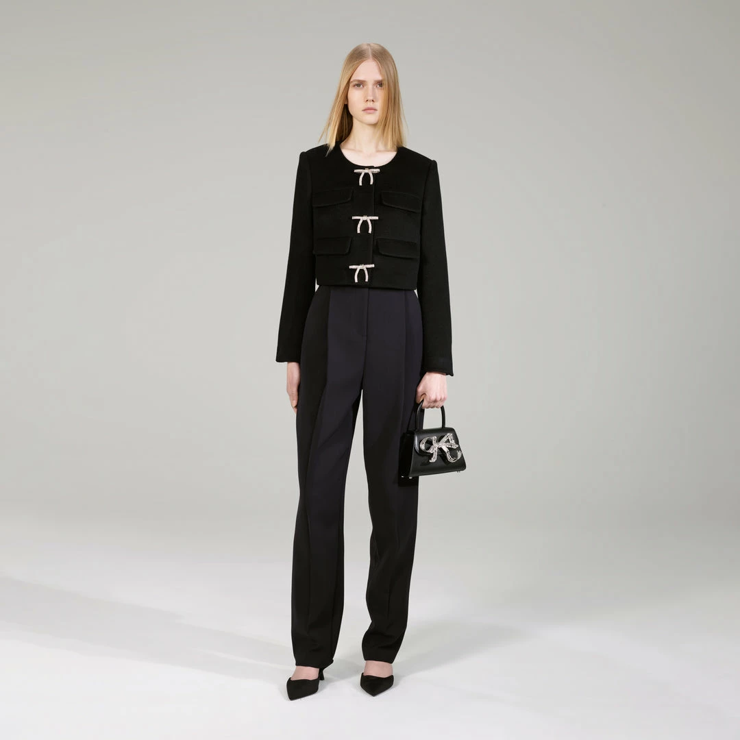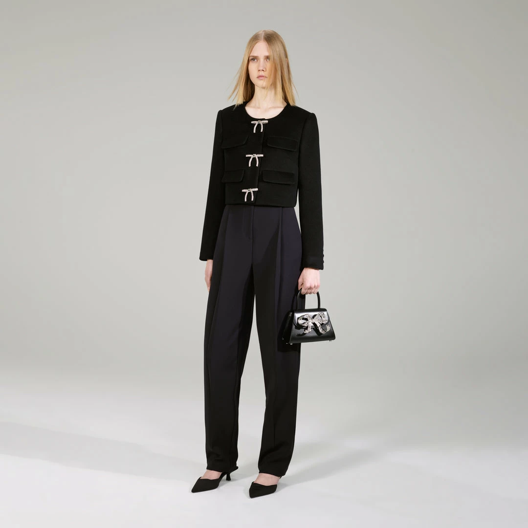 Cut from heavy crepe for a substantial feel and clean silhouette, this little black jacket is an instant classic. Diamanté bows add feminine flair to a boxy, androgynous silhouette, while flap pockets add definition and store your must-haves. Layer it over a collared shirt for a polished office ensemble or wear it with jeans and flats for an effortless everyday look.