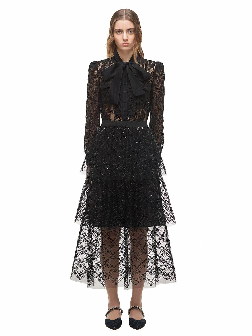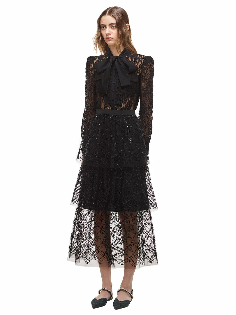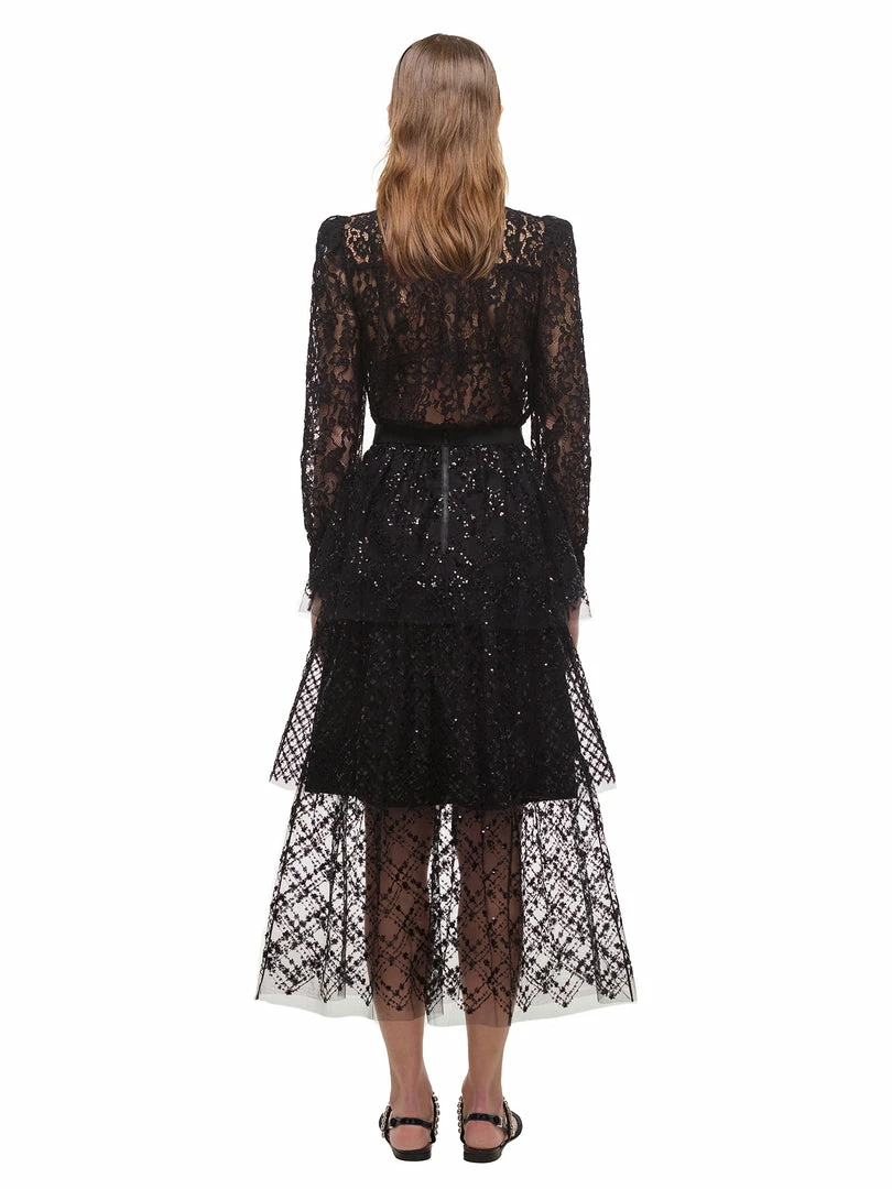 Self-portrait Black Grid Sequin Tiered Skirt READY TO WEAR