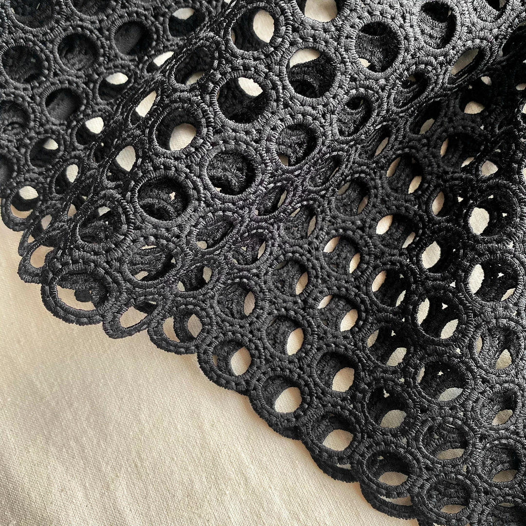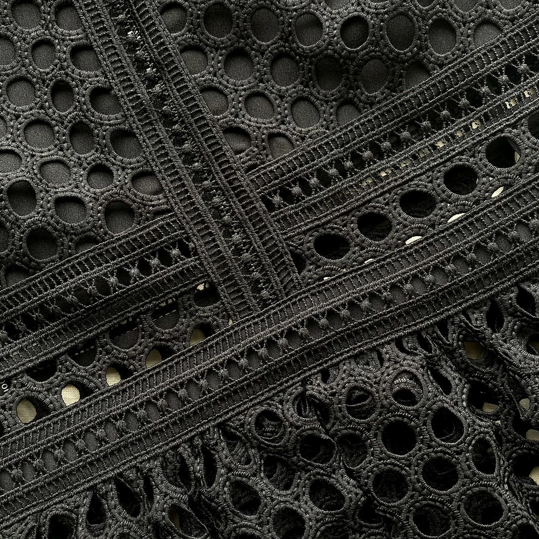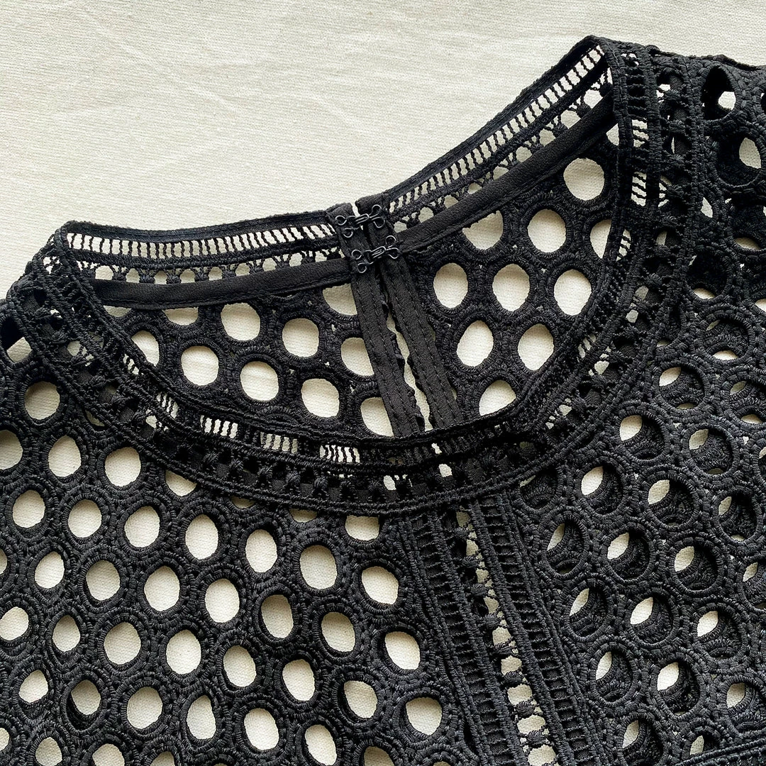 This top is cut from black circle guipure lace. It is designed with a round neck and lace trims. It is fitted at the waist and falls to a flared peplum hem. Check the Size Guide to find your perfect fit.