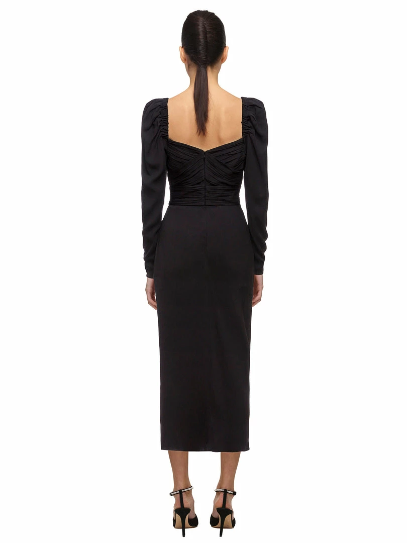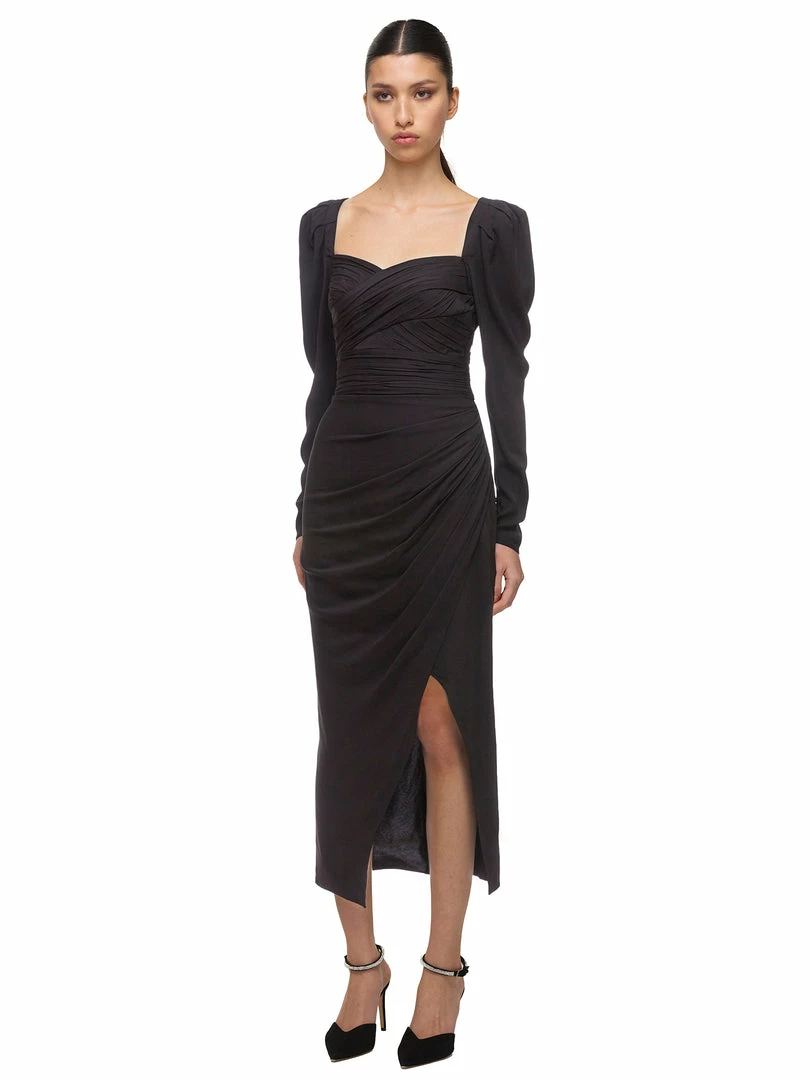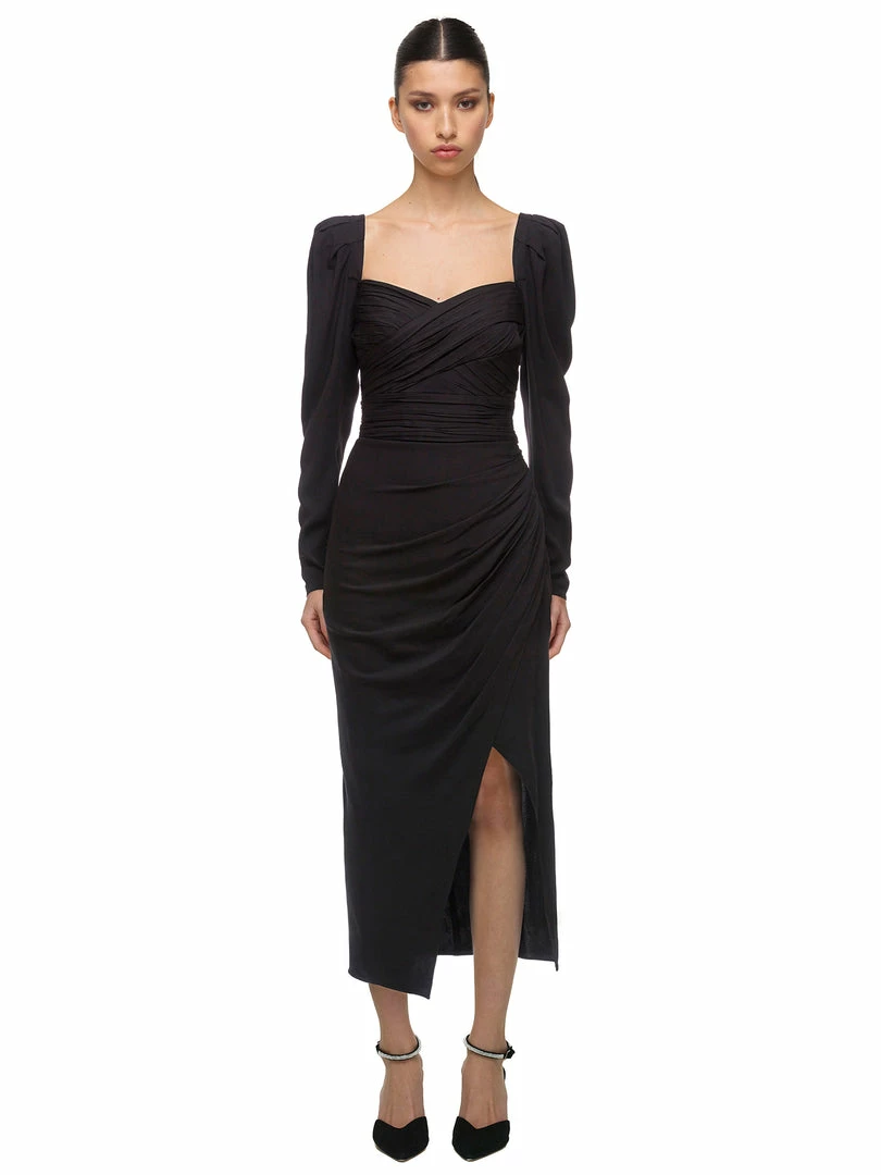 This stretch crepe midi dress is designed with a flattering sweetheart neckline and a gathered wrap bust detail. The skirt falls to a fitted silhouette finished with a side split. Check the Size Guide to find your perfect fit.