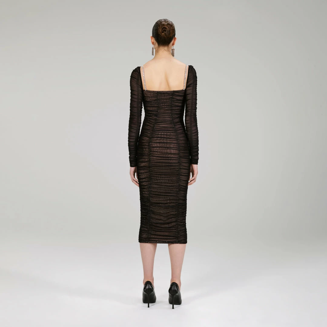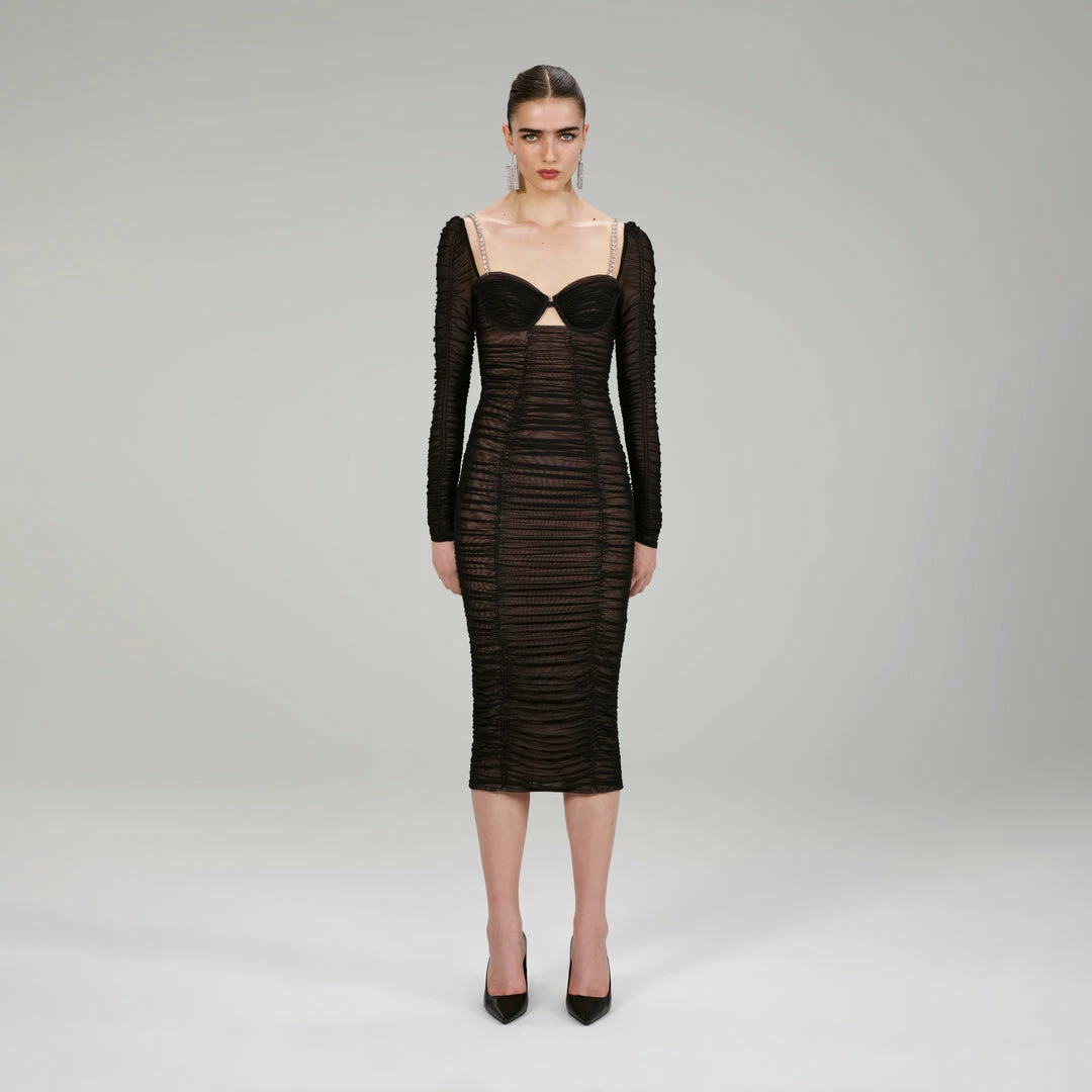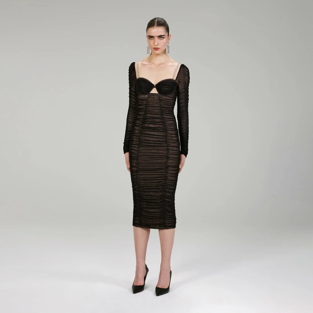 Self-portrait Black Power Mesh Long Sleeve Midi Dress