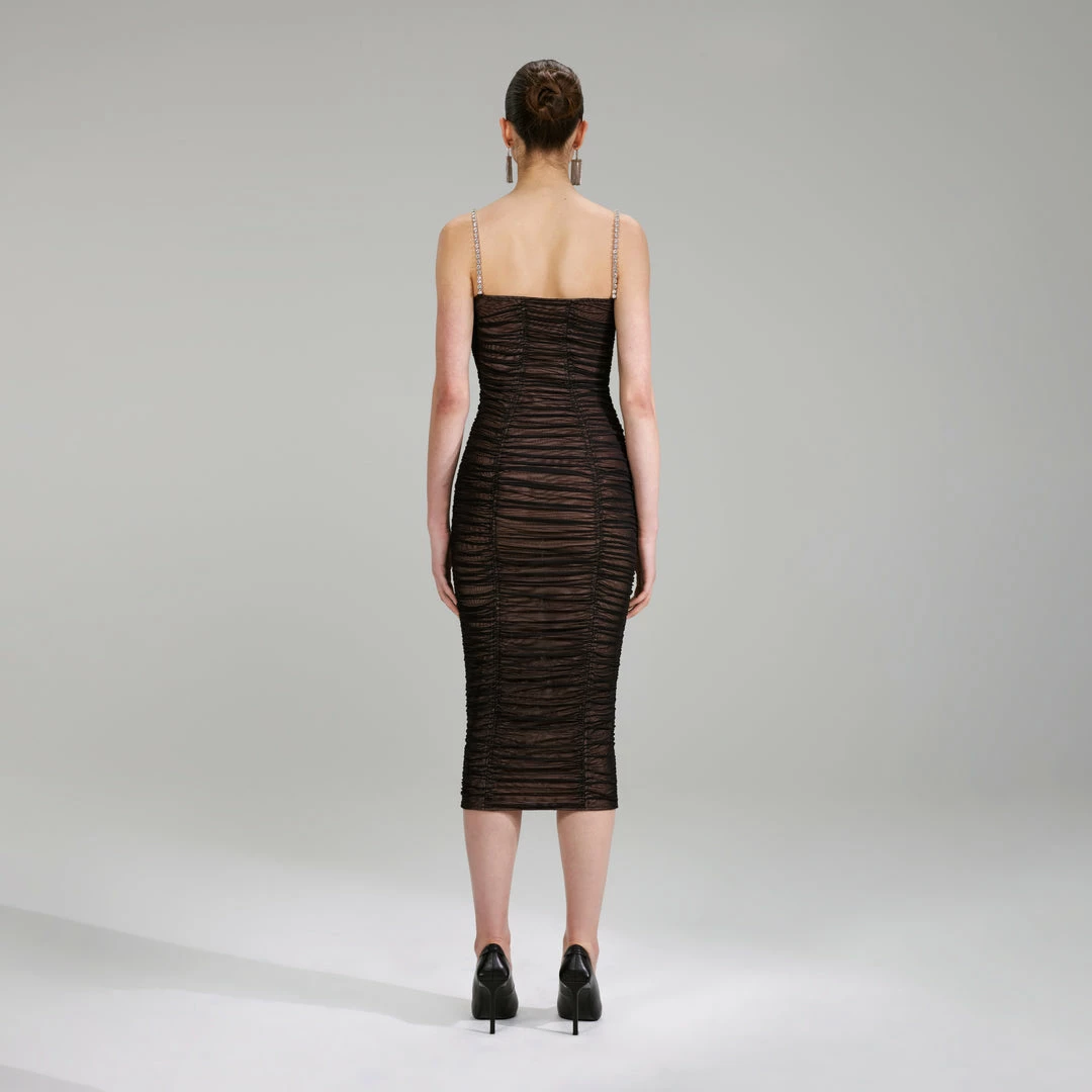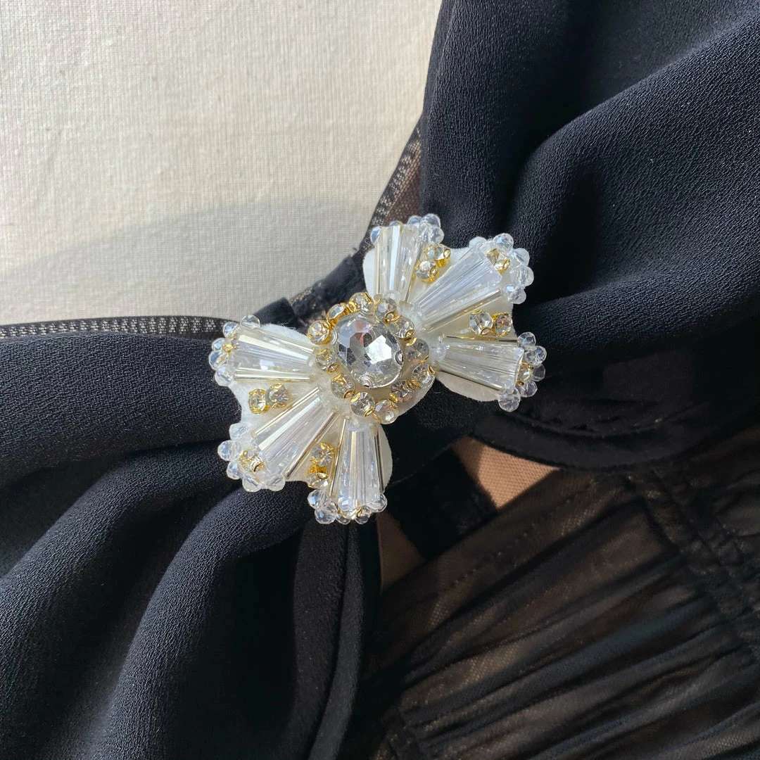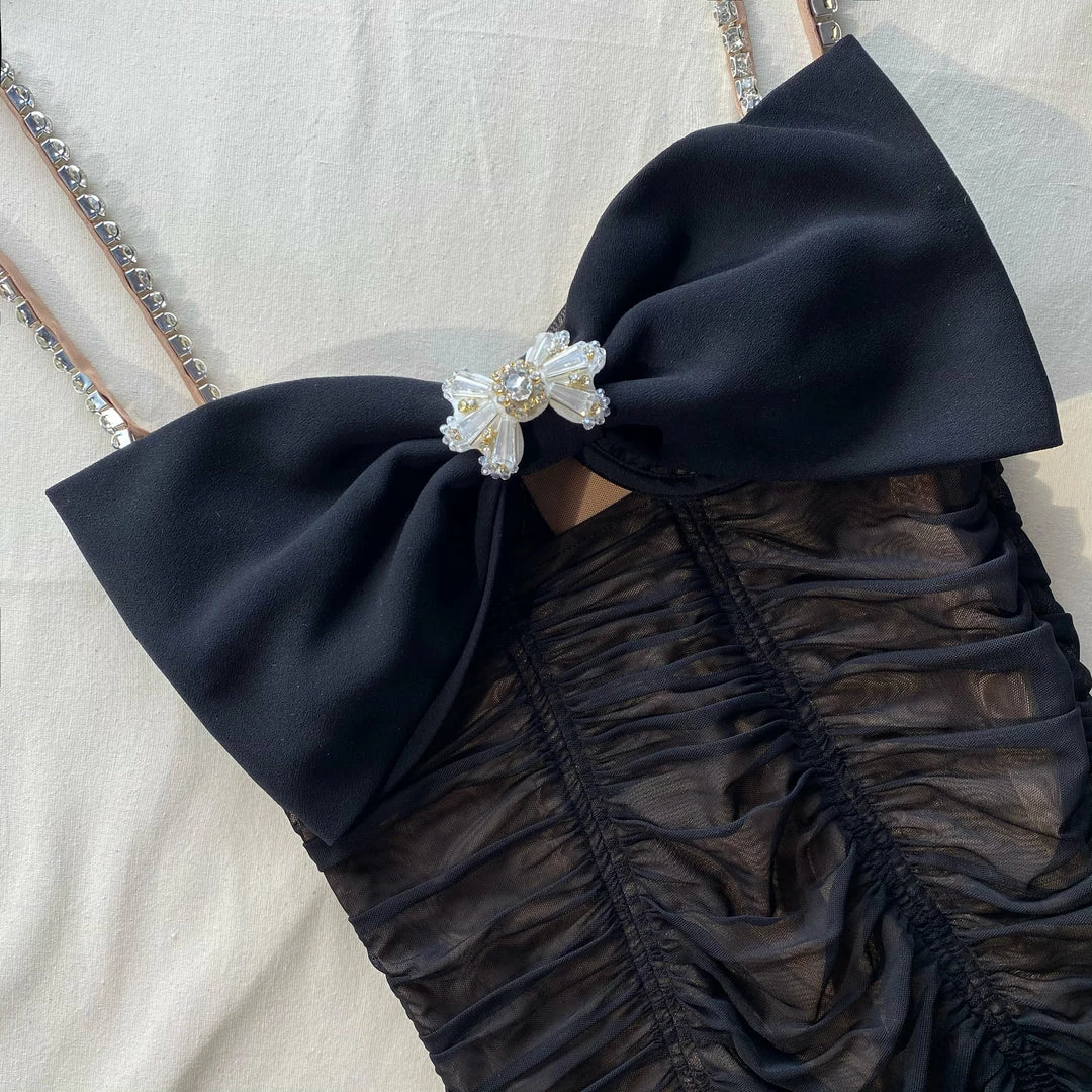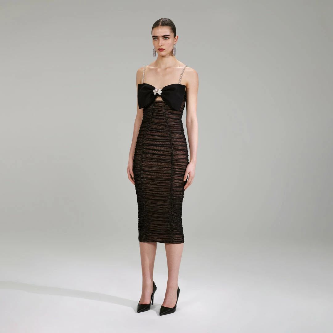 When in doubt, put a bow on it. A statement bow is the star of this dazzling black midi dress, which is crafted from ruched mesh for an impeccable fit. On your next big night out, pair it with black platforms and glittering earrings to complement its diamanté accents.