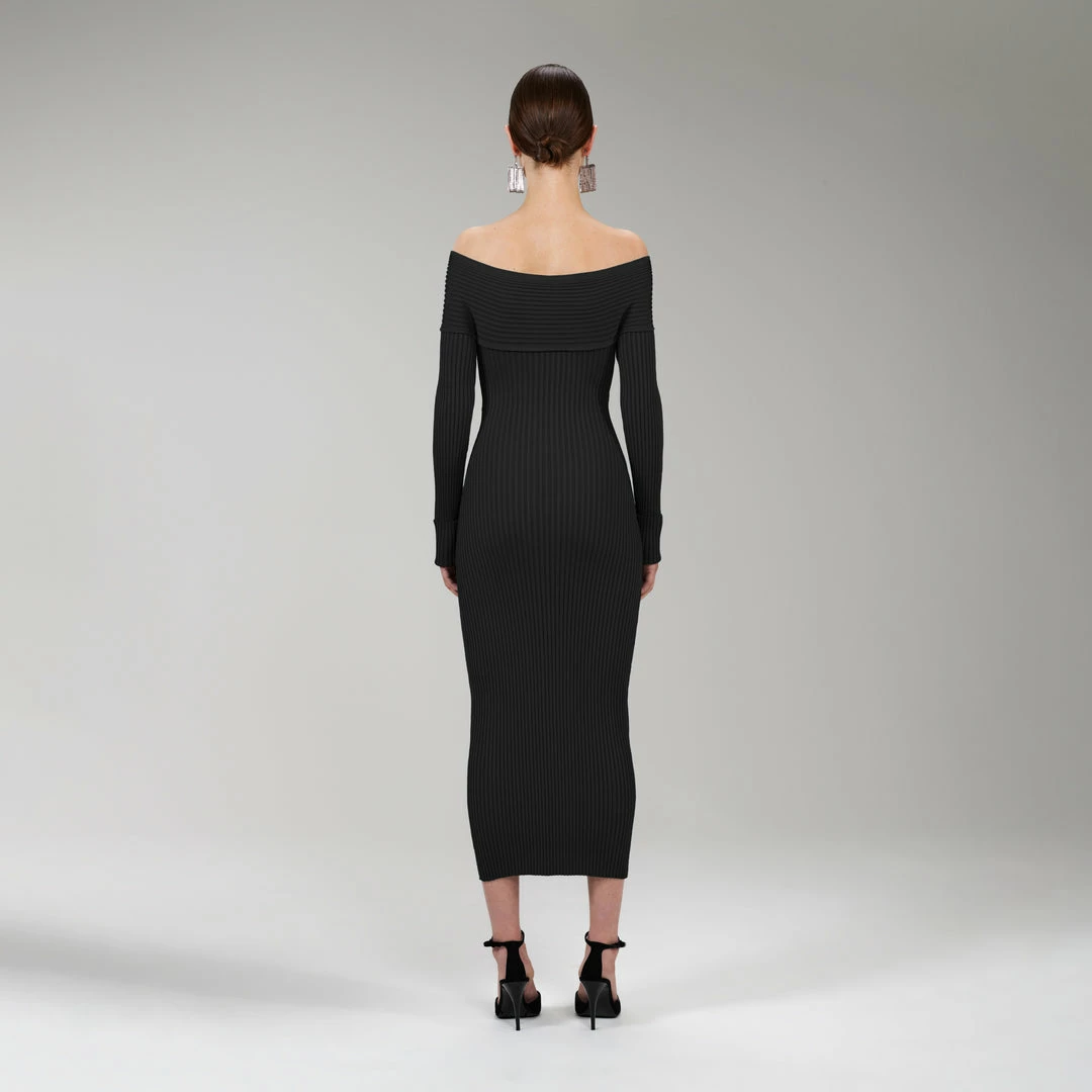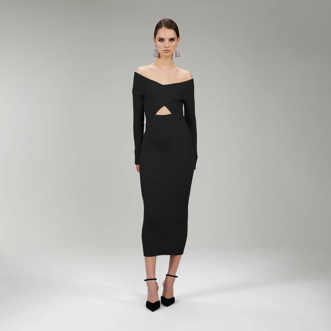 Self-portrait Black Ribbed Knit Crossover Bust Midi Dress NEW ARRIVALS