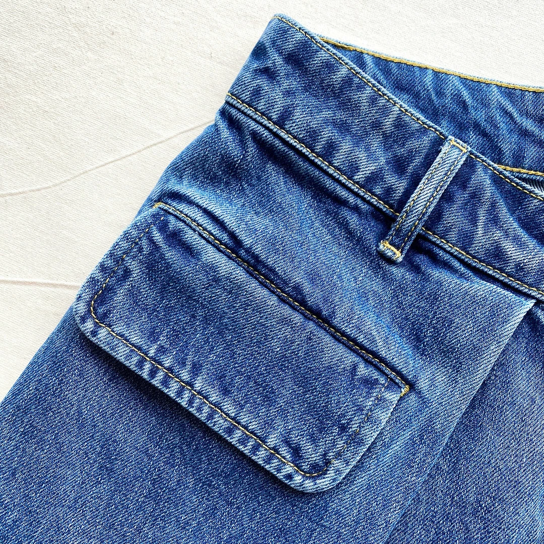 These denim shorts are cut from a blue wash denim. They sit high on the waist and are designed with a pleat front and a flattering kick out hem. Check the Size Guide to find your perfect fit.