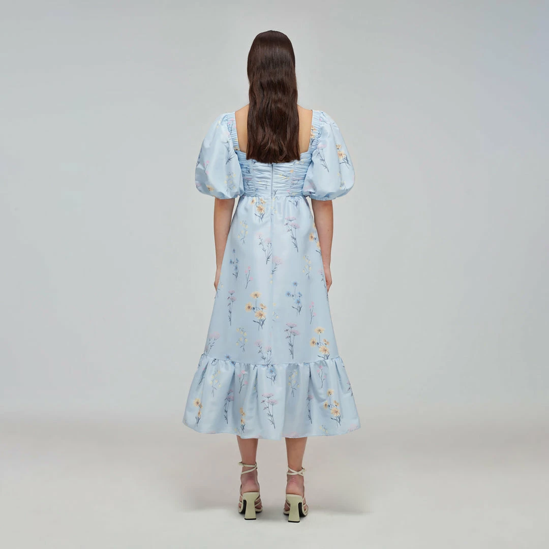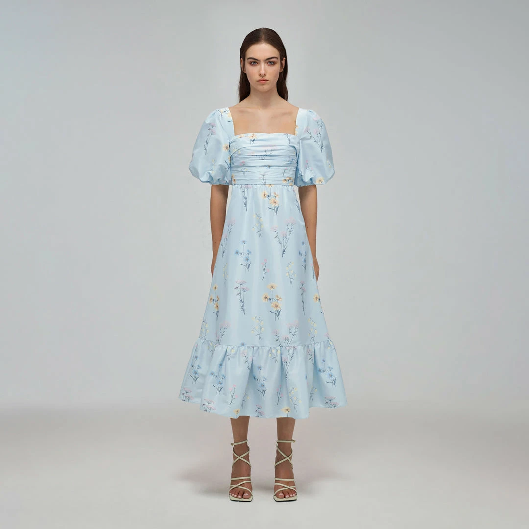Self-portrait Blue Floral Watercolour Taffeta Midi Dress READY TO WEAR