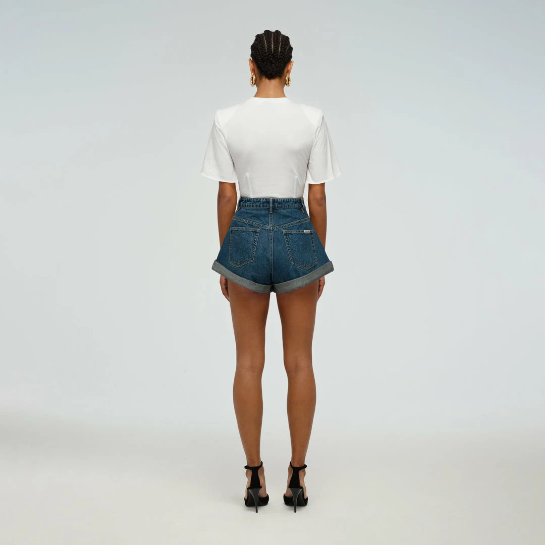 These denim shorts are cut from a mid blue wash. They sit high on the waist and are designed with a subtle flared rolled up hem. Check the Size Guide to find your perfect fit.