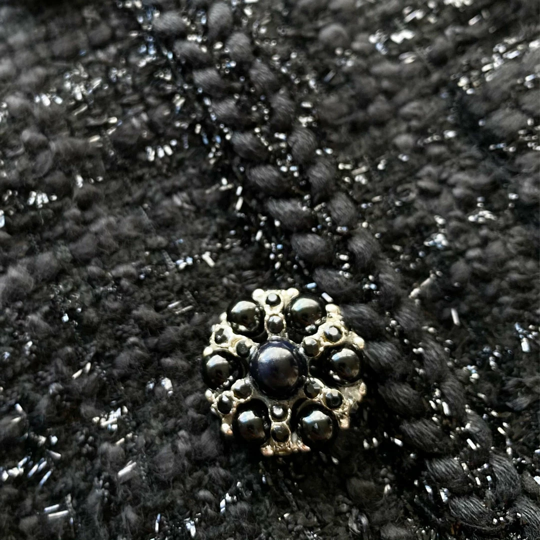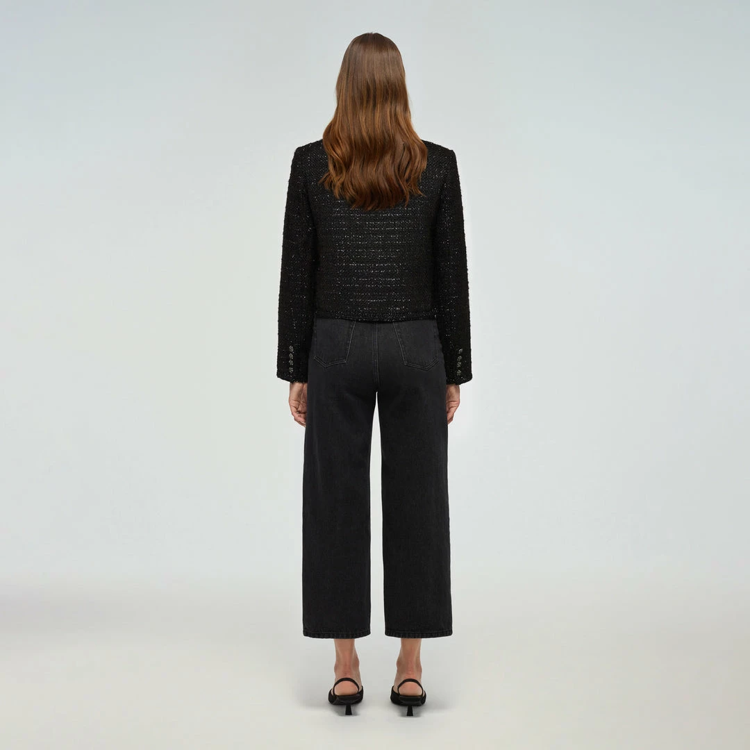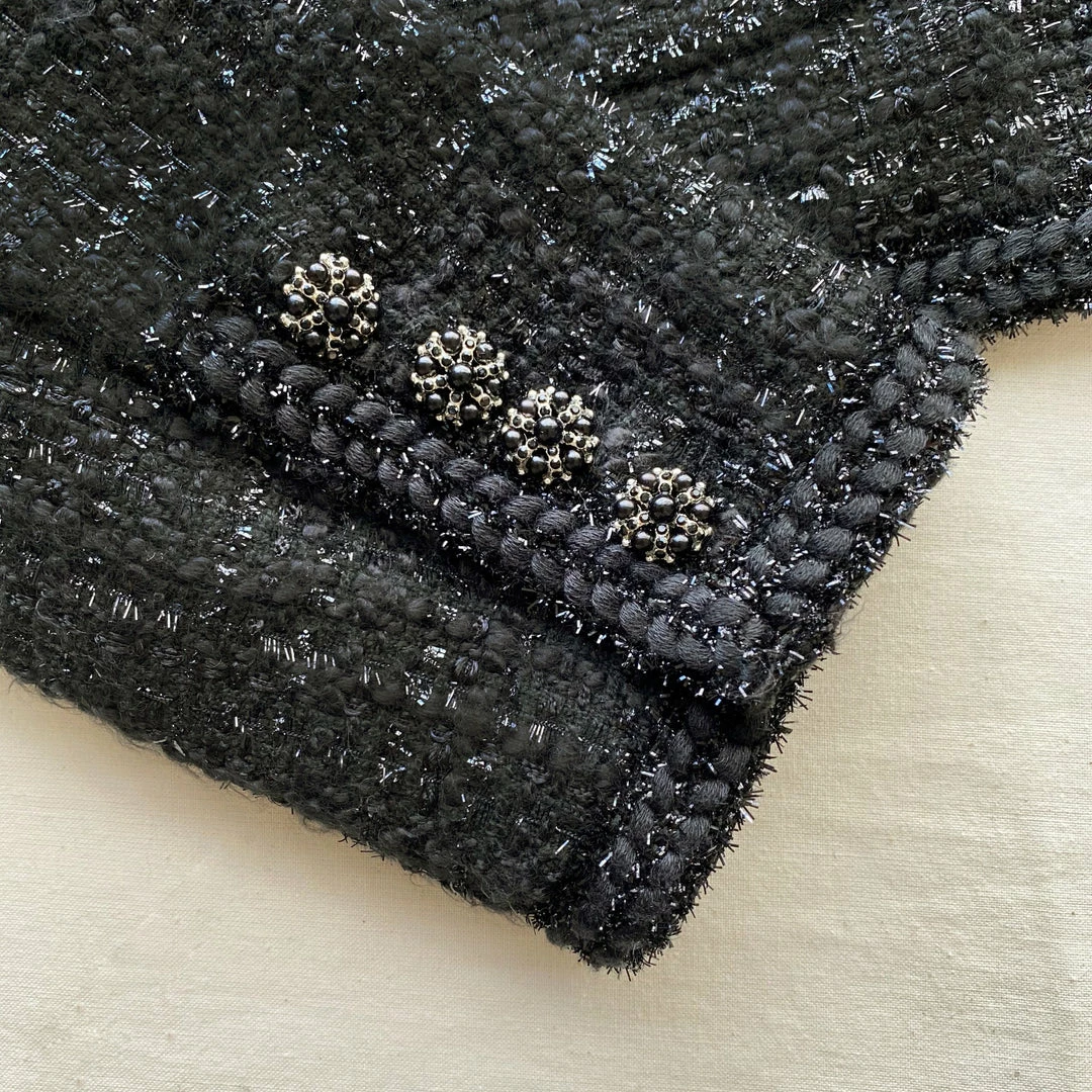 This jacket is cut from black bouclé. It is designed with a collarless neckline and fastens with tonal diamanté buttons. It features front patch pockets. Check the Size Guide to find your perfect fit.