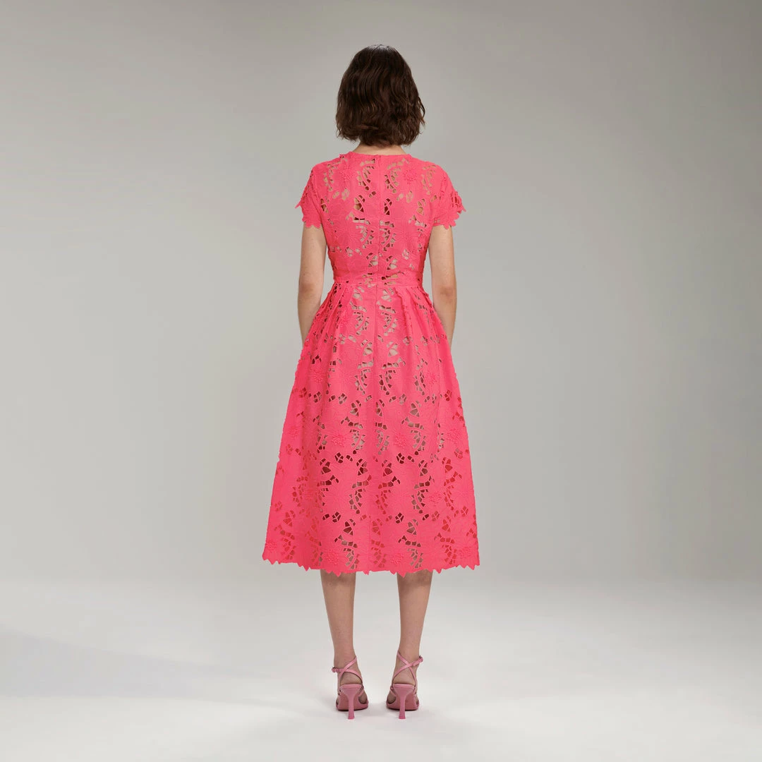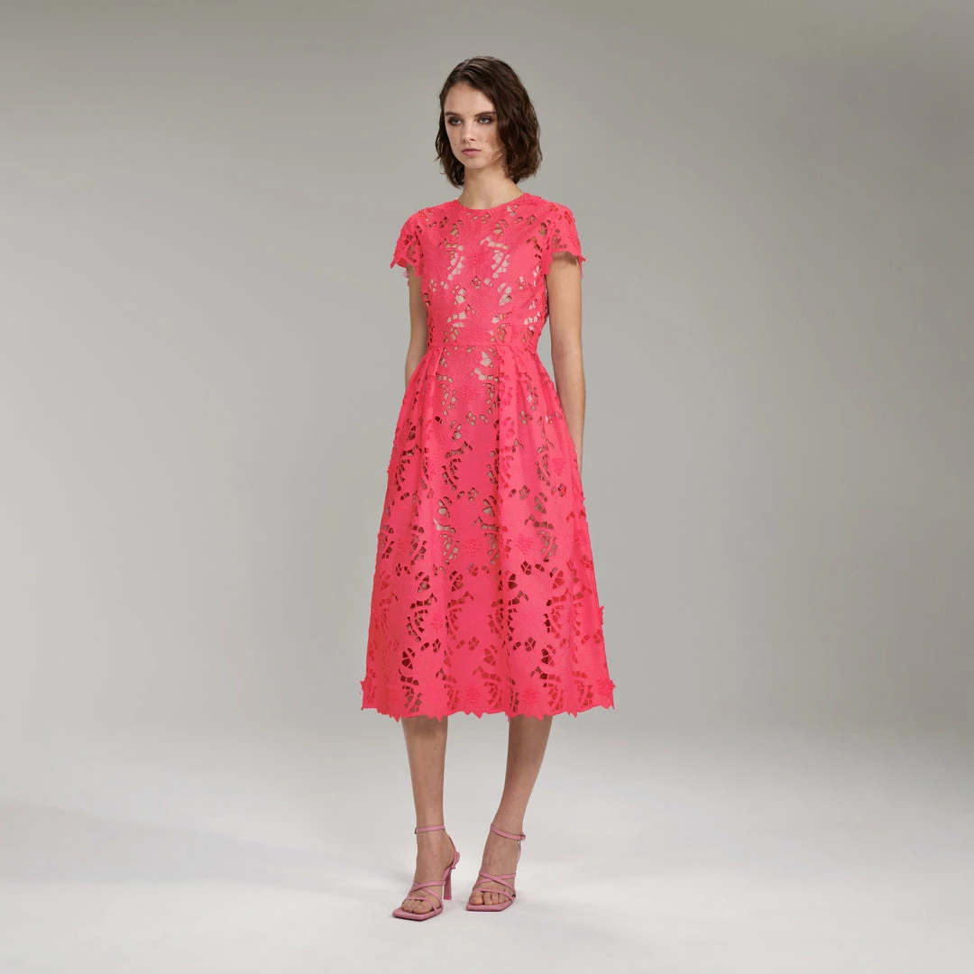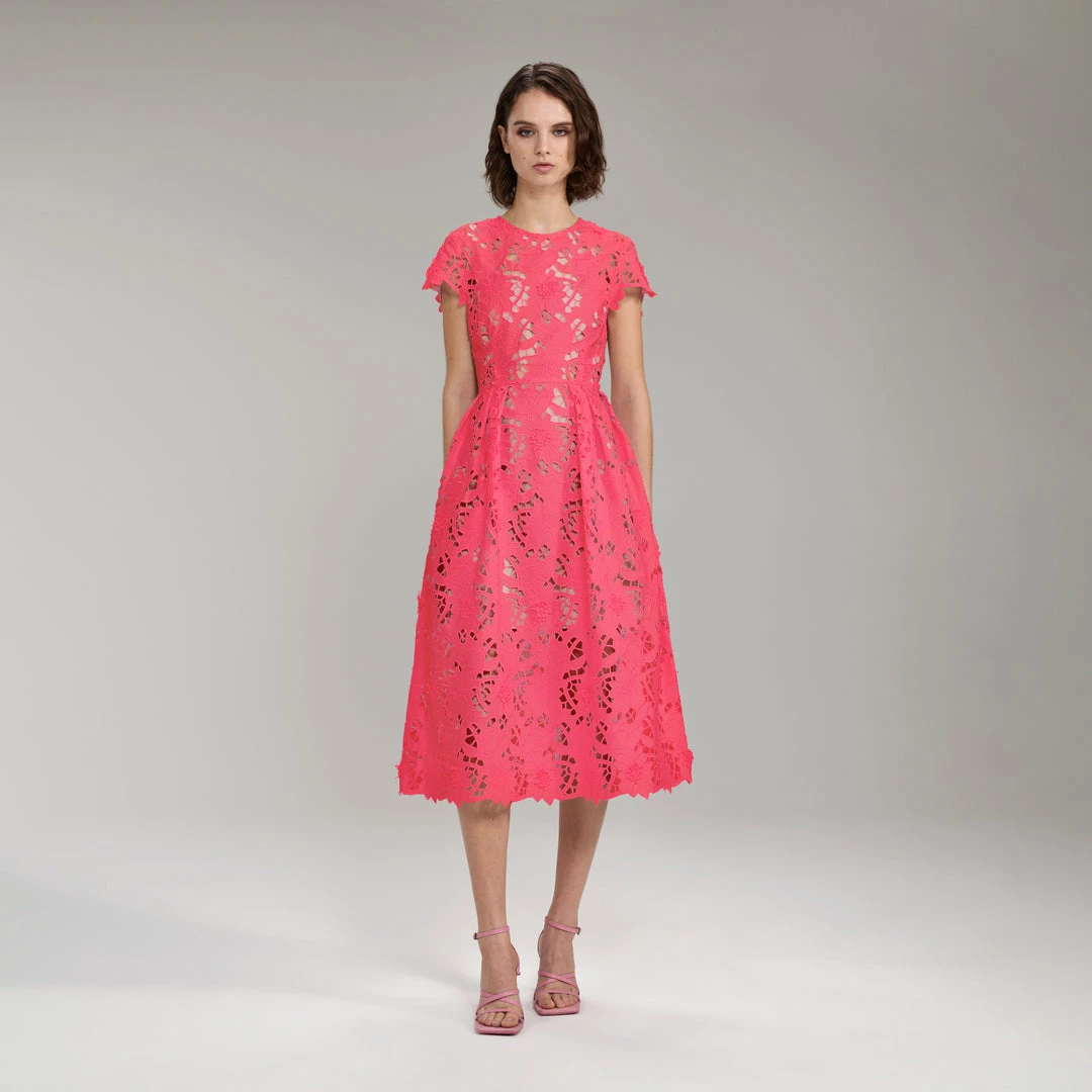 This bright pink midi dress is cut from peony cotton guipure. It is designed with a short sleeve and is finished with a scalloped hem. It is fitted at the waist and flares out to a full midi skirt.