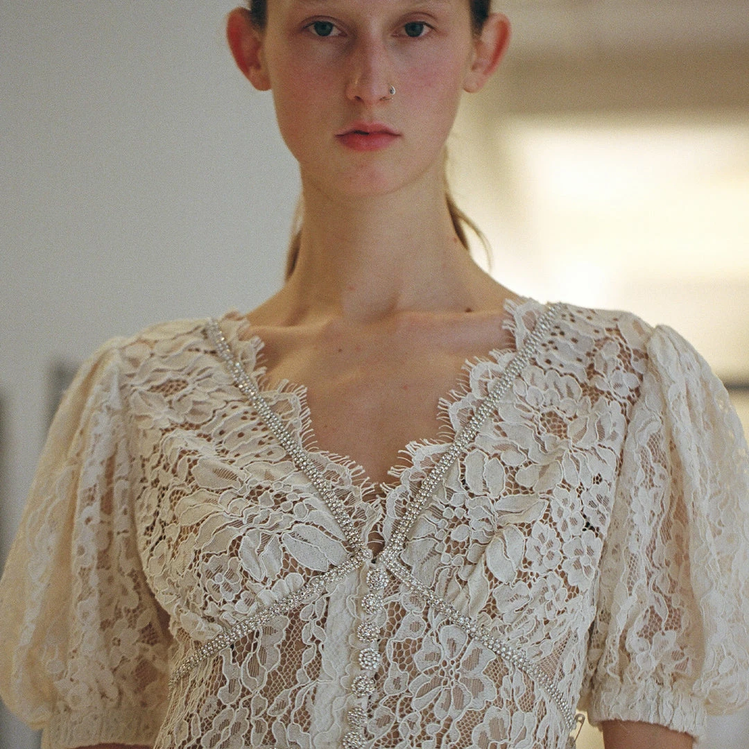 This midi dress is cut from fine corded lace. Designed with puff sleeves, ruching through the skirt and featuring diamante buttons and trims. This style comes with a separate nude cami lining. Check the Size Guide to find your perfect fit.