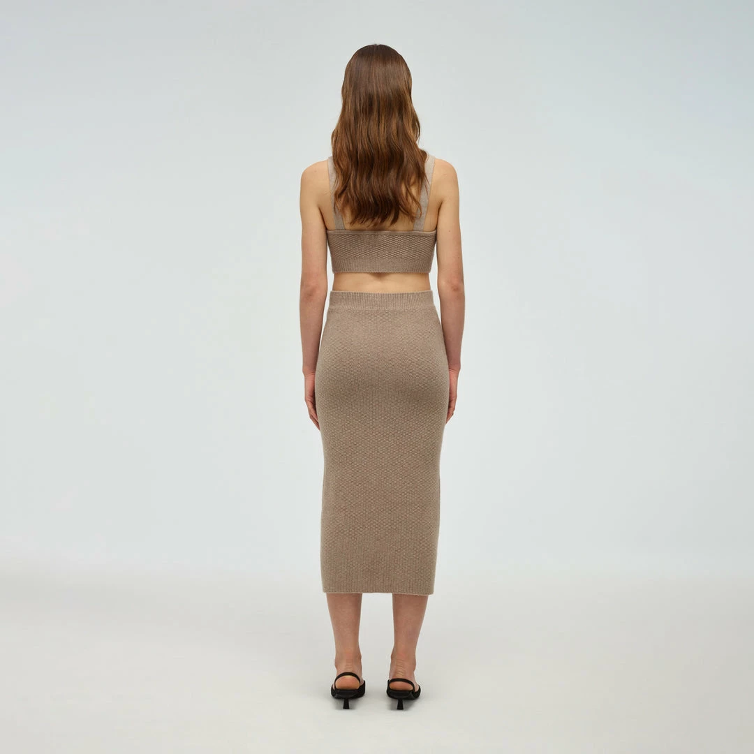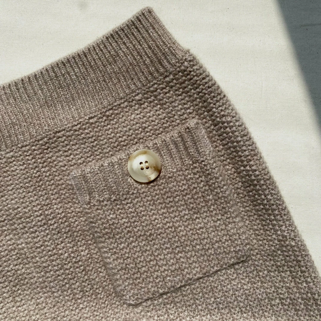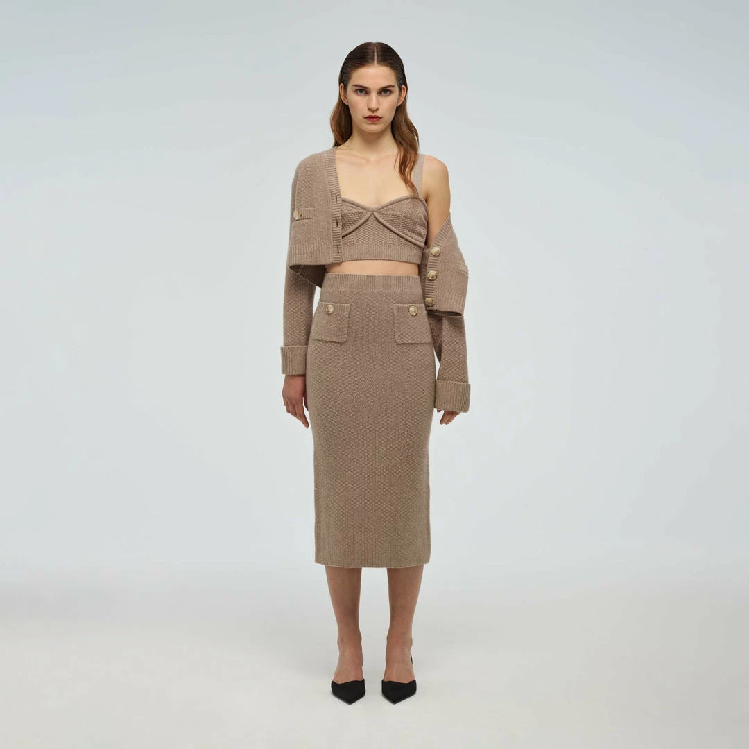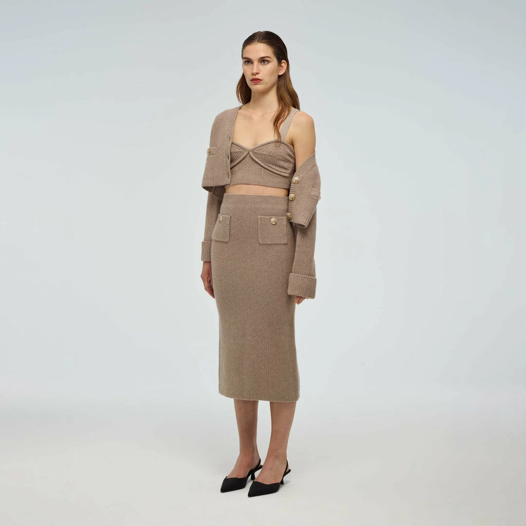 This stone cashmere blend knit midi skirt features front patch pockets finished with tortoise buttons. The fitted skirt silhouette sculpts the body and falls to a midi length. Check the Size Guide to find your perfect fit.