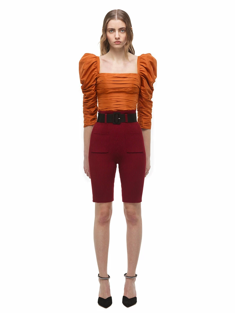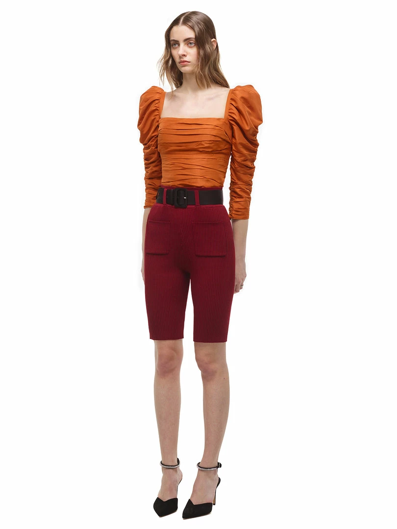 This gathered detail top is cut from cinnamon taffeta. Designed with a square neckline and statement puff sleeves. This style is lined. Check the Size Guide to find your perfect fit.