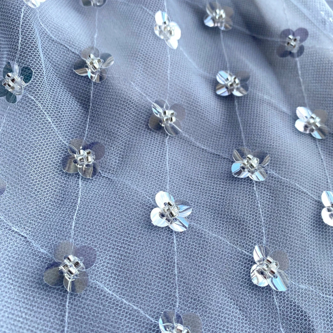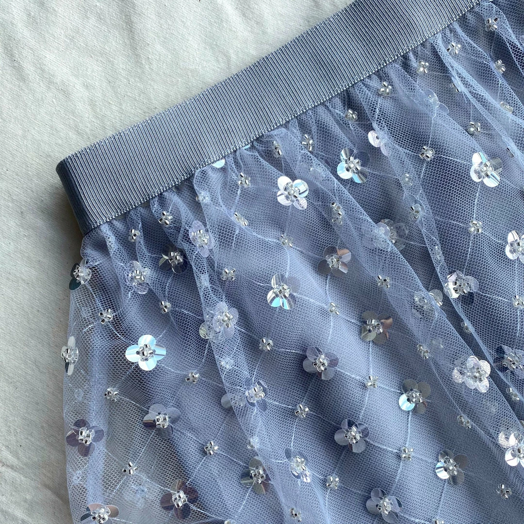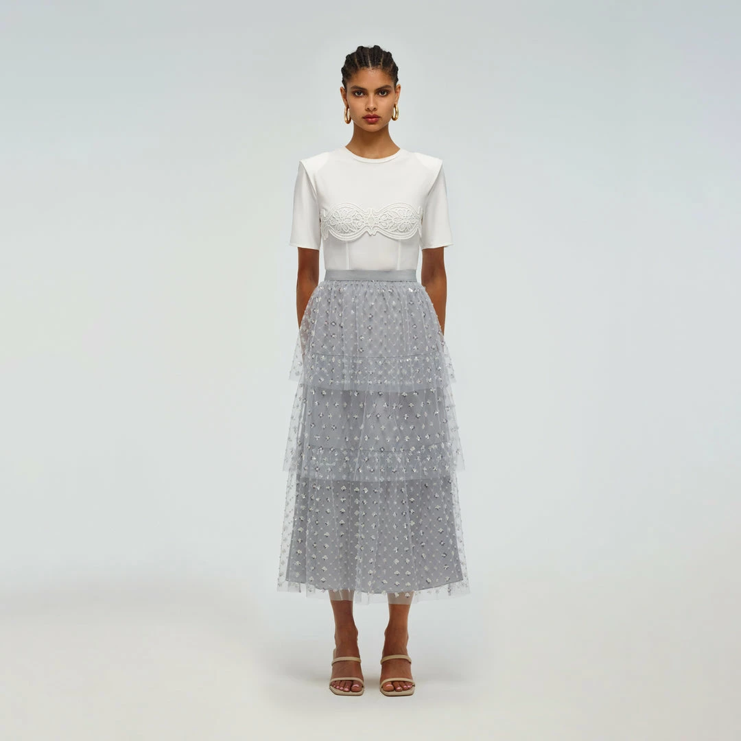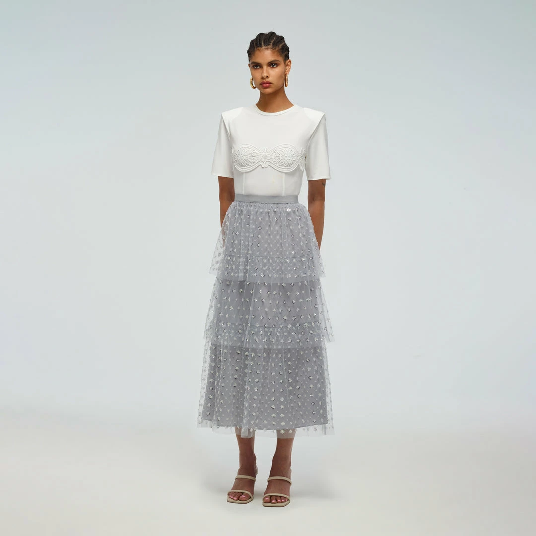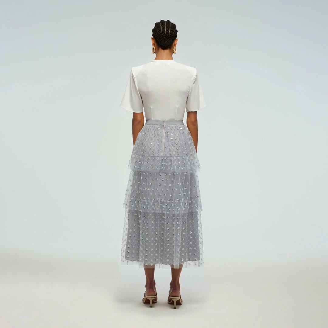 This skirt is cut using silver beaded sequin fabric. It falls to a tiered midi skirt with a full silhouette. This style is lined. Check the Size Guide to find your perfect fit.