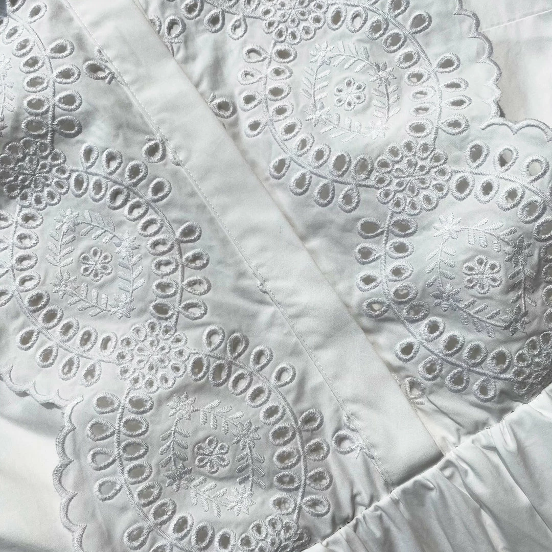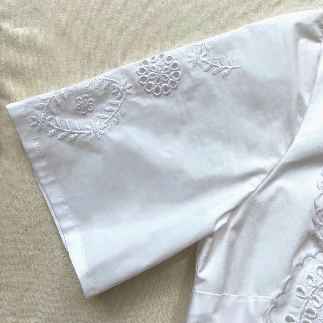 This white midi dress is cut from organic cotton. It has a shirt collar with a concealed placket. The front bodice and sleeves are detailed with broderie anglaise. The skirt falls to a full silhouette and finishes on the scallop edge of the broderie. Check the Size Guide to find your perfect fit.