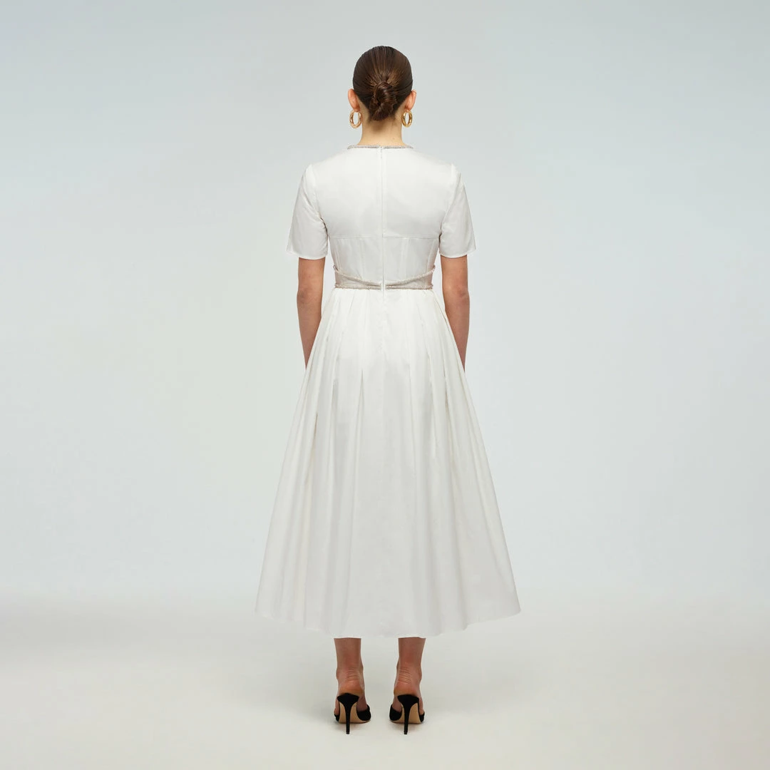 This white midi dress is cut from taffeta finished with diamante trims at the neck and waist. The bodice has a curved underbust seam and boning through the body. The shoulders are accentuated with removeable shoulder pads. The skirt is pleated at the waist and falls to a full midi skirt. Check the Size Guide to find your perfect fit.