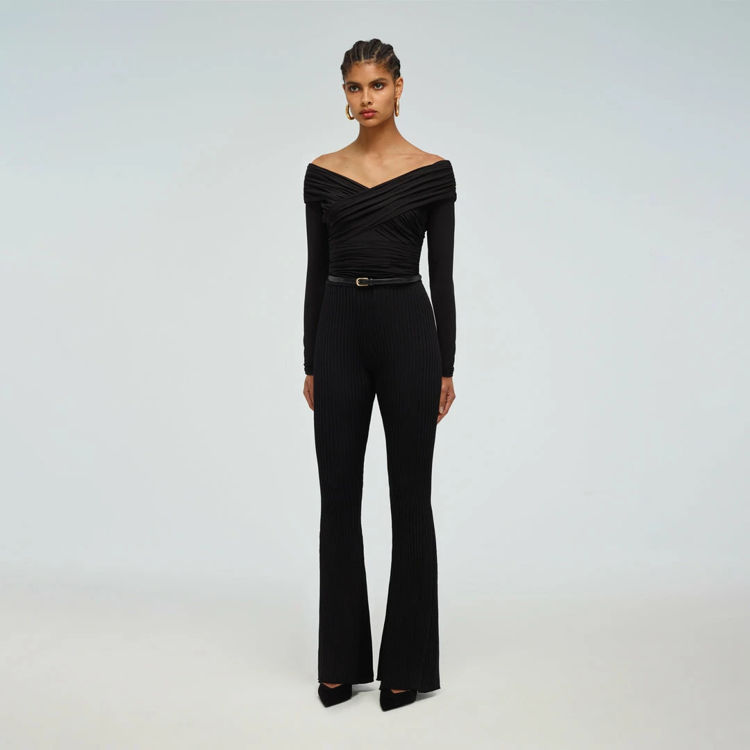This black jersey top features a flattering off shoulder design and a wrap bust detail. It is fitted through the waist with ruching through the body. Check the Size Guide to find your perfect fit.