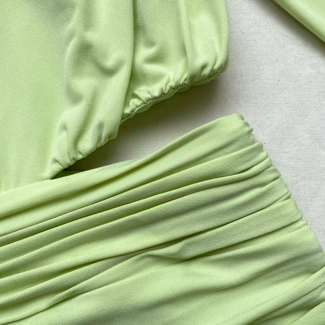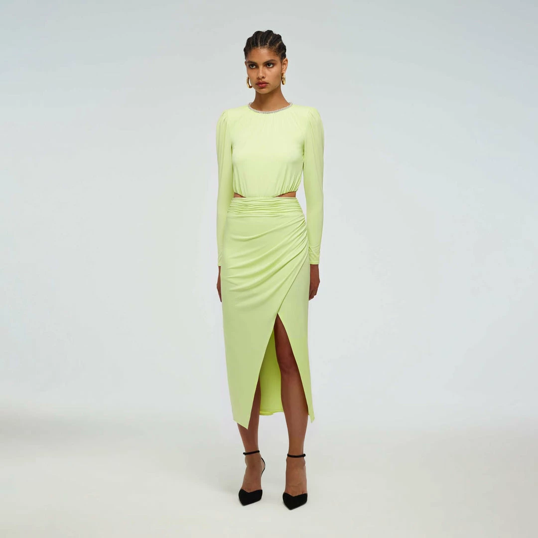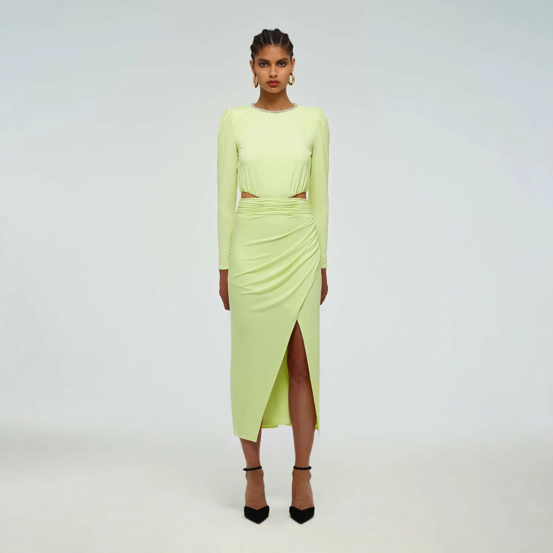 This green midi dress is cut from heavy jersey. It is designed with a diamante trim at the neck and a cut out waist detail. The wrap skirt is gathered and falls to a fitted silhouette. Check the Size Guide to find your perfect fit.