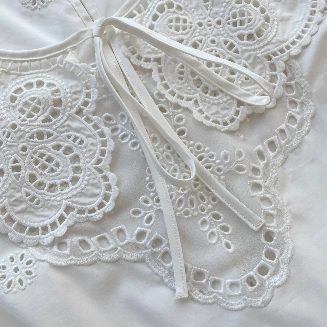 Cut from intricate daisy broderie, this dress is a classic with a twist. Its lace collar ties at the neck, adding a polished touch to a romantic silhouette that ends with a scalloped hem. Keep it interesting with flattering cut-outs at the waist. Dress it down for everyday wear with chunky leather boots, or wear it to an evening get-together with strappy heels and a velvet headband. Check the Size Guide to find your perfect fit.