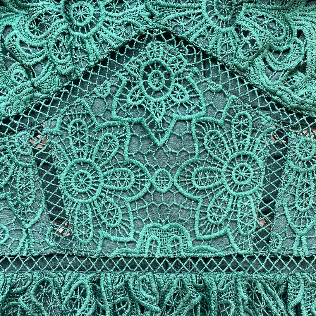 With fabric as enchanting as guipure lace, one can hardly be blamed for wanting to wear it from top to toe. This forest green number was designed with a scallop-edged V neck, fitted bodice and full maxi skirt for an exquisite silhouette. Consider it a new go-to for holiday parties, weddings and the opera, finished off with classic pumps and statement earrings. Check the Size Guide to find your perfect fit.