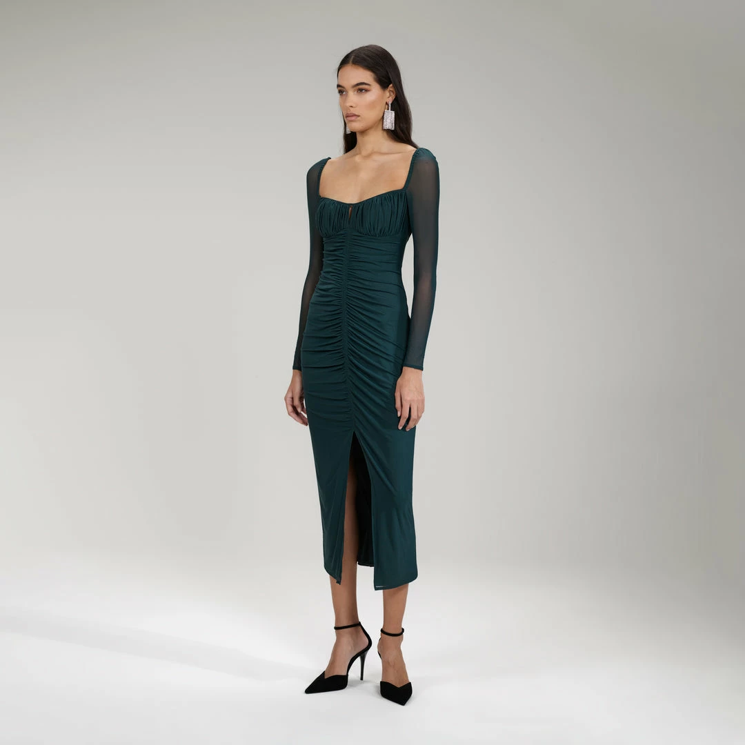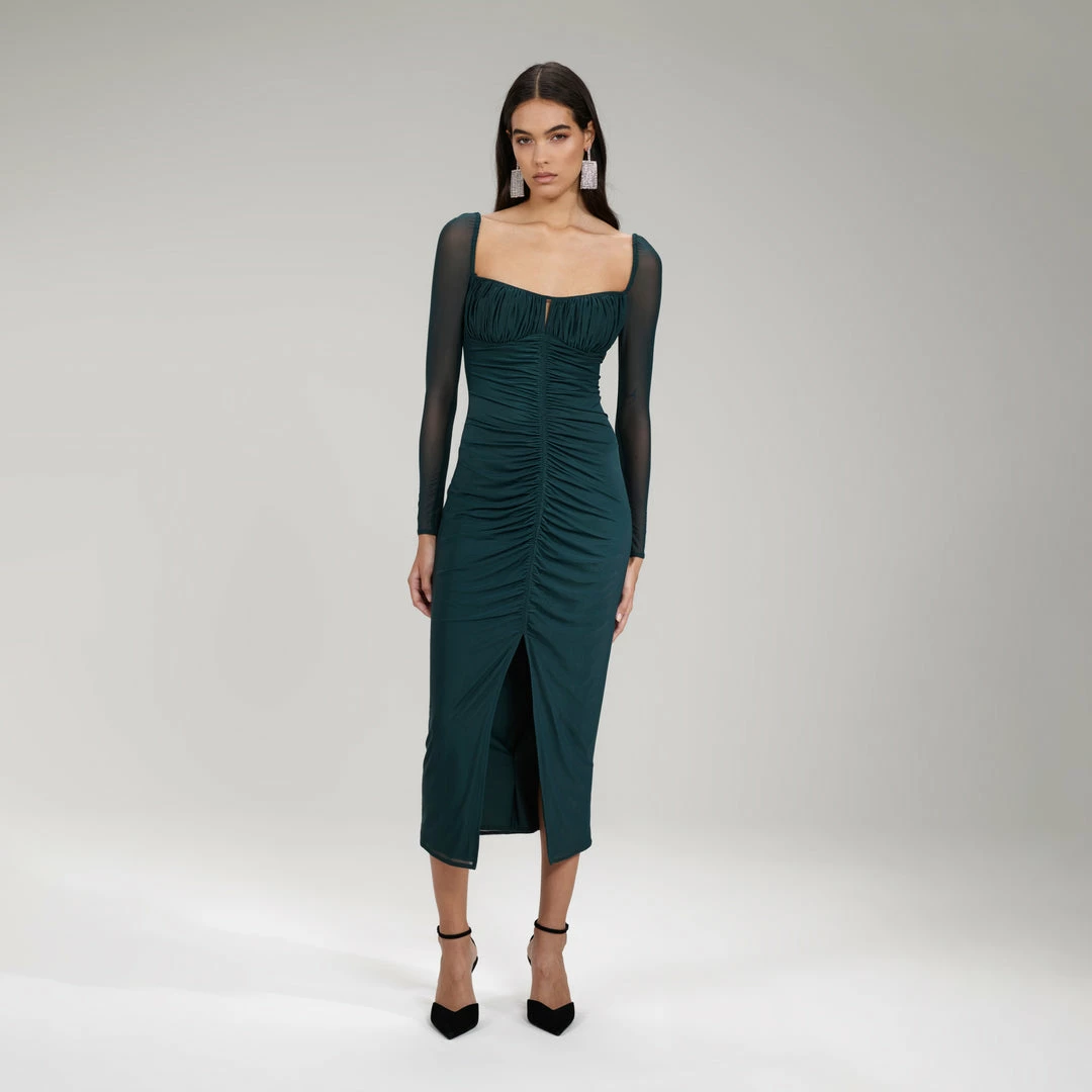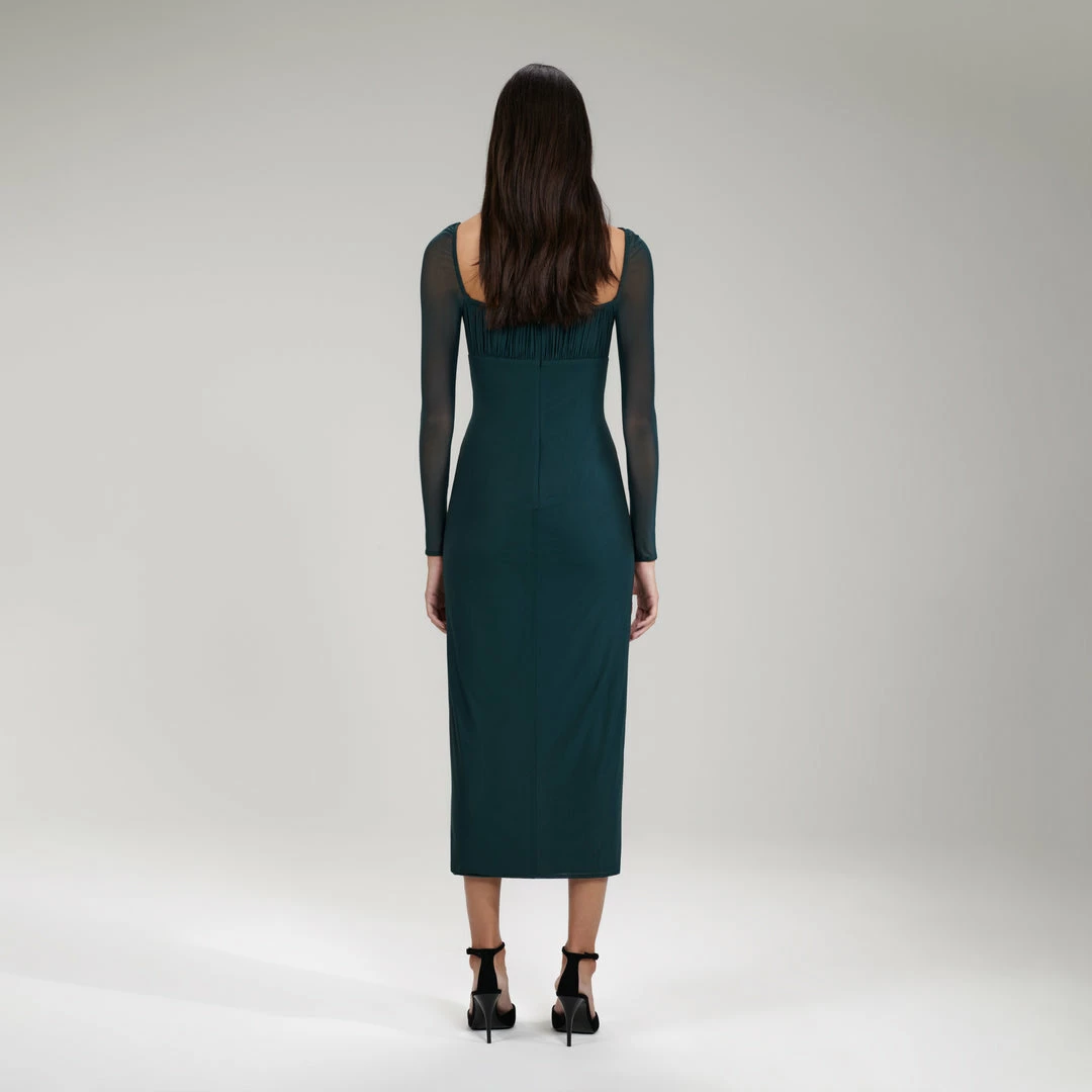 Self-portrait Dark Green Powermesh Ruched Midi Dress NEW ARRIVALS