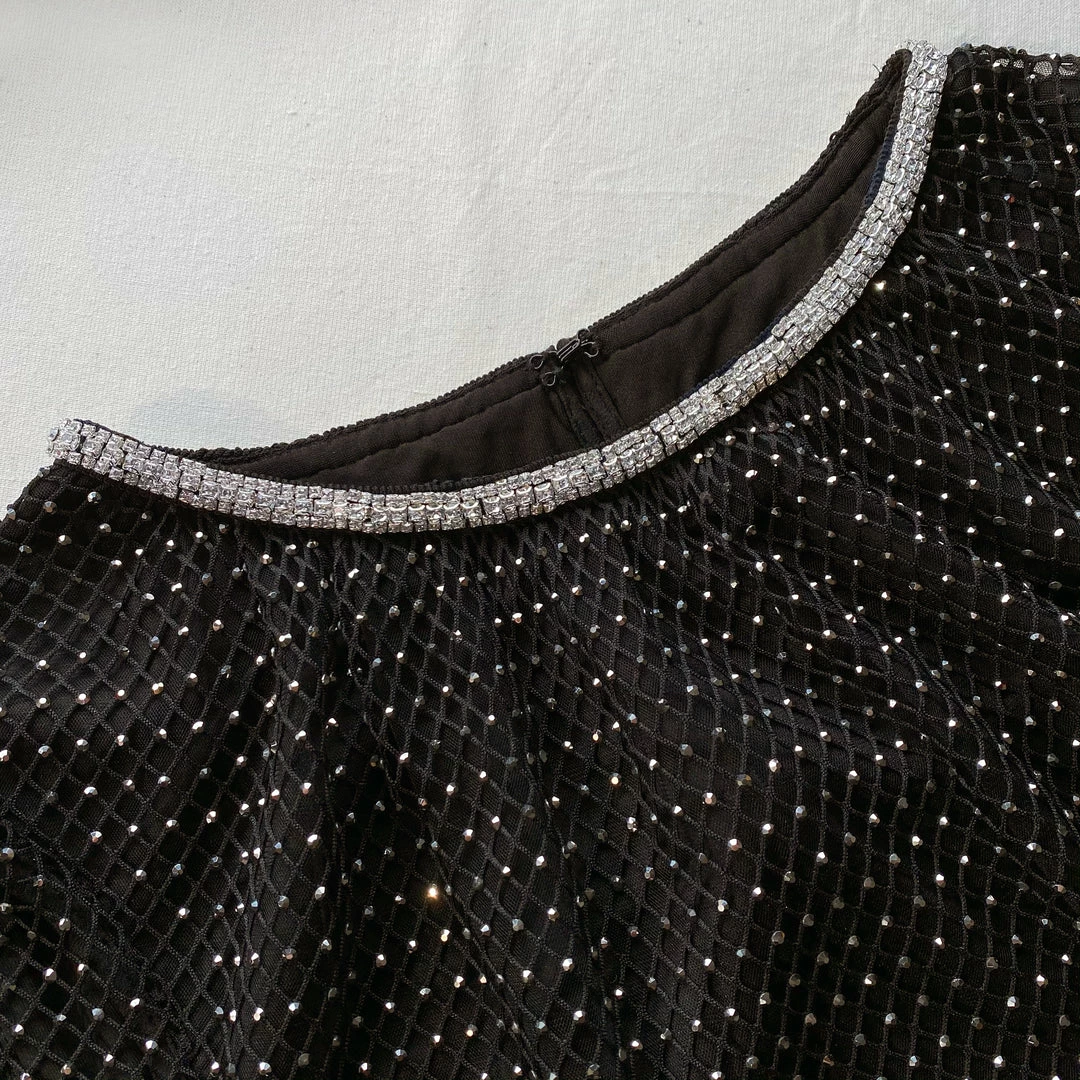 Cut from dazzling diamanté fishnet, this dress’ sleek silhouette makes it the picture of futuristic femininity. Its clean lines are emphasised with a diamanté trim at the neck and cut-outs at the waist which show off your figure. A gathered wrap skirt falls to a fitted midi length — perfect for pairing with statement heels for your next big night on the town.