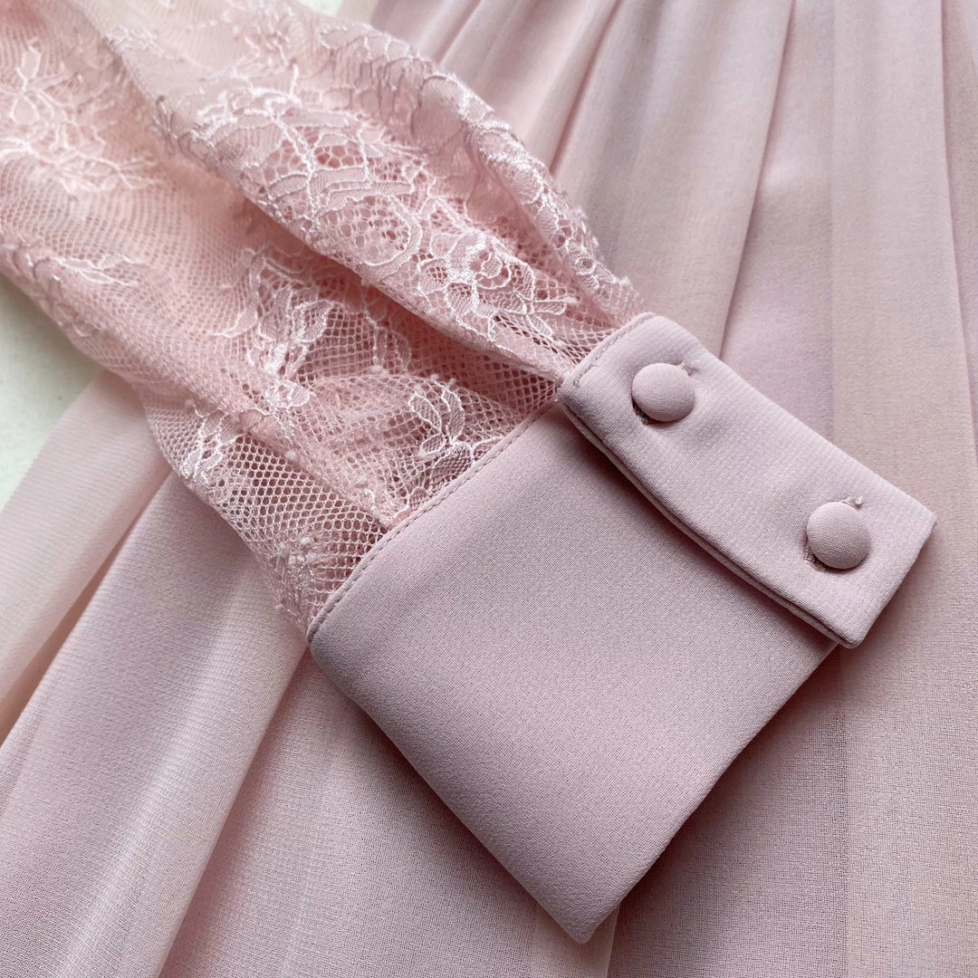 This dusty pink chiffon maxi dress is designed with a lace trim bib framed with fine pleats. The high neck is finished with a delicate tie and the sleeves are cut from fine lace. The skirt is gathered at the waist and falls to maxi length with broderie on the hem. Check the Size Guide to find your perfect fit.