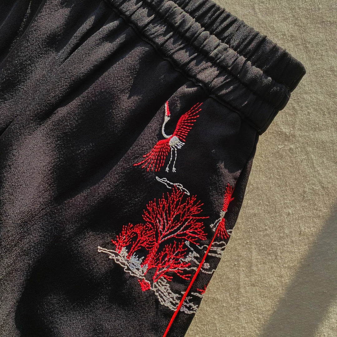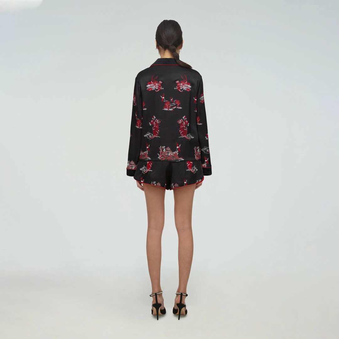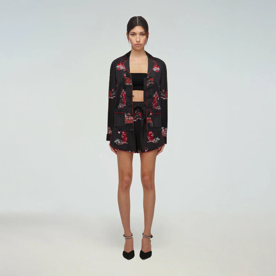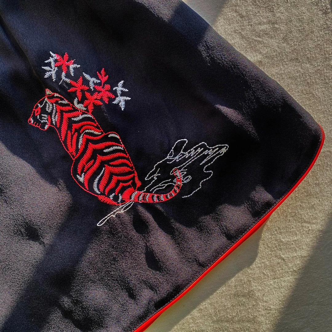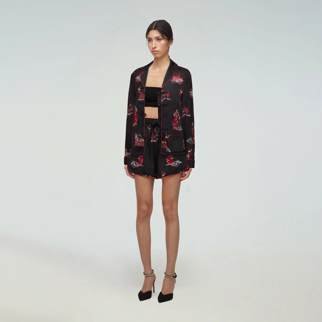 These shorts are cut from embroidered viscose. They feature a traditional chinese embroidery design and are finished with contrast piping. Check the Size Guide to find your perfect fit.