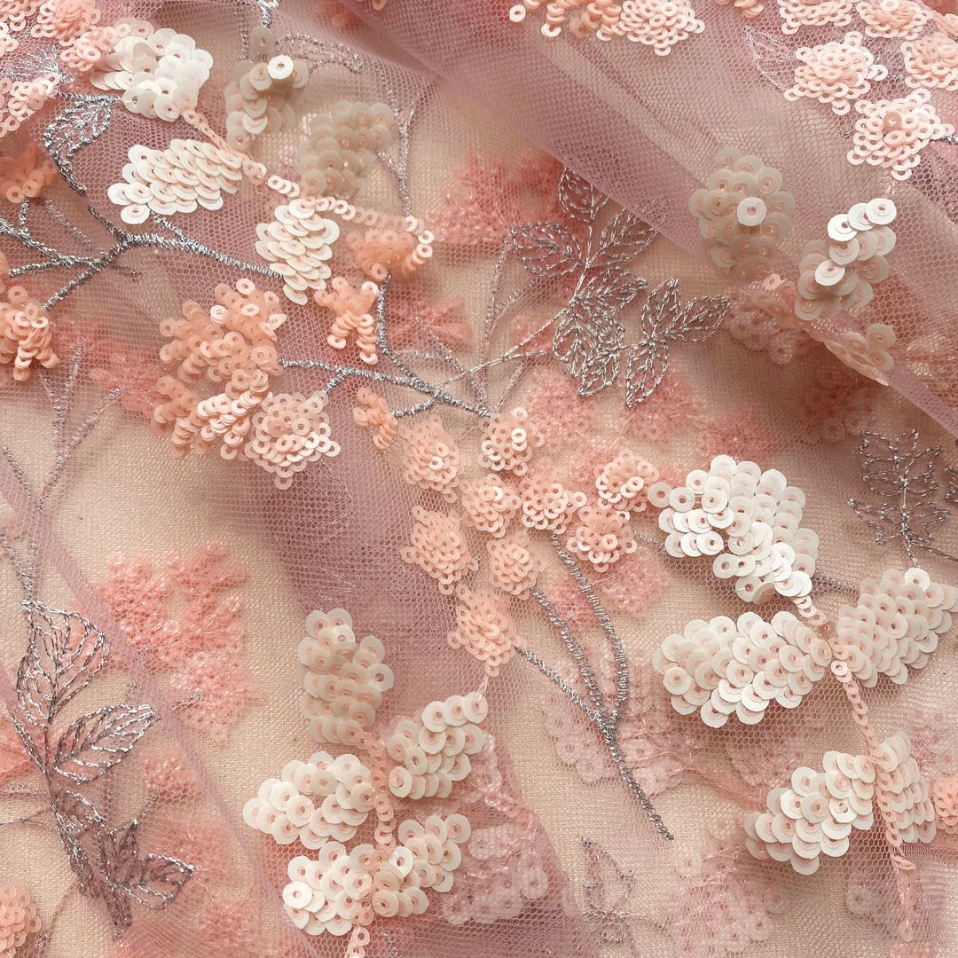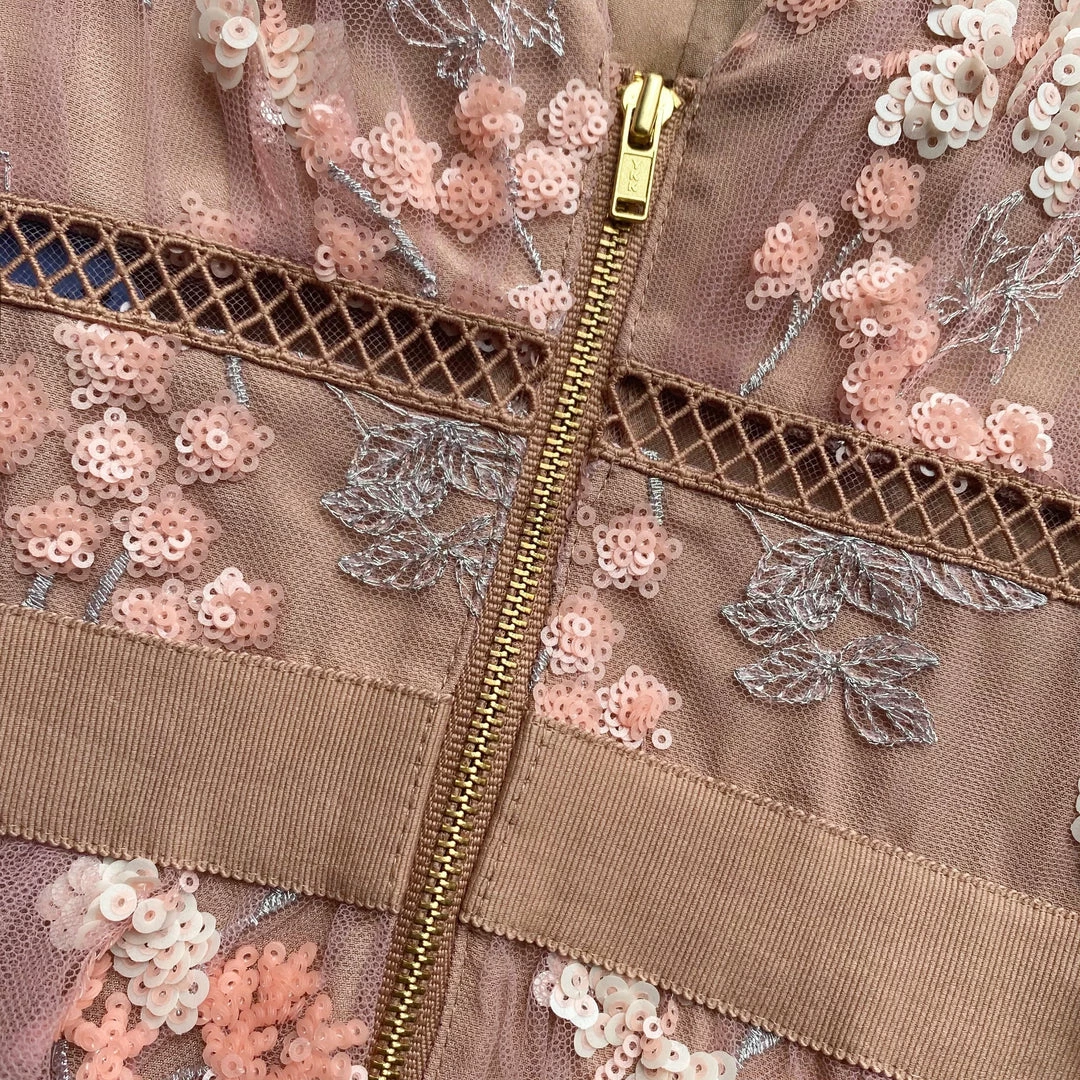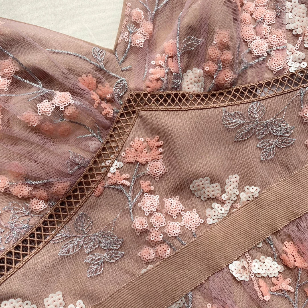 Cut from pink floral mesh embellishment this dress is designed with a v-neckline, elastic grosgrain waistband and falls to a tiered midi skirt. This style is lined. Check the Size Guide to find your perfect fit.