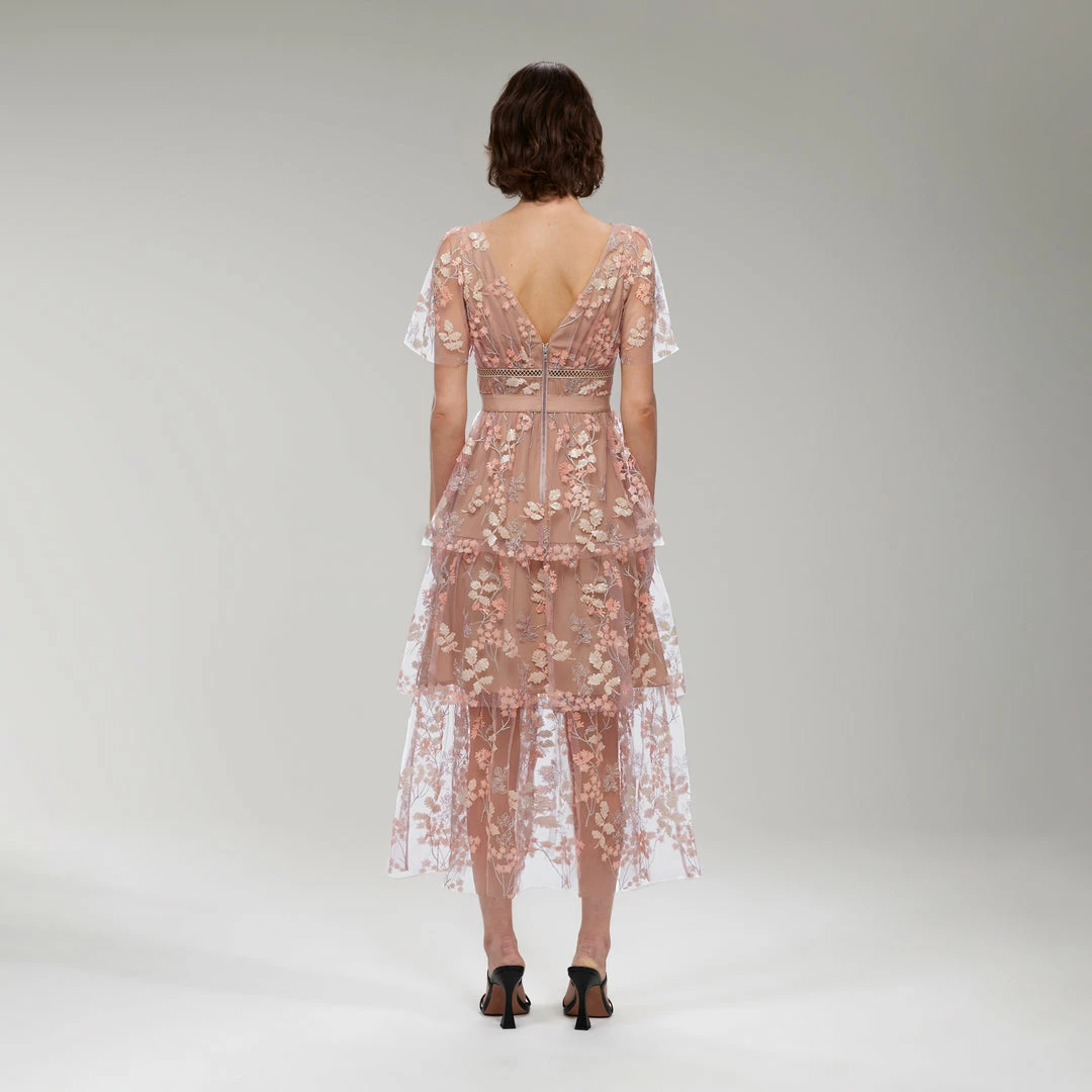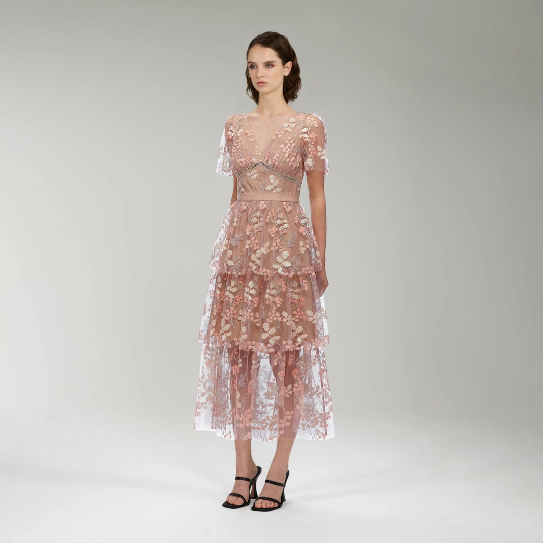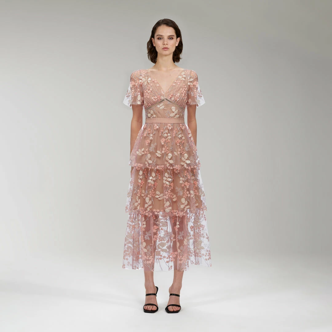 Self-portrait Flower Mesh Tiered Midi Dress READY TO WEAR