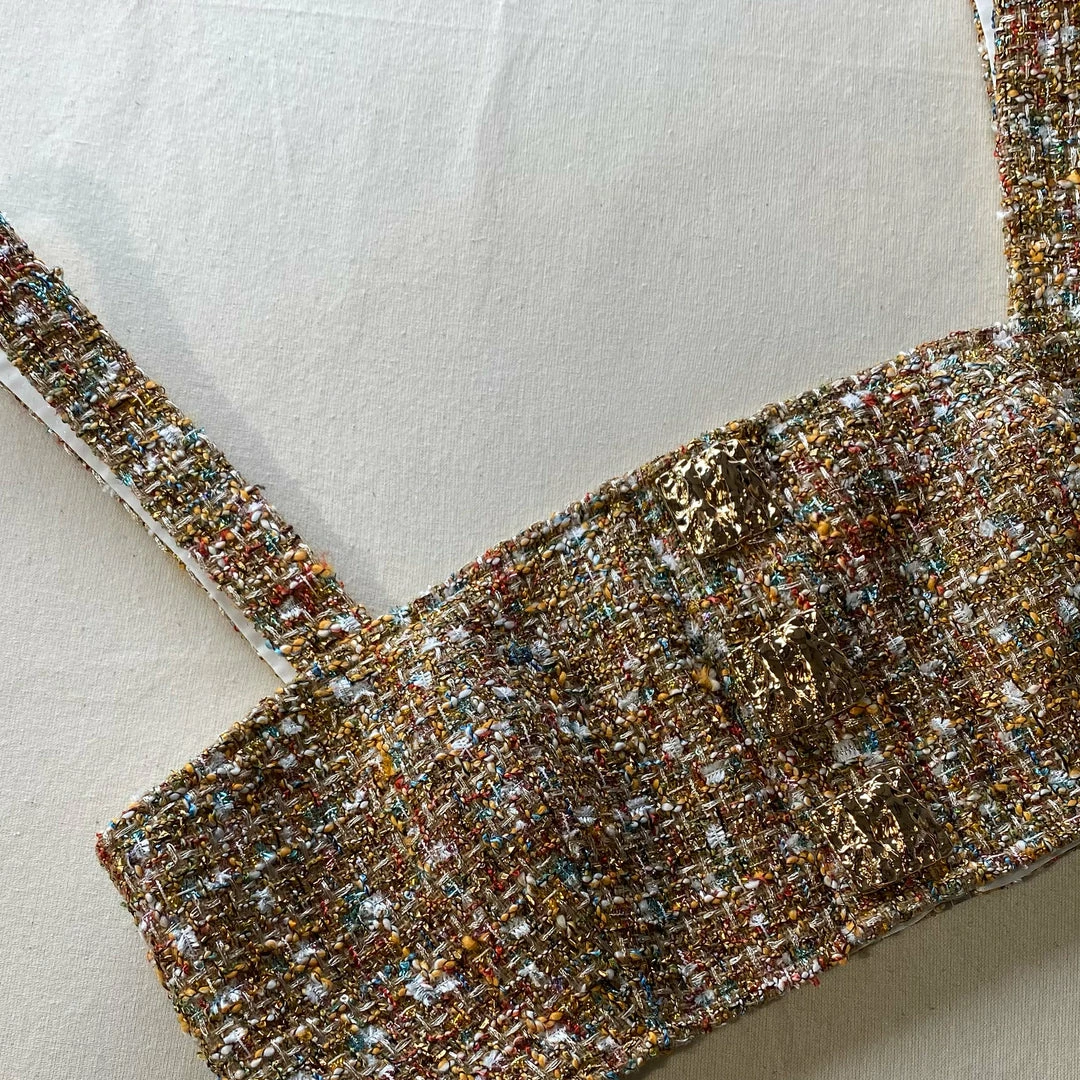Dripping in gleaming gold tinsee, this bouclé cropped top is a guaranteed showstopper. Its flattering square neckline and thick straps spotlight the shoulders and décolletage, while its length make it the perfect pairing with high-waisted trousers, midi skirts and minis. Throw on a pair of platforms, and you’re sorted for a night full of compliments.