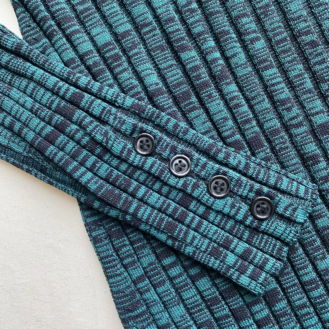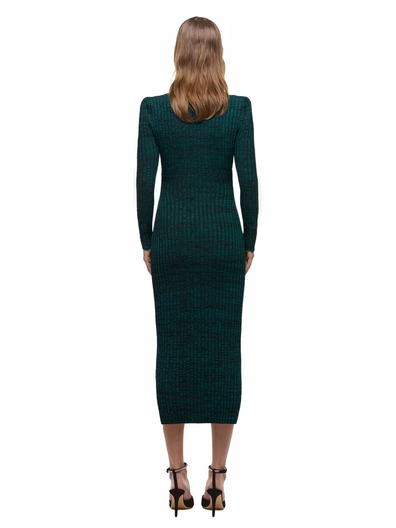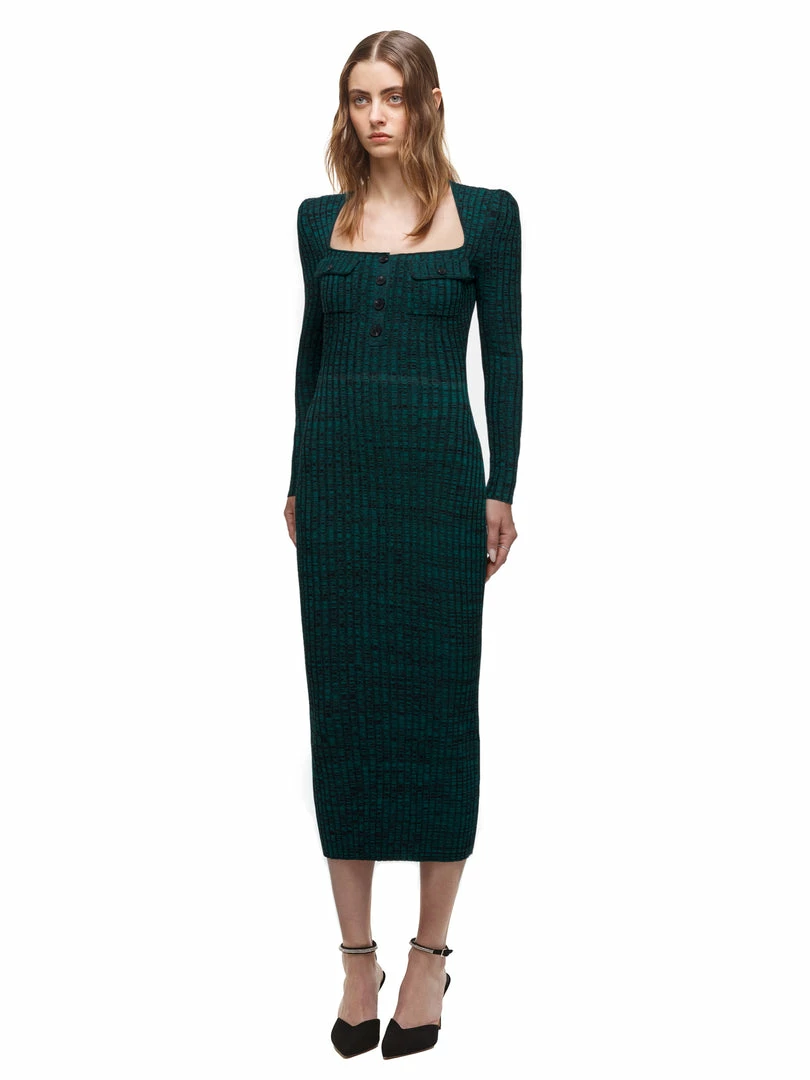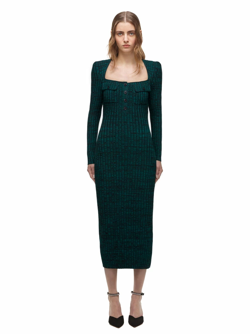 This midi dress is cut from green and black space dye knit. It is designed with a flattering square neck and buttons at the from bodice. It is fitted to a slim silhouette and falls to midi length. Check the Size Guide to find your perfect fit.