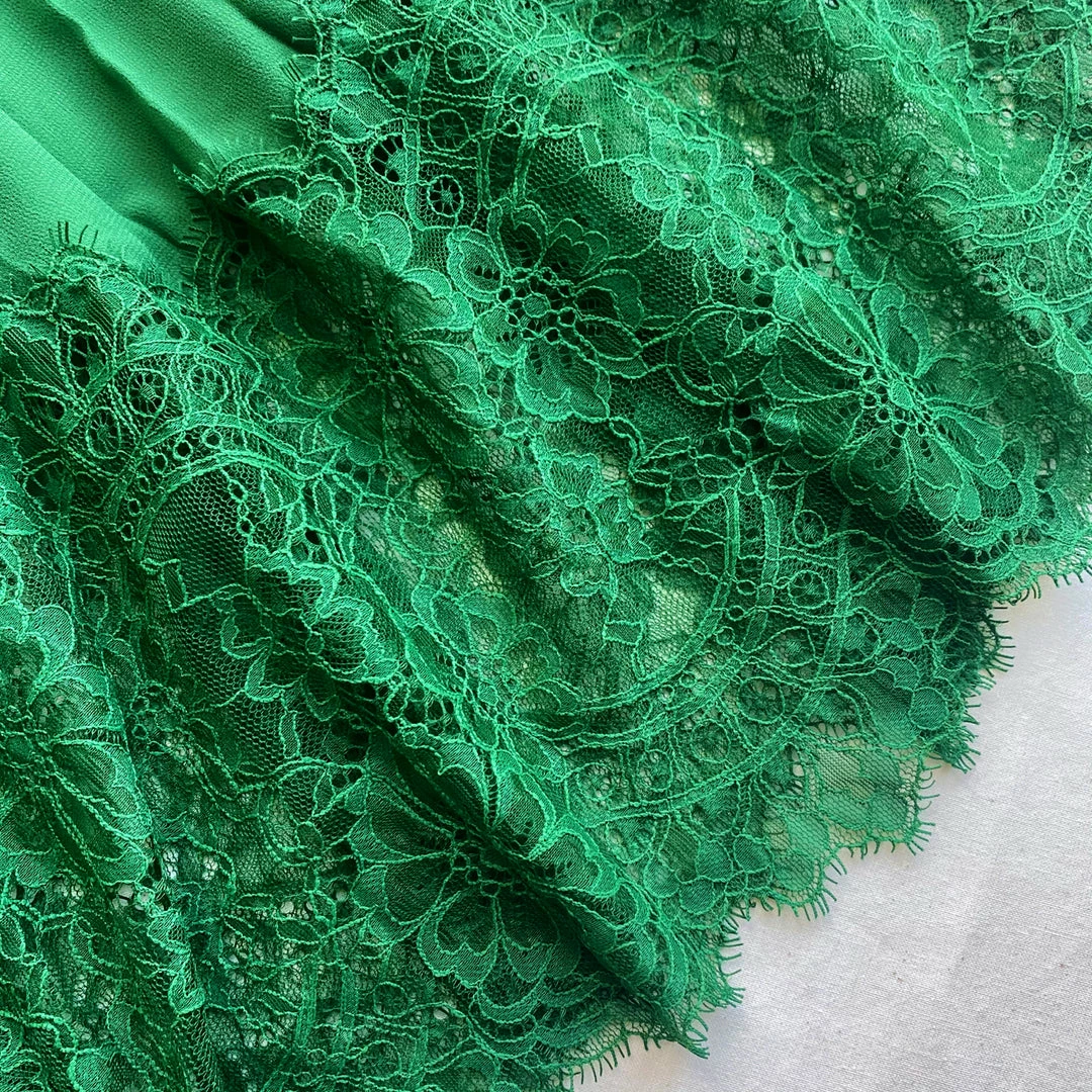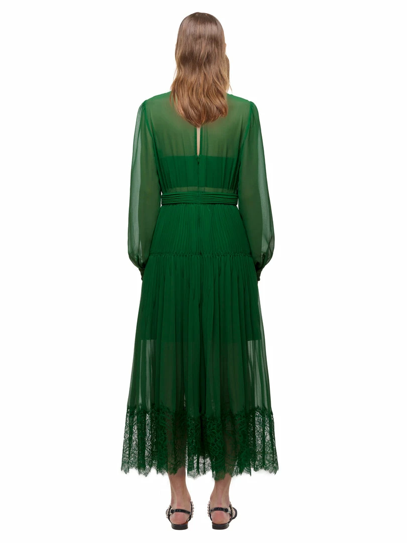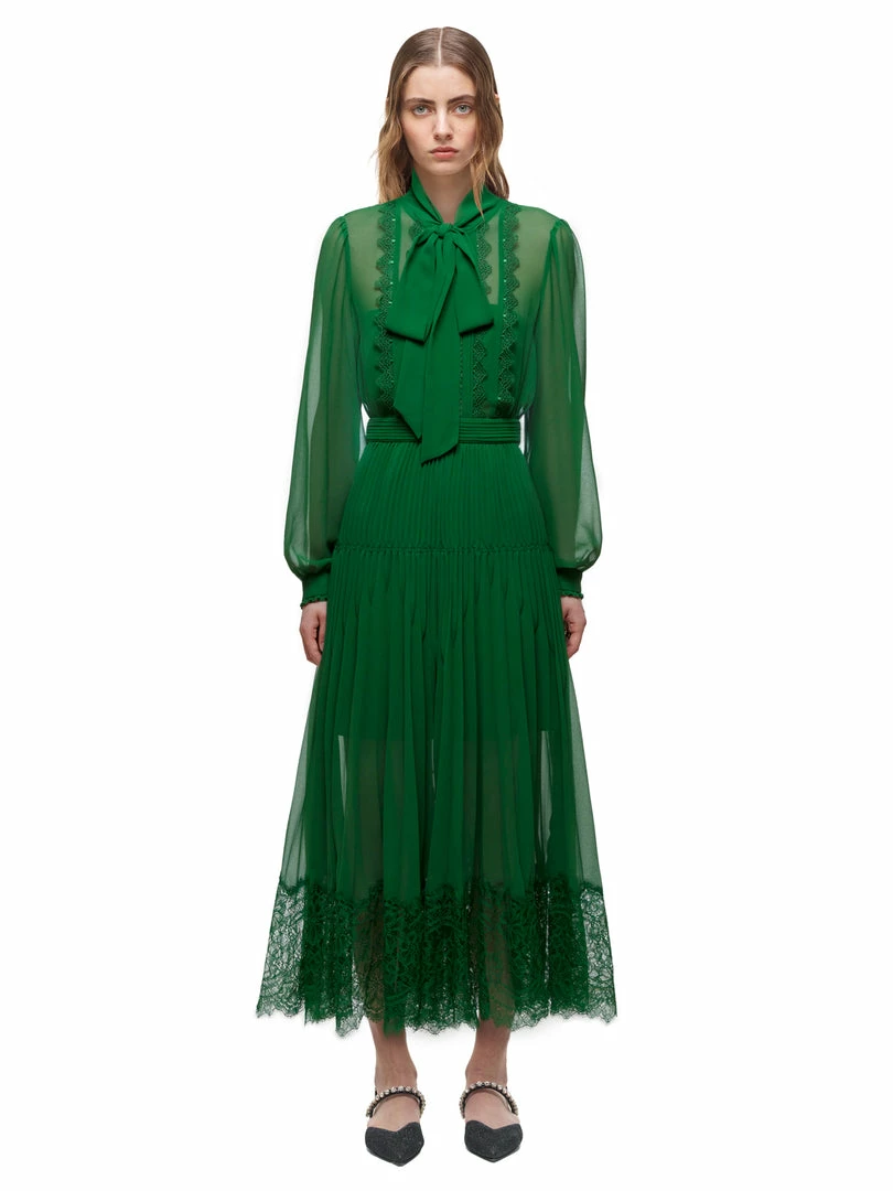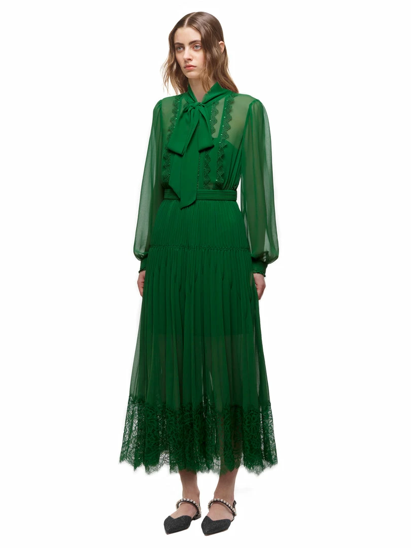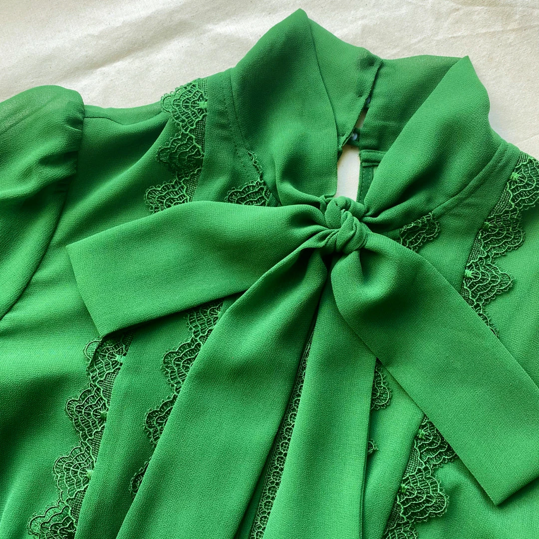 This fit and flare dress is cut from green chiffon. The style is designed with a flattering pussy bow and features tonal lace trims throughout.