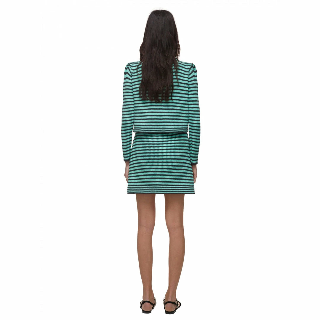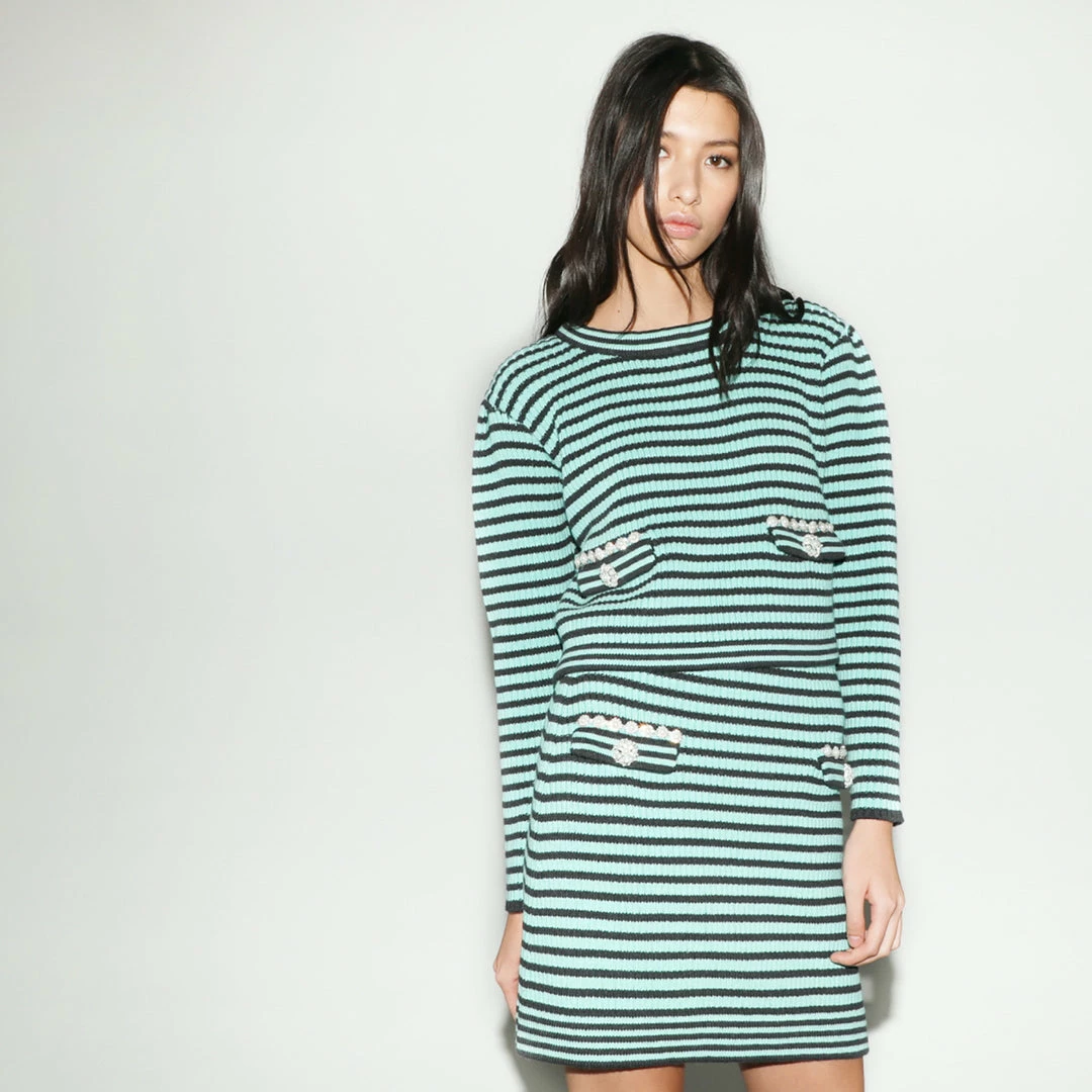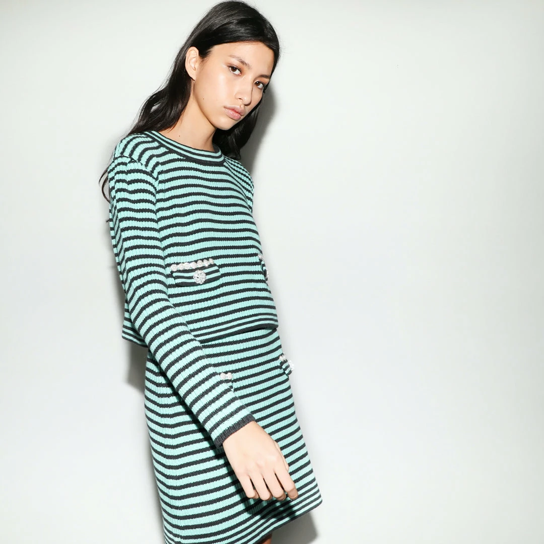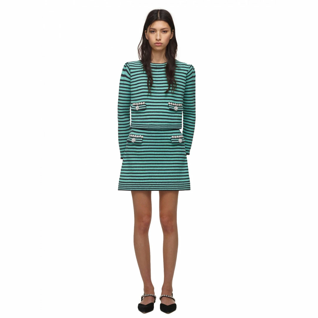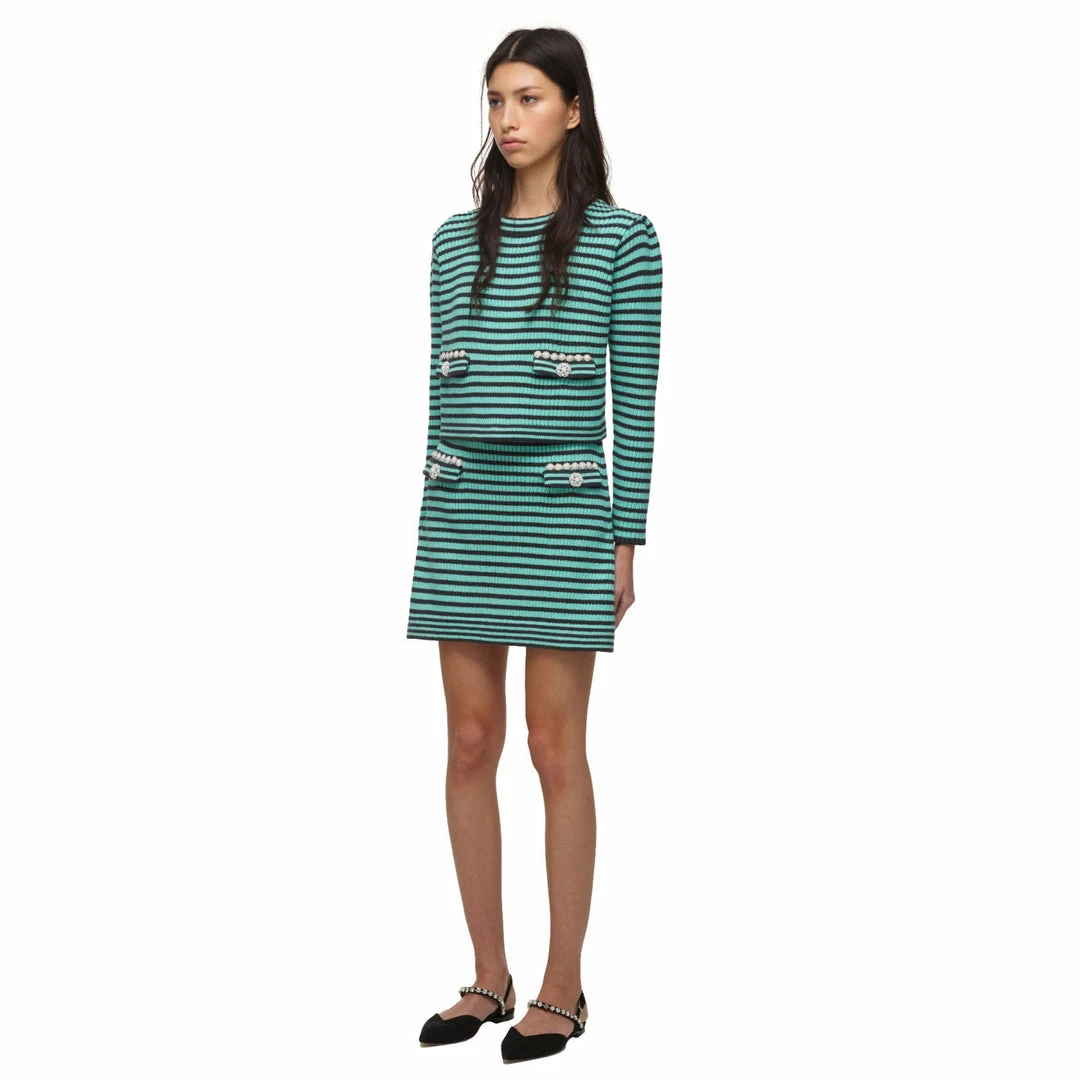 This green melange knit mini skirt is designed with a slim fitting silhouette. It features front pockets finished with diamante trims. Check the Size Guide to find your perfect fit.
