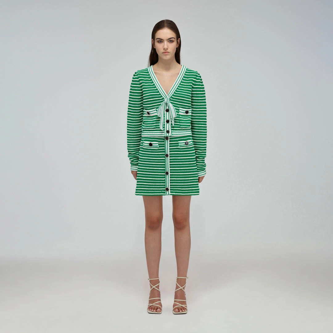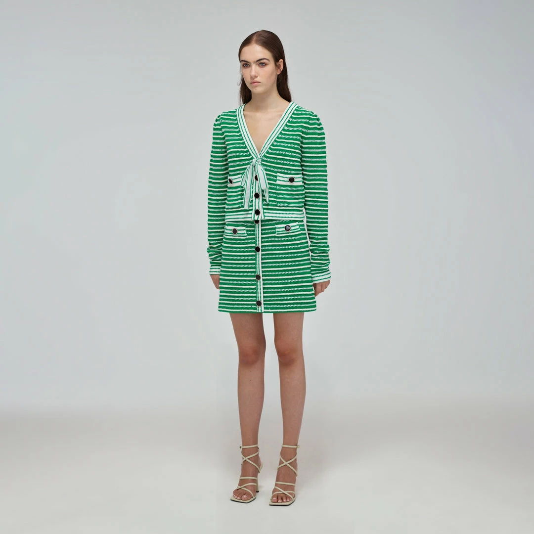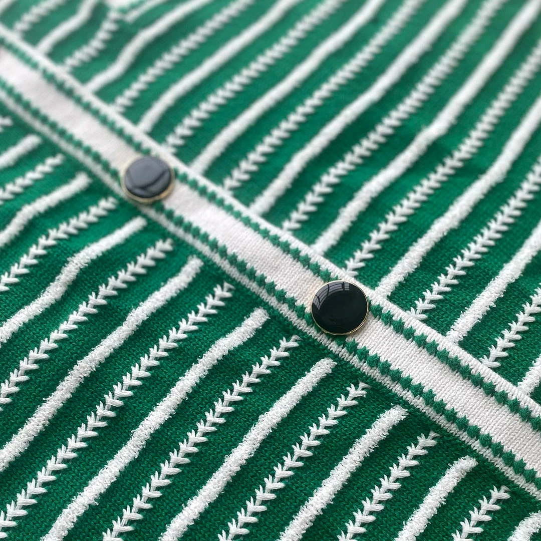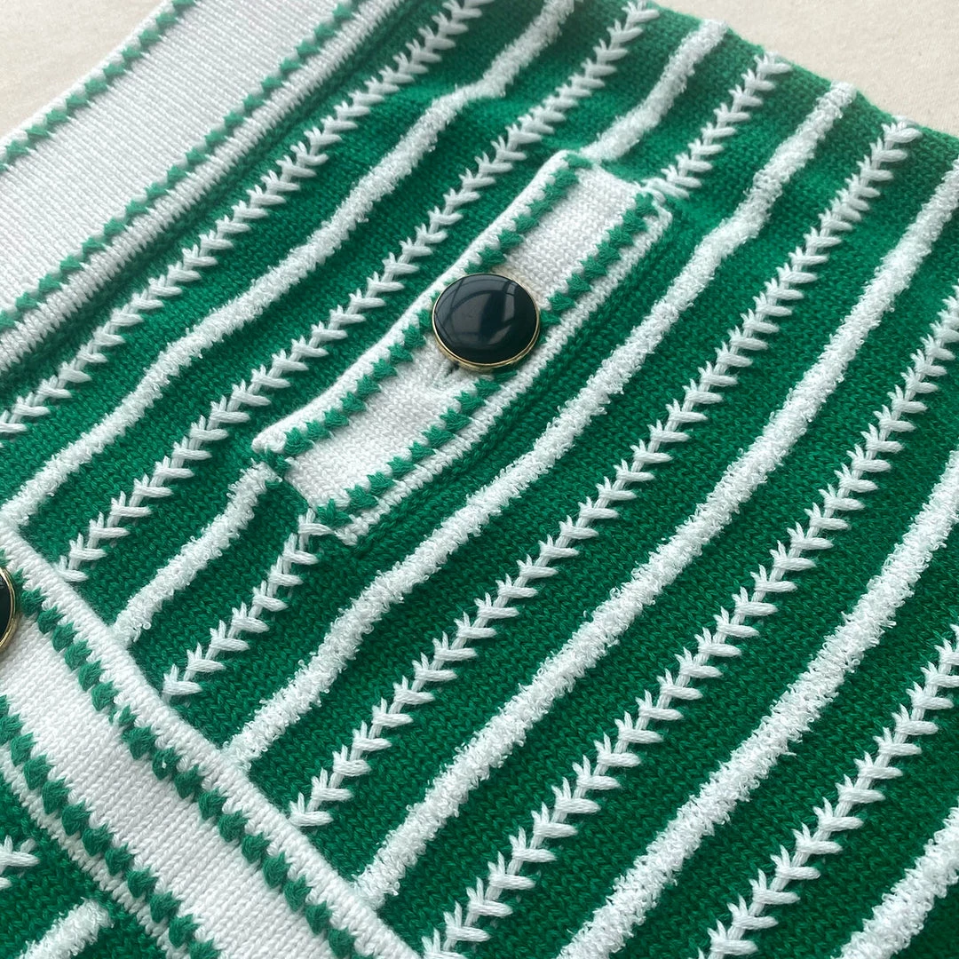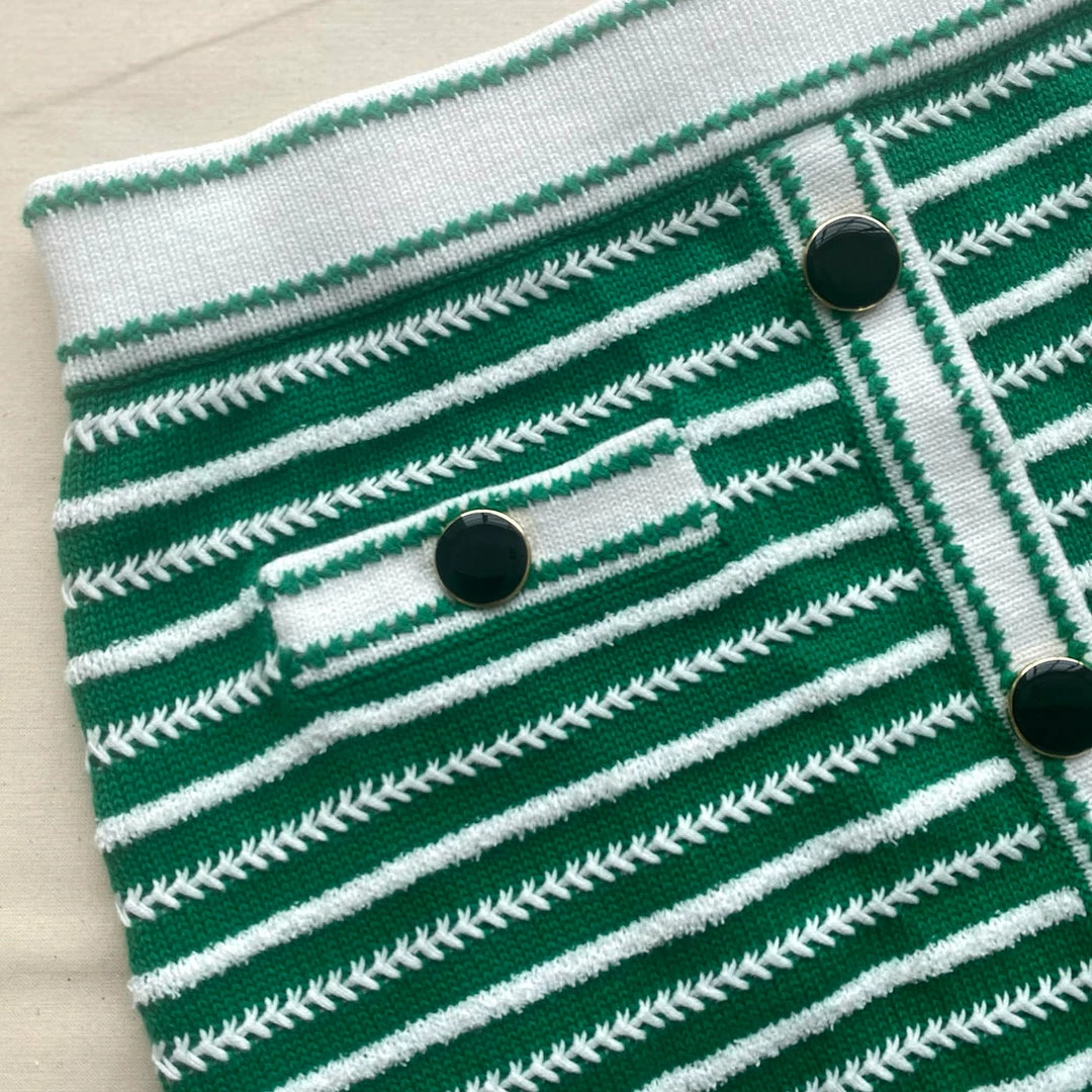 This green and white rope knit skirt is designed with front pockets finished with black buttons. Check the Size Guide to find your perfect fit.