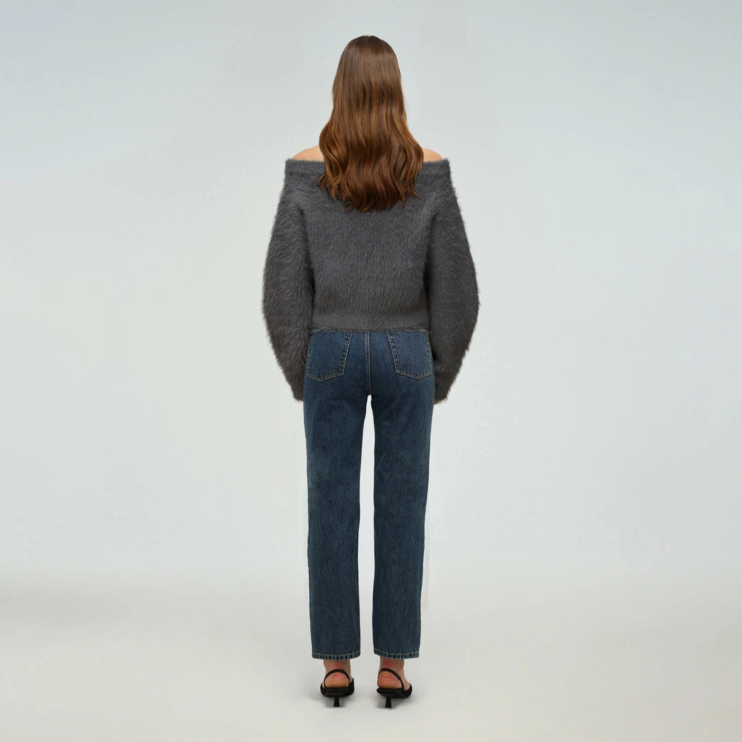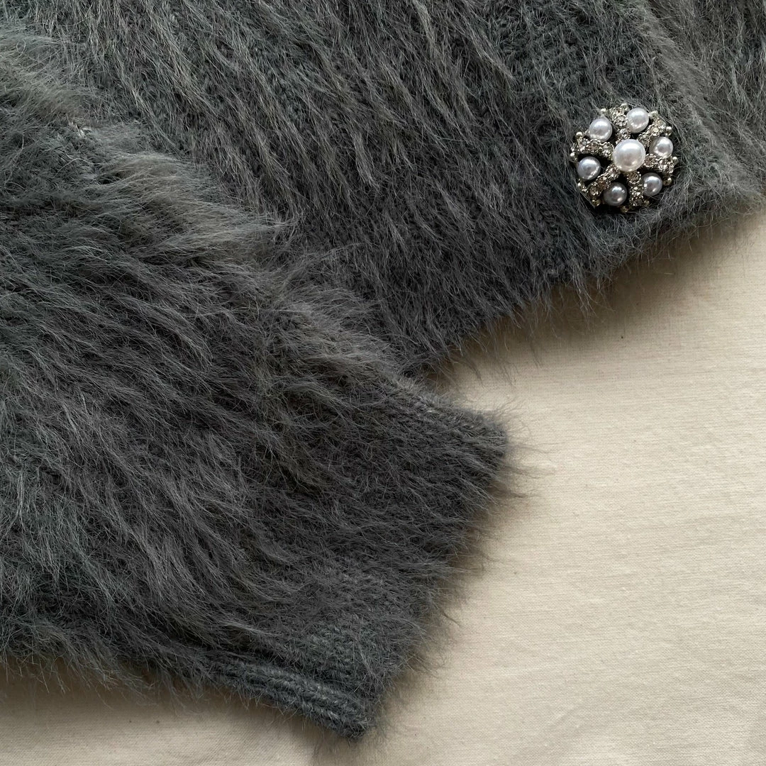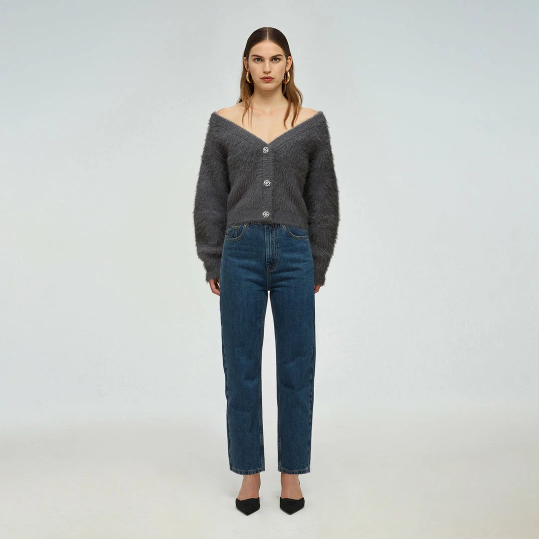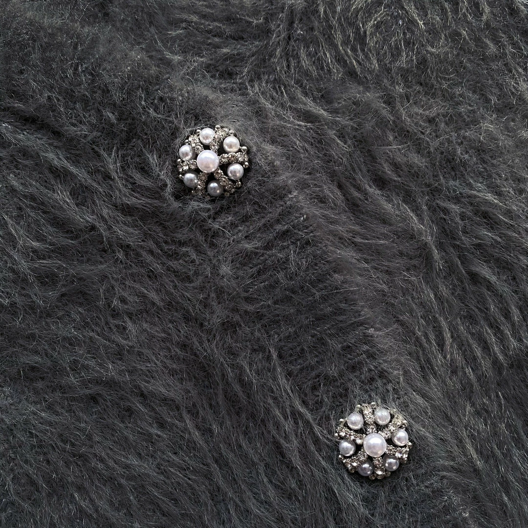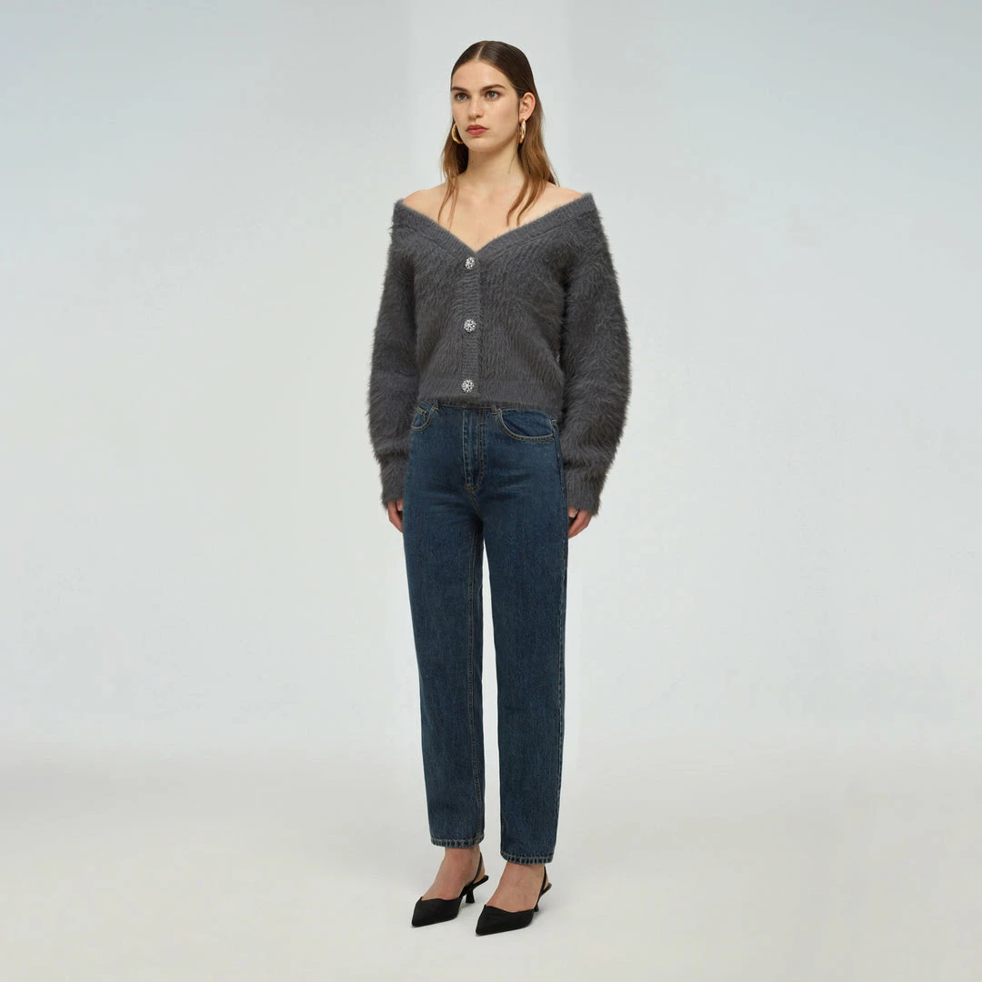 This grey fluffy cardigan is designed with an off shoulder neckline. It is finished with covered buttons. Check the Size Guide to find your perfect fit.