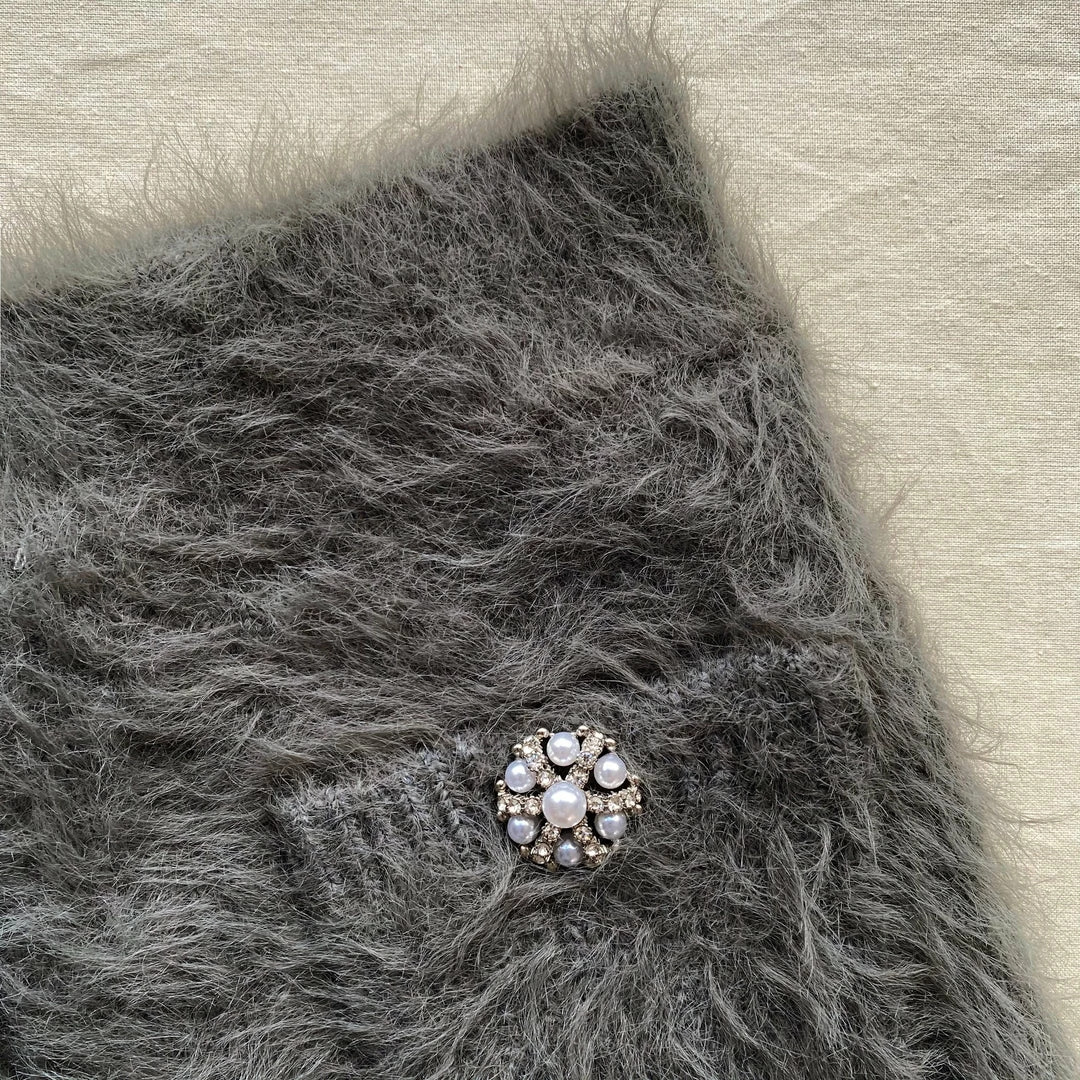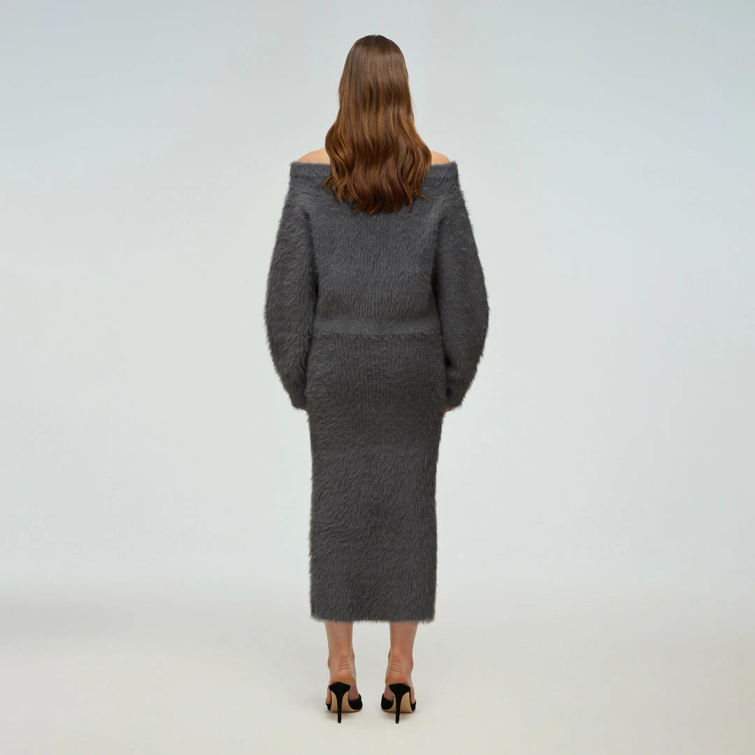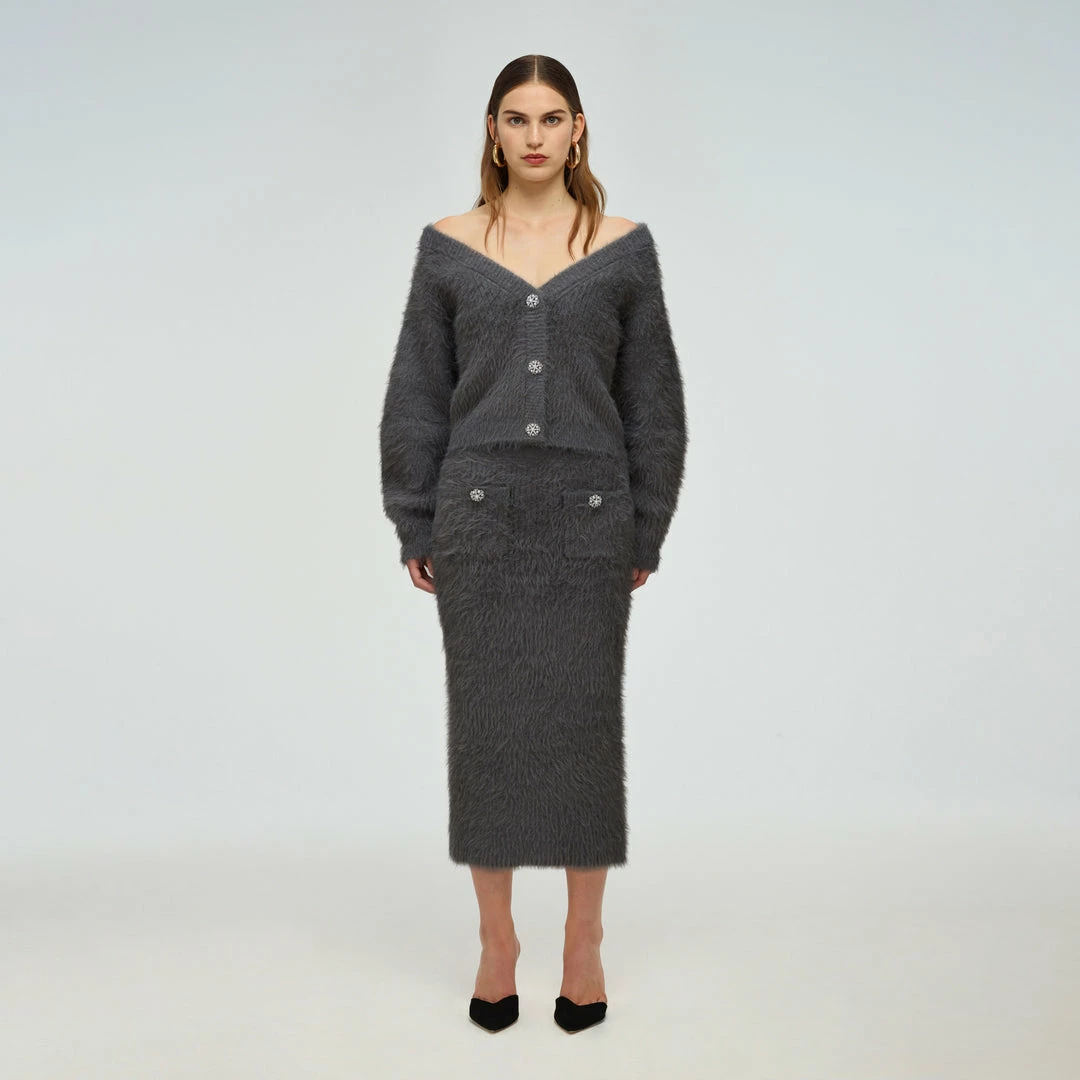 This grey fluffy knit midi skirt features front patch pockets finished with covered buttons. The fitted skirt silhouette sculpts the body and falls to a midi length. Check the Size Guide to find your perfect fit.