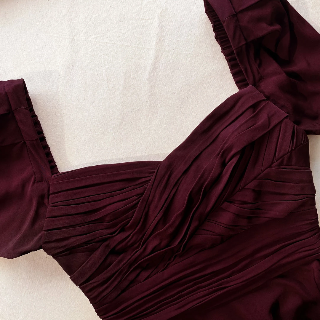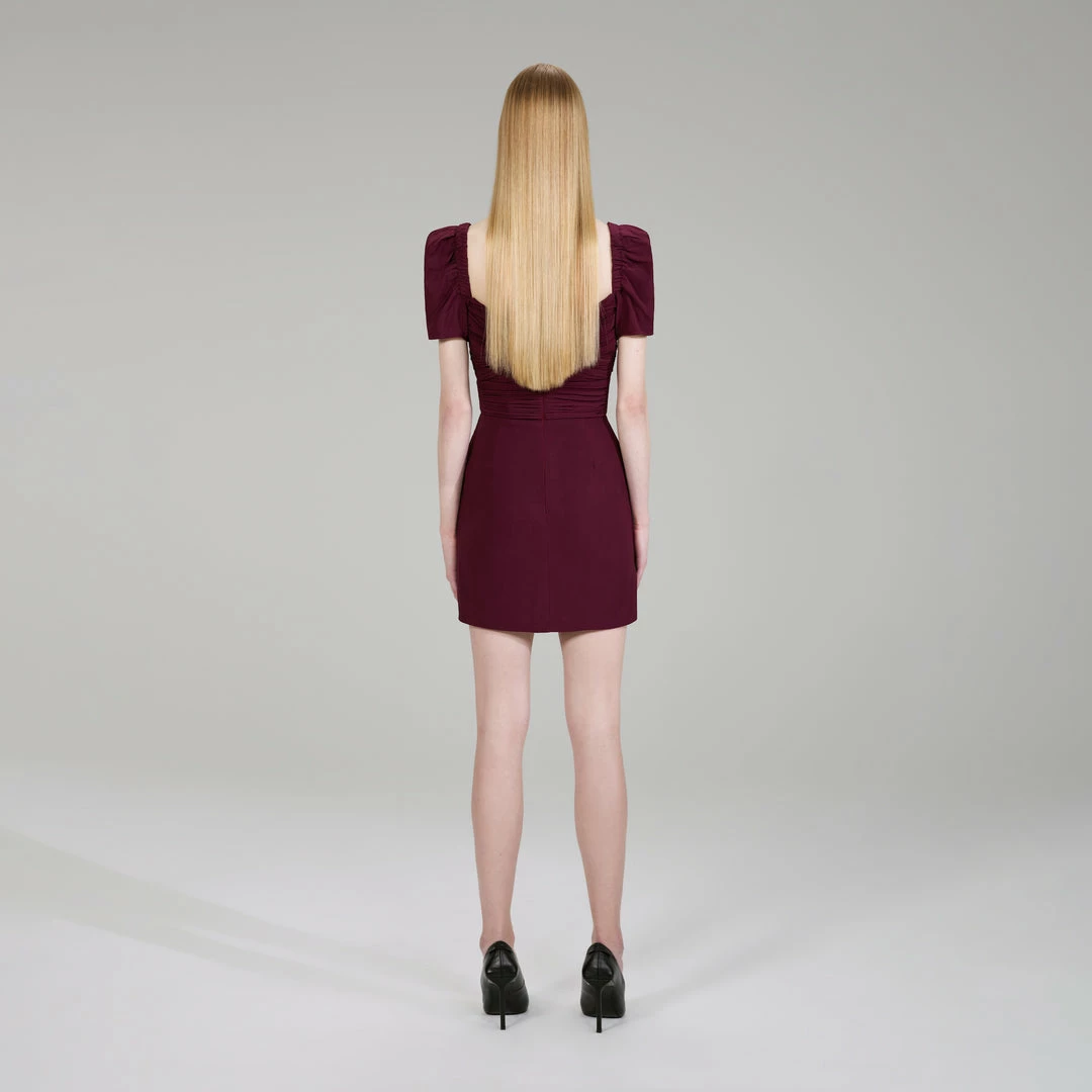This magenta stretch crepe mini dress is designed with a flattering sweetheart neckline and a gathered wrap bust detail. The skirt falls to a fitted silhouette finished with a side split.