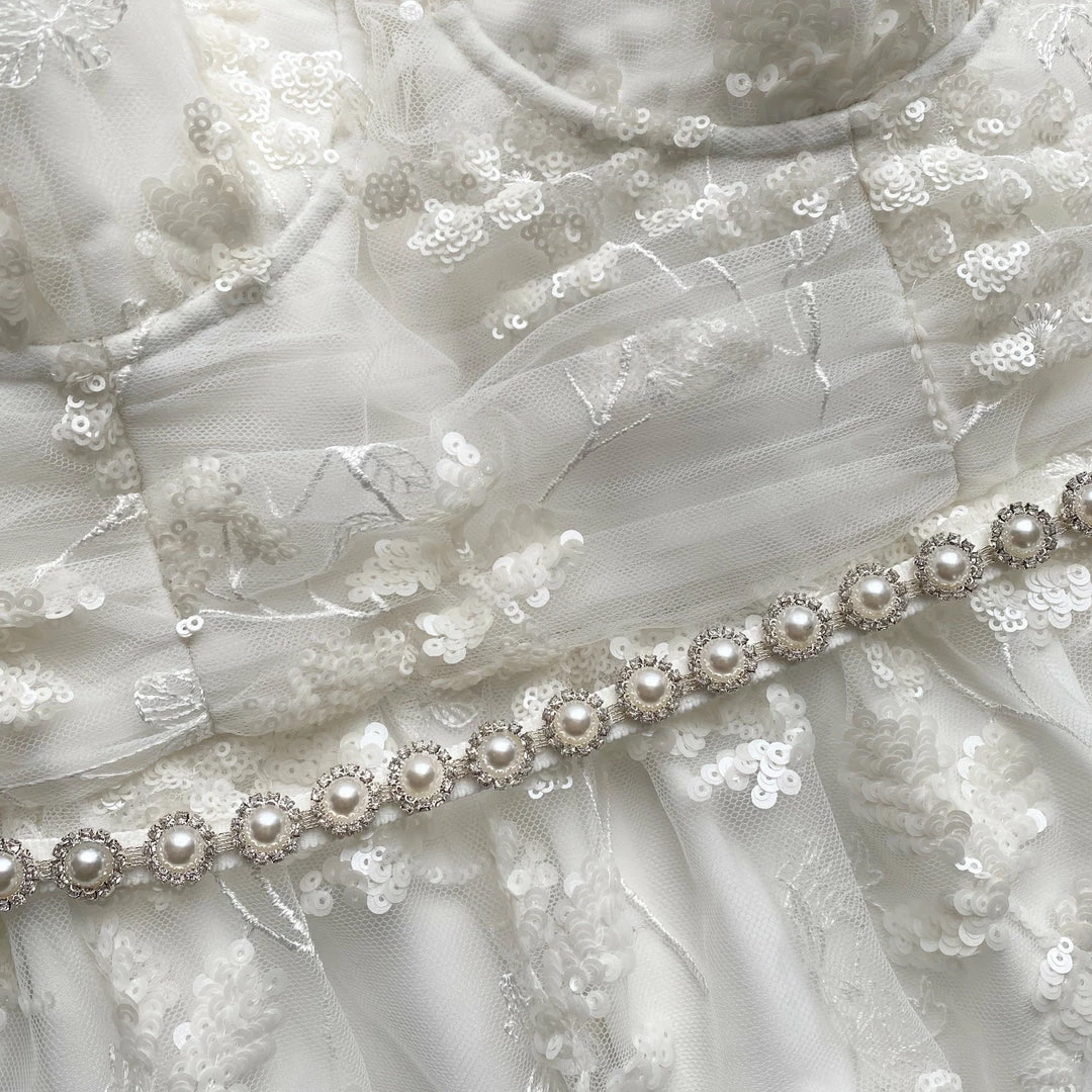 This maxi dress is cut from ivory sequin blossom sequin. It is designed with a twist neck detail and subtle puff sleeves. It is fitted at the waist with a pearl and diamanté trim and falls to a tiered maxi skirt. Check the Size Guide to find your perfect fit.