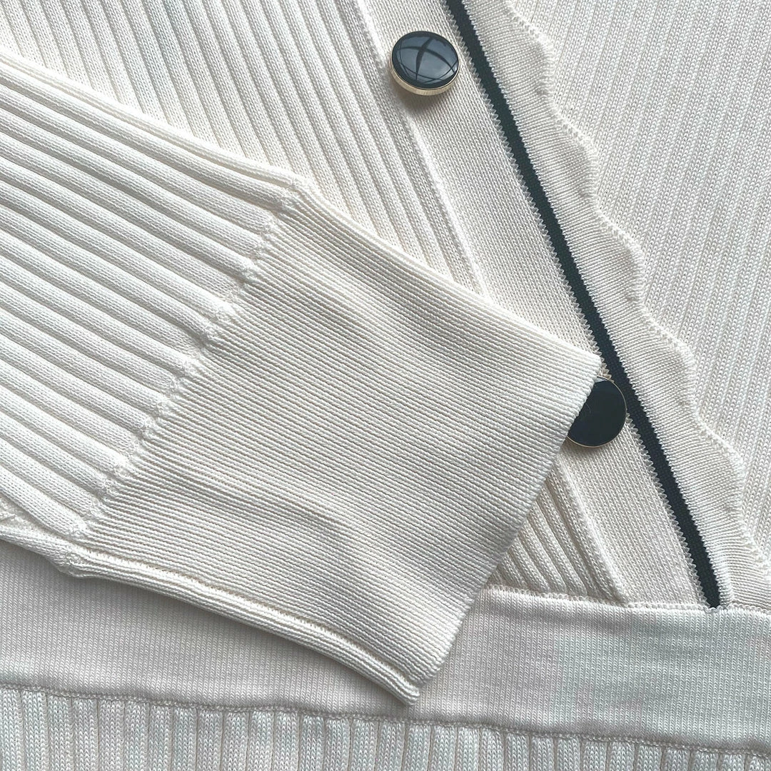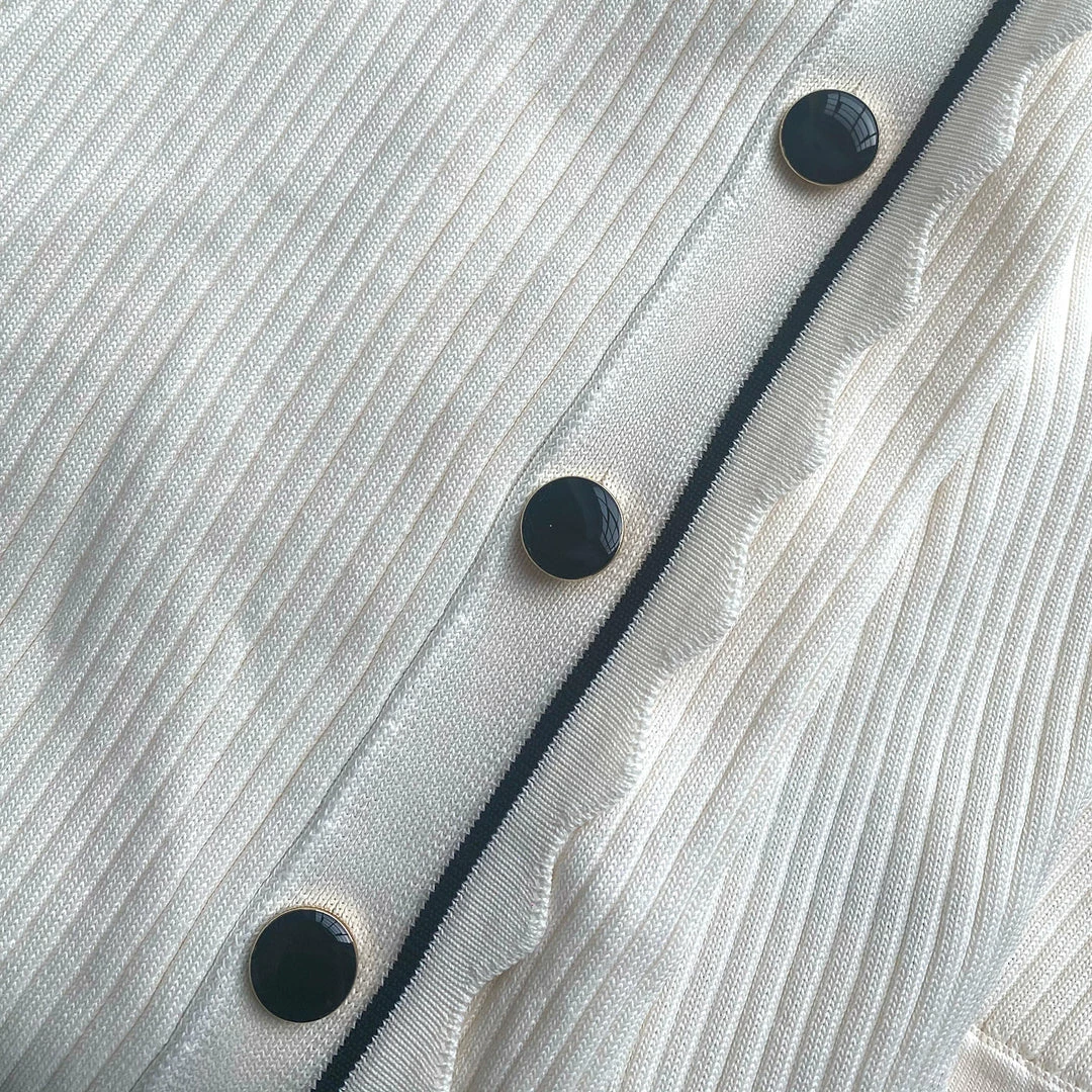 This cream contrast yarn knit jumper is designed with and collar and open neck finished with a braid trim. It features patch pockets with black enamel buttons. Check the Size Guide to find your perfect fit.