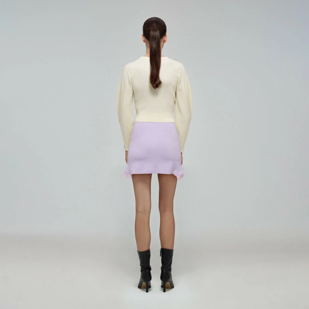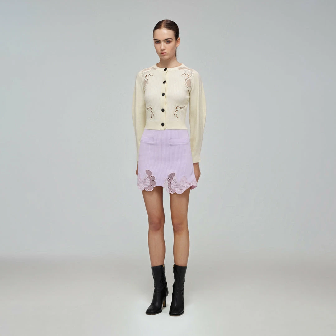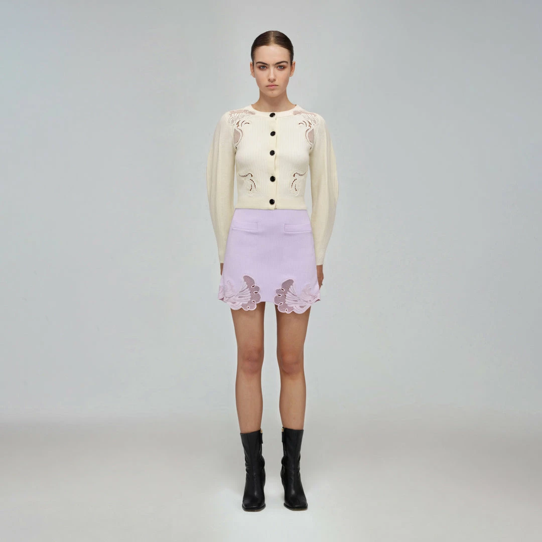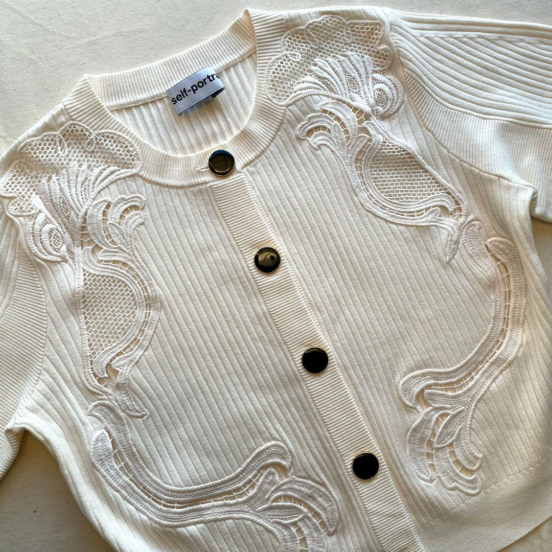 Self-portrait Ivory Inserted Lace Ribbed Knit Cardigan READY TO WEAR