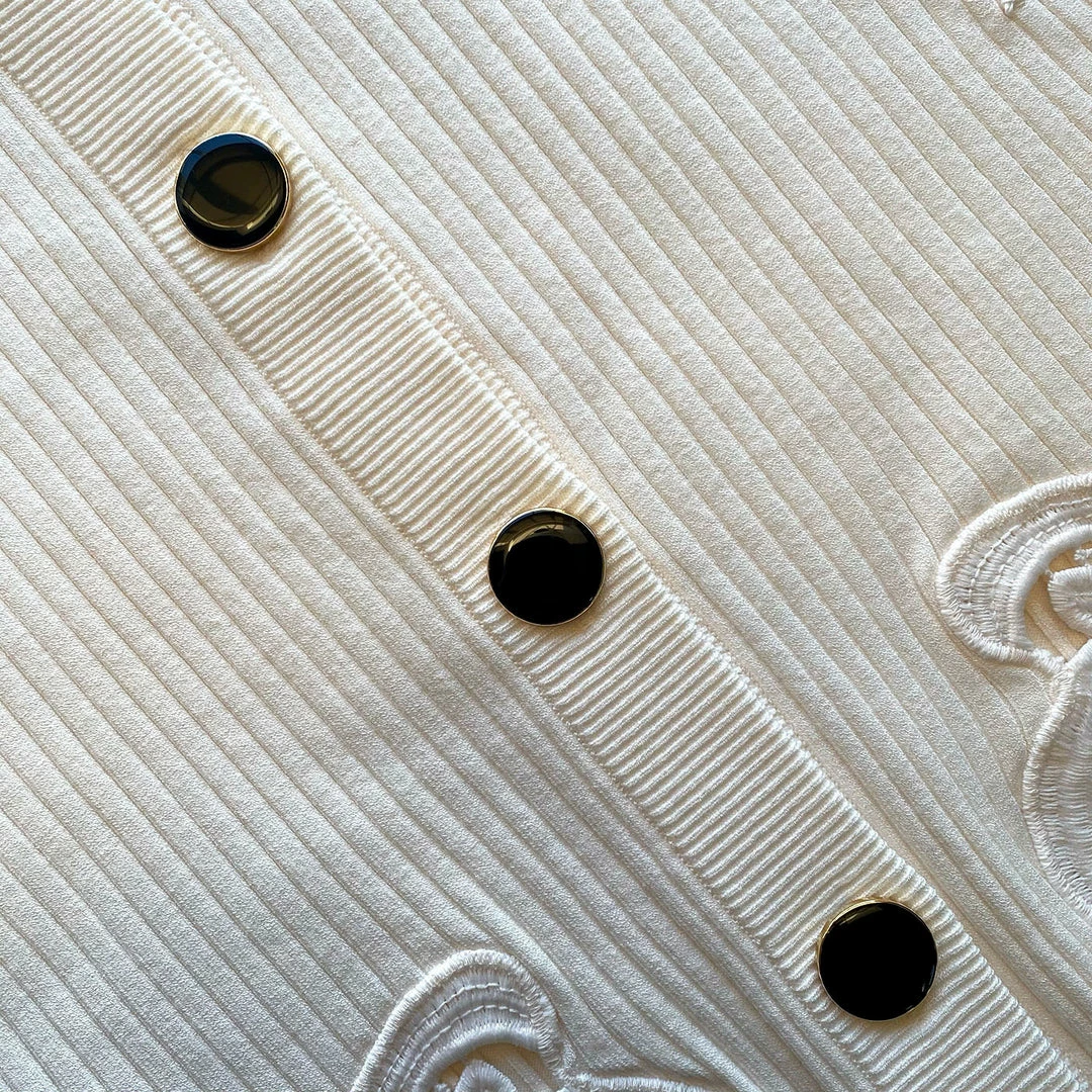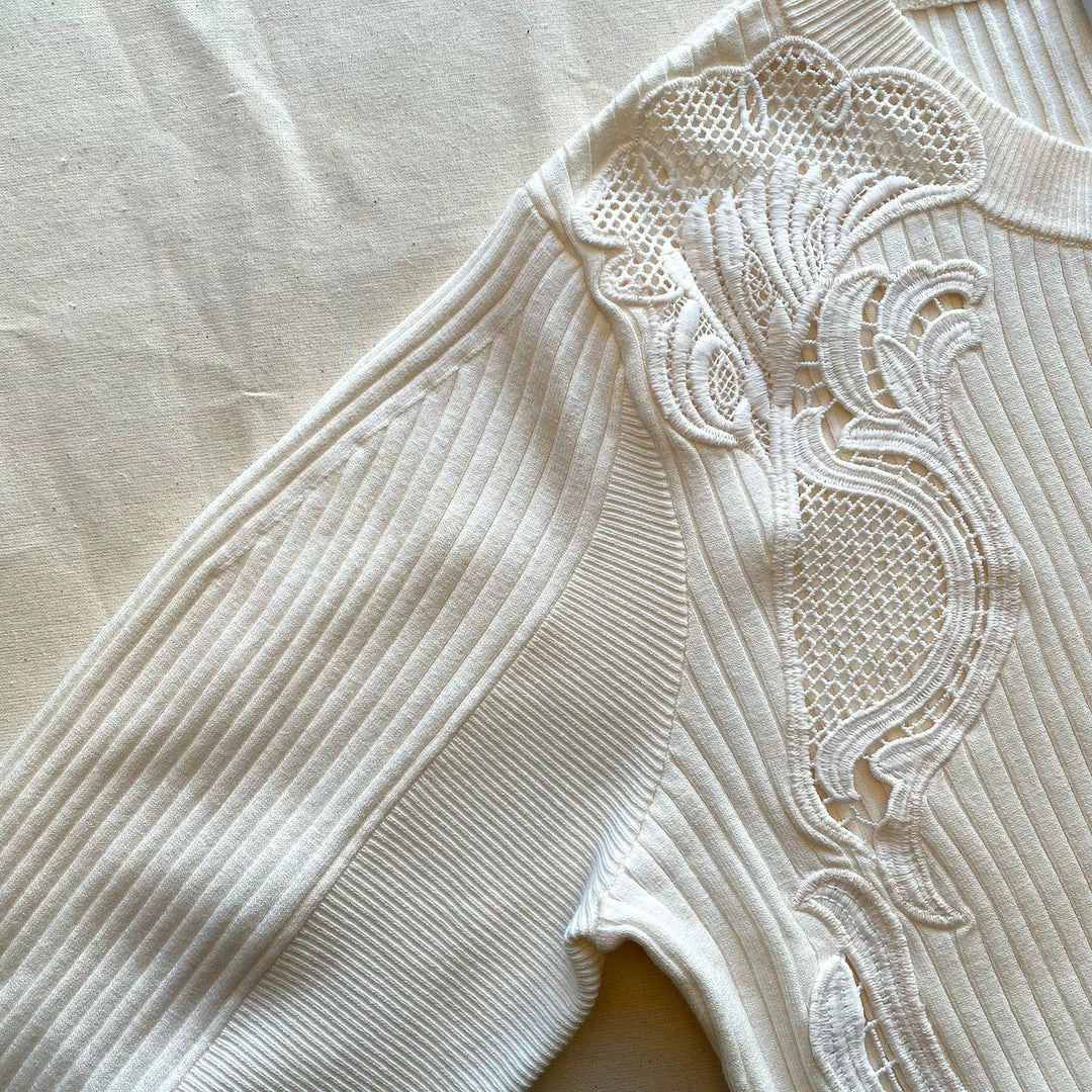 This ivory ribbed cardigan features inserted lace trims. It is designed with a subtle oversized sleeves and fastens at the front with contrast buttons. Check the Size Guide to find your perfect fit.