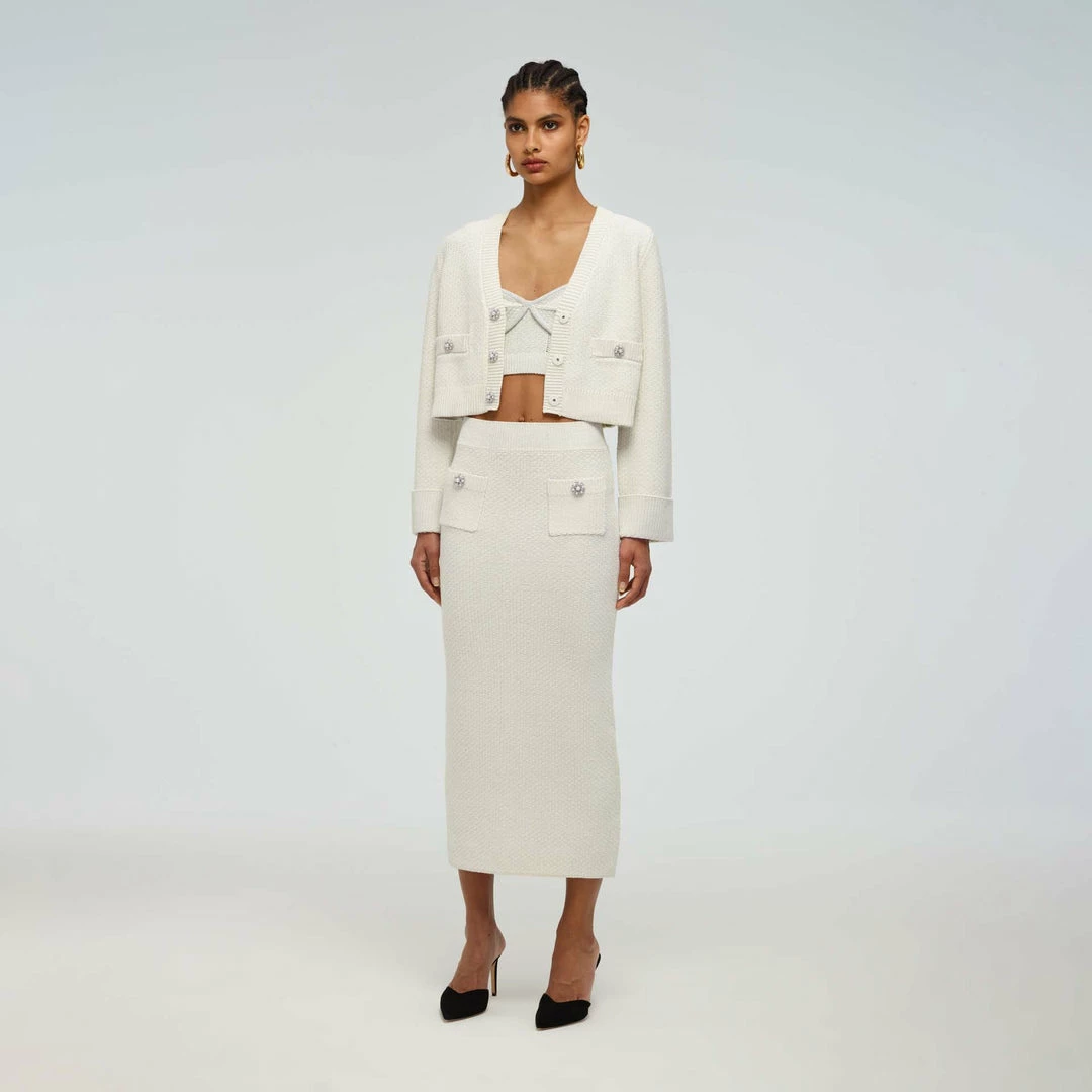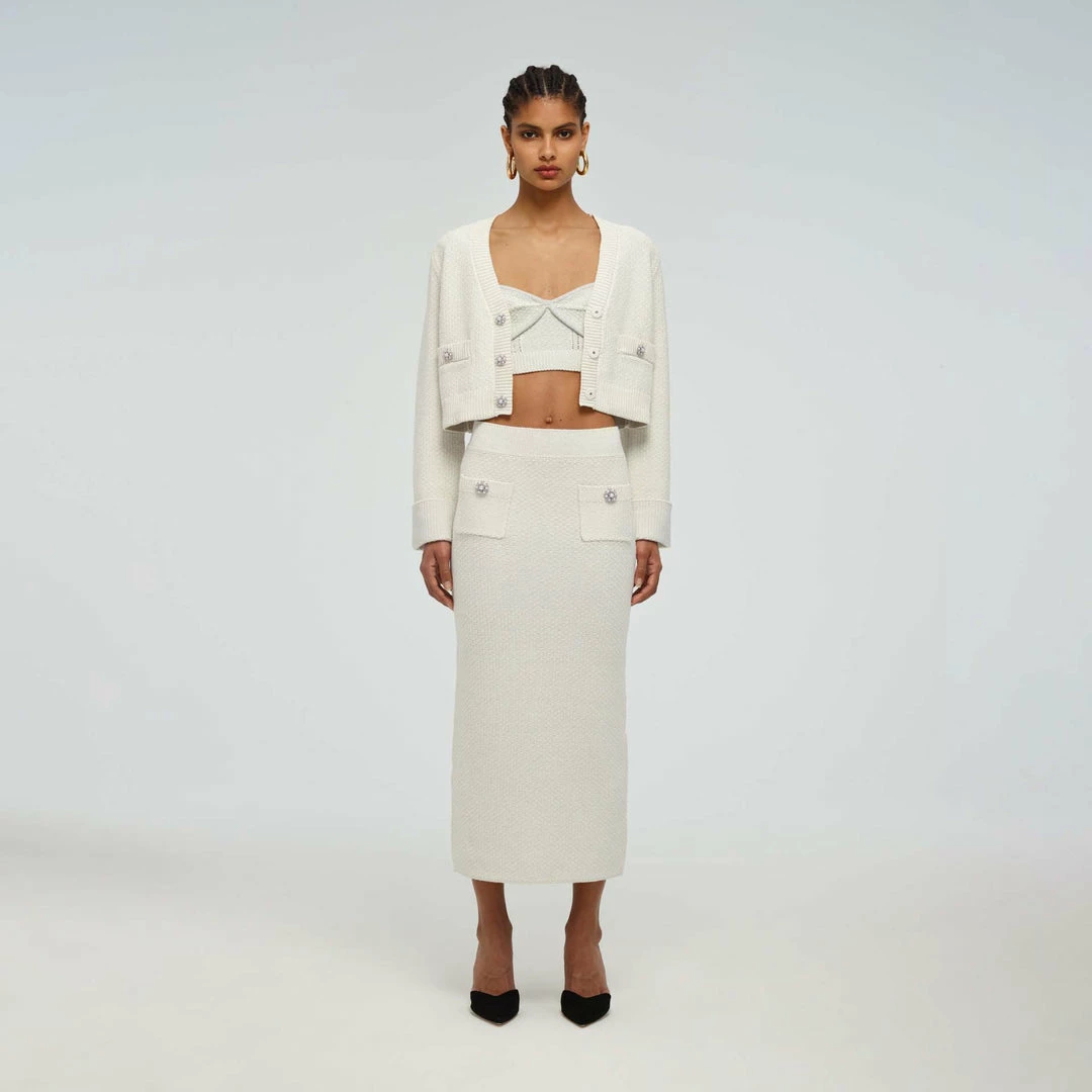 This ivory knit midi skirt features front patch pockets finished with pearl buttons. The fitted skirt silhouette sculpts the body and falls to a midi length. Check the Size Guide to find your perfect fit.