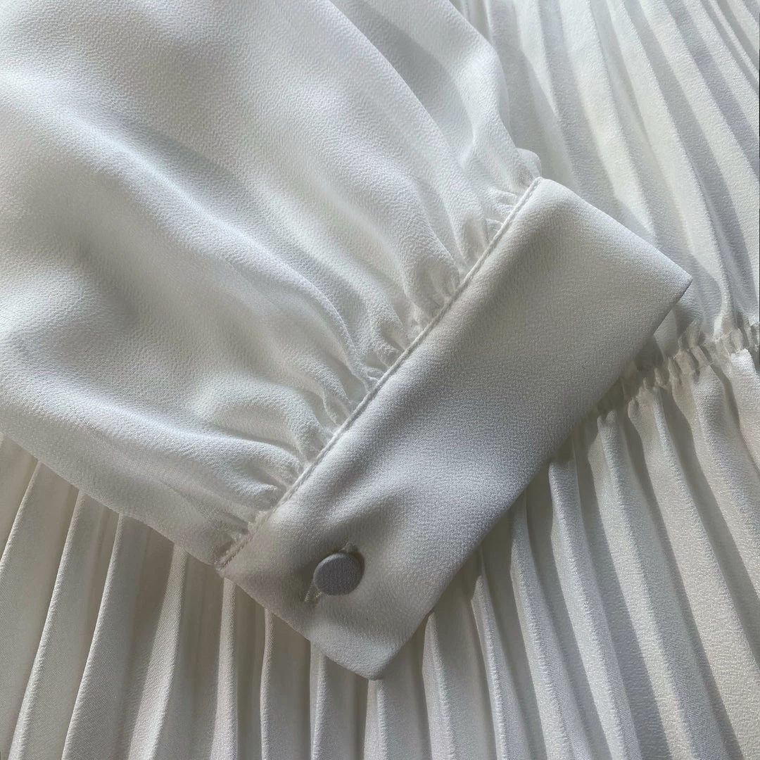 There are little white dresses, then there’s this number, cut from heavy crepe, chiffon and crepe de chine. Featuring a high neck, fitted bodice embellished with frills, bows a subtle keyhole, it falls to a pleated, leg-elongating mini skirt. Style yours for a theatre outing or dinner with the in-laws with mary janes and a leather jacket.