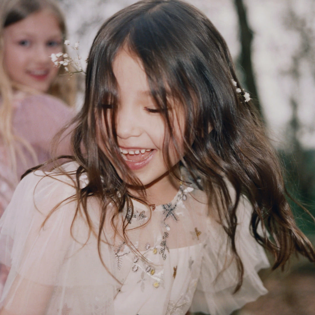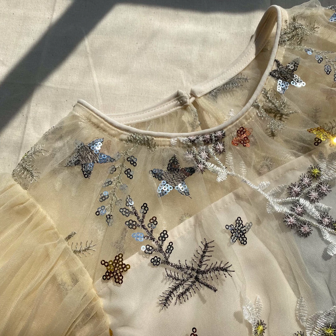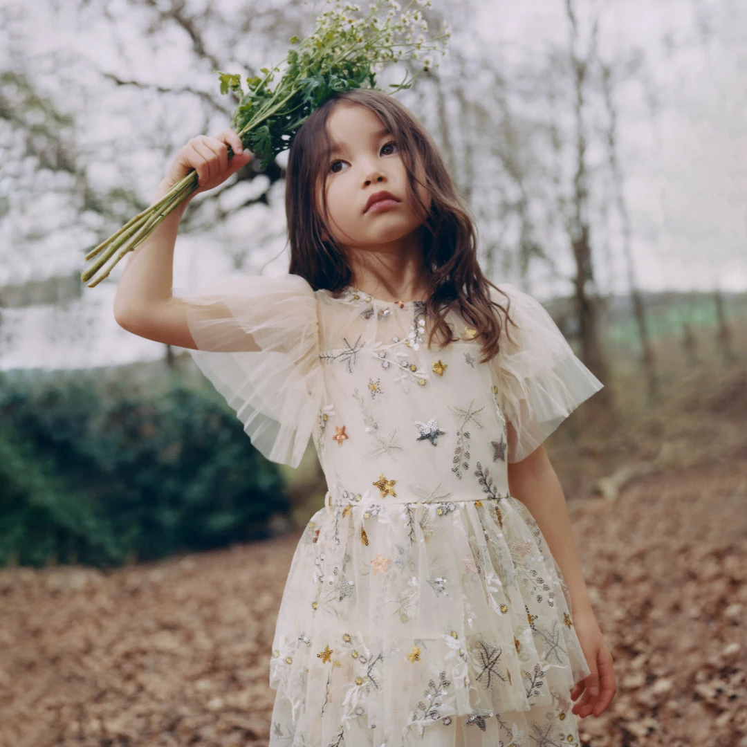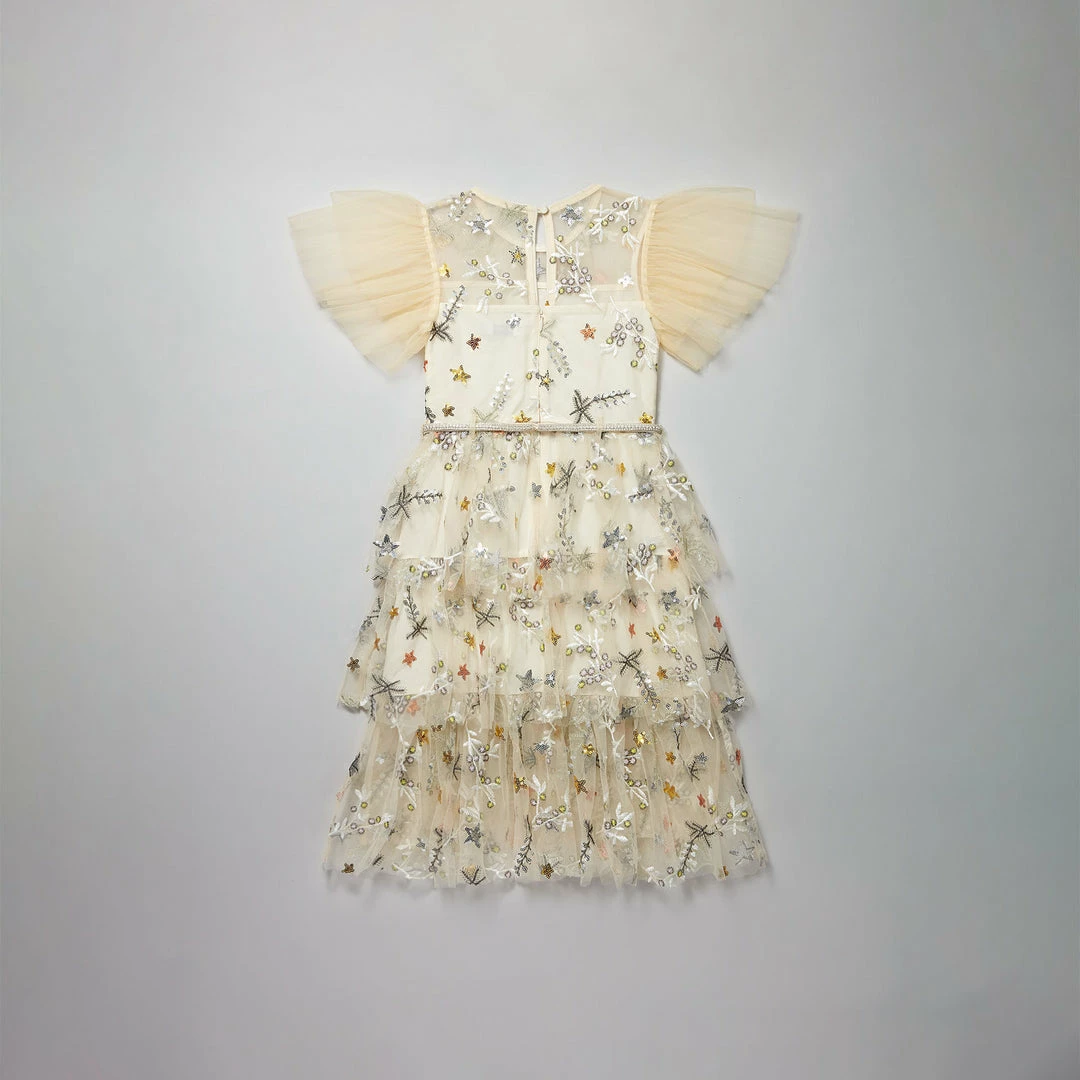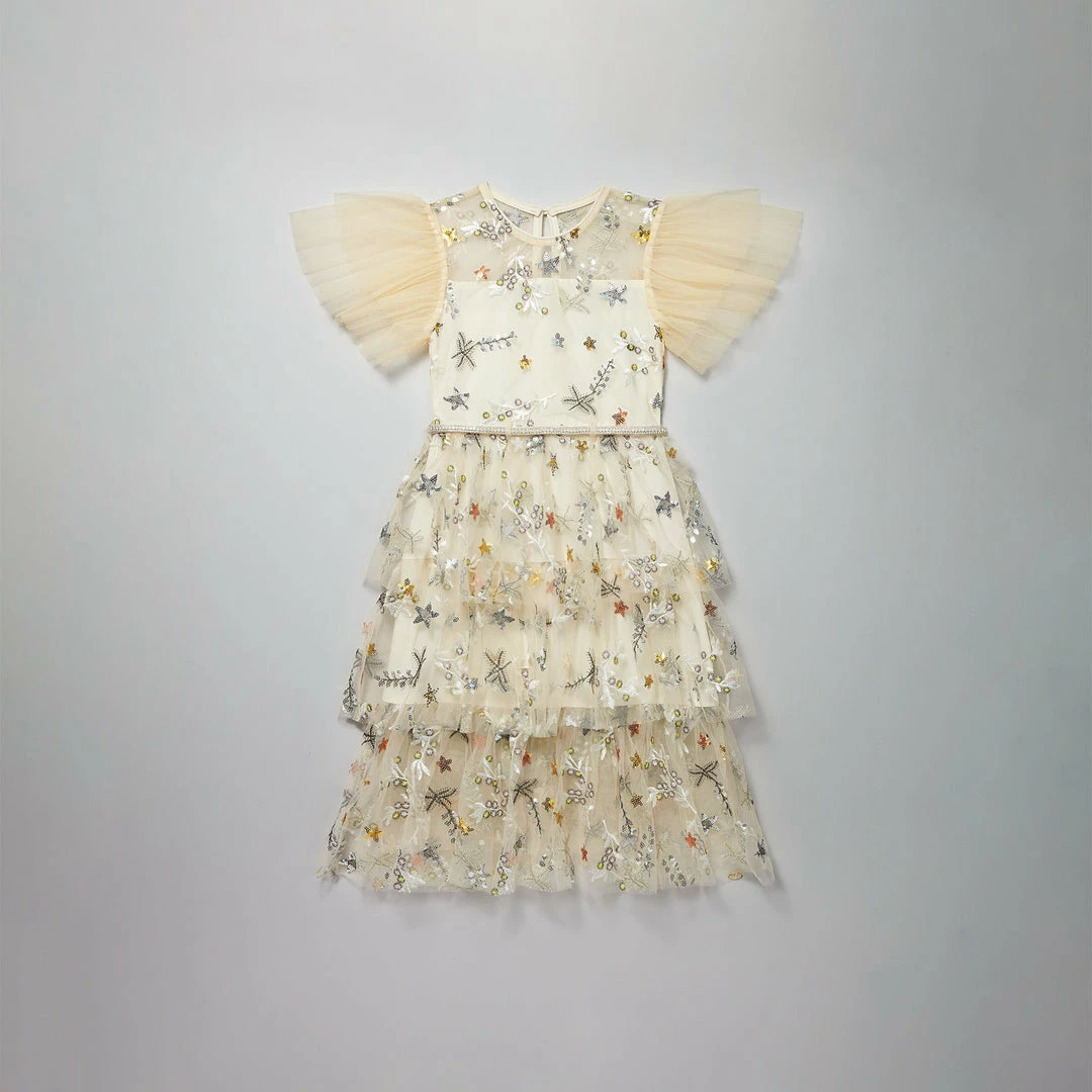 This kids midi dress is crafted from our iconic star mesh embellishment. It features short layered angel sleeves and a crew neckline. This style is fitted at the waist and is finished with a diamante trim. The skirt falls to a full tiered midi length. Check the Size Guide to find your perfect fit.