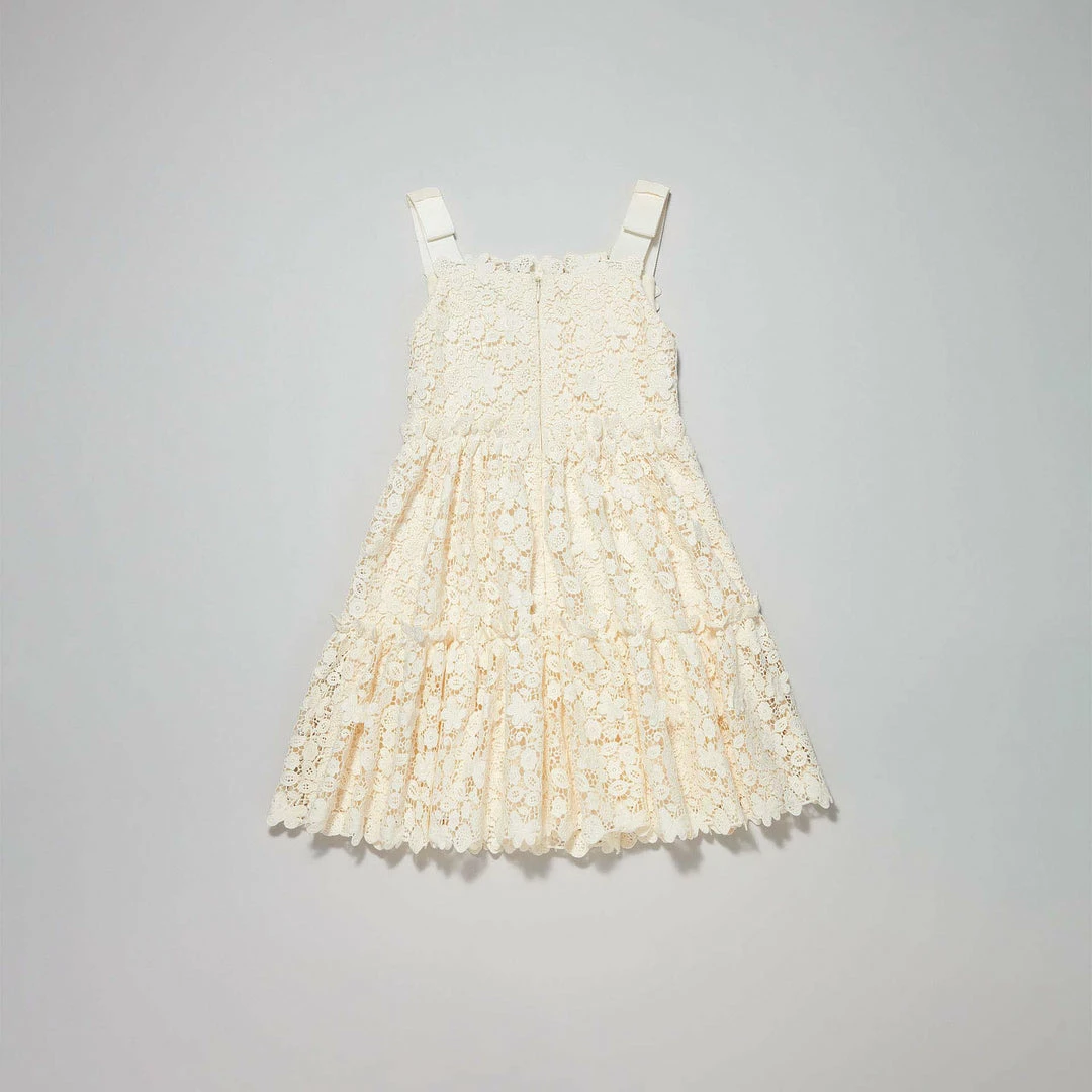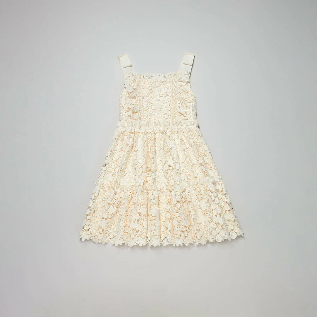 This ivory kids midi dress is cut from our iconic azaelea lace. The dress features bow straps and the front neckline is framed with a scallop edge. This style is designed with our signature inserted lace trims. Check the Size Guide to find your perfect fit.