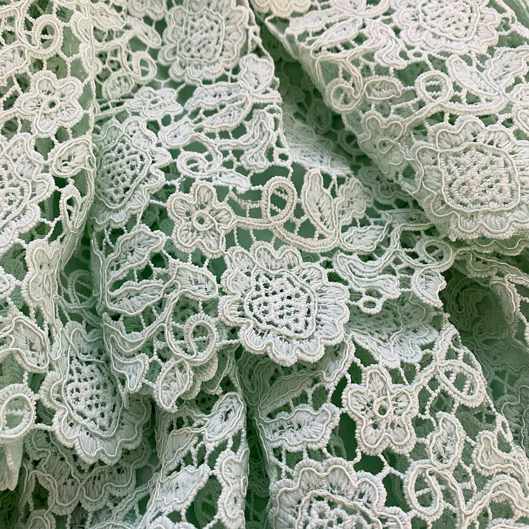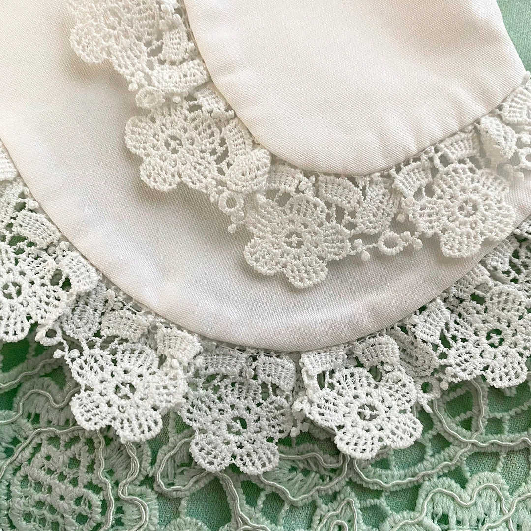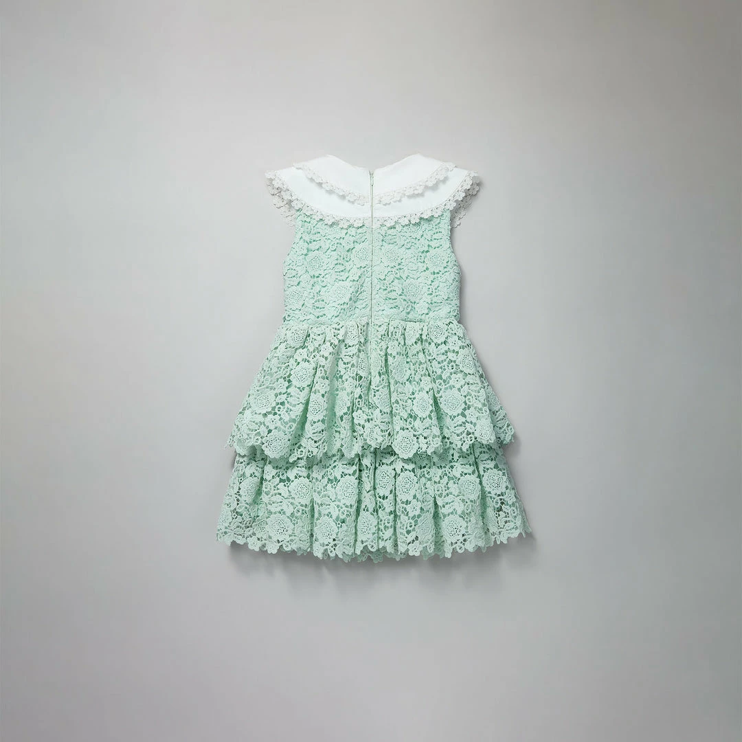 This kids dress is cut from mint floral lace guipure. This dress falls to a tiered mini skirt with each frill finishing with a scalloped edge. It is designed with a statement double peterpan collar finished with lace trims. Check the Size Guide to find your perfect fit.