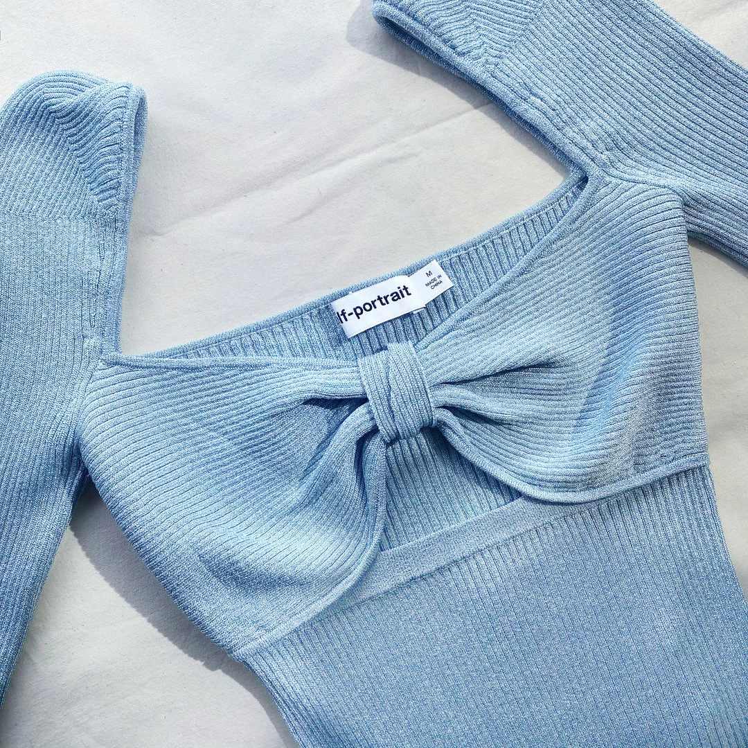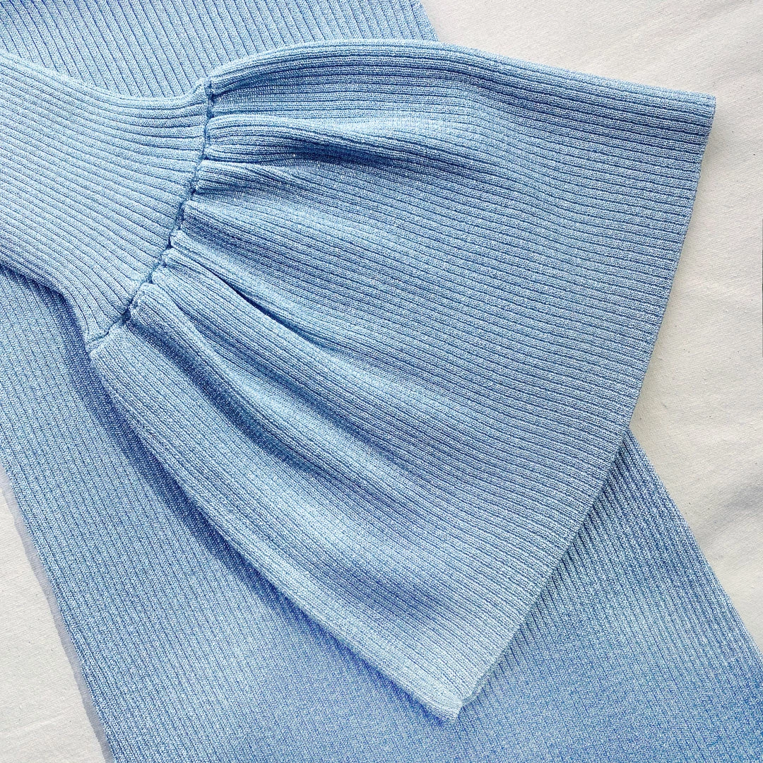 Awash in powder blue lurex knit for a metallic finish and sculpted fit, this midi dress is a photo-ready dream. A statement bow-shaped bodice shapes its flattering sweetheart neckline, while fluted sleeves were designed to emphasise your hourglass silhouette. Style it with nude heels on a night out in the city, or seaside cocktails on a weekend away.