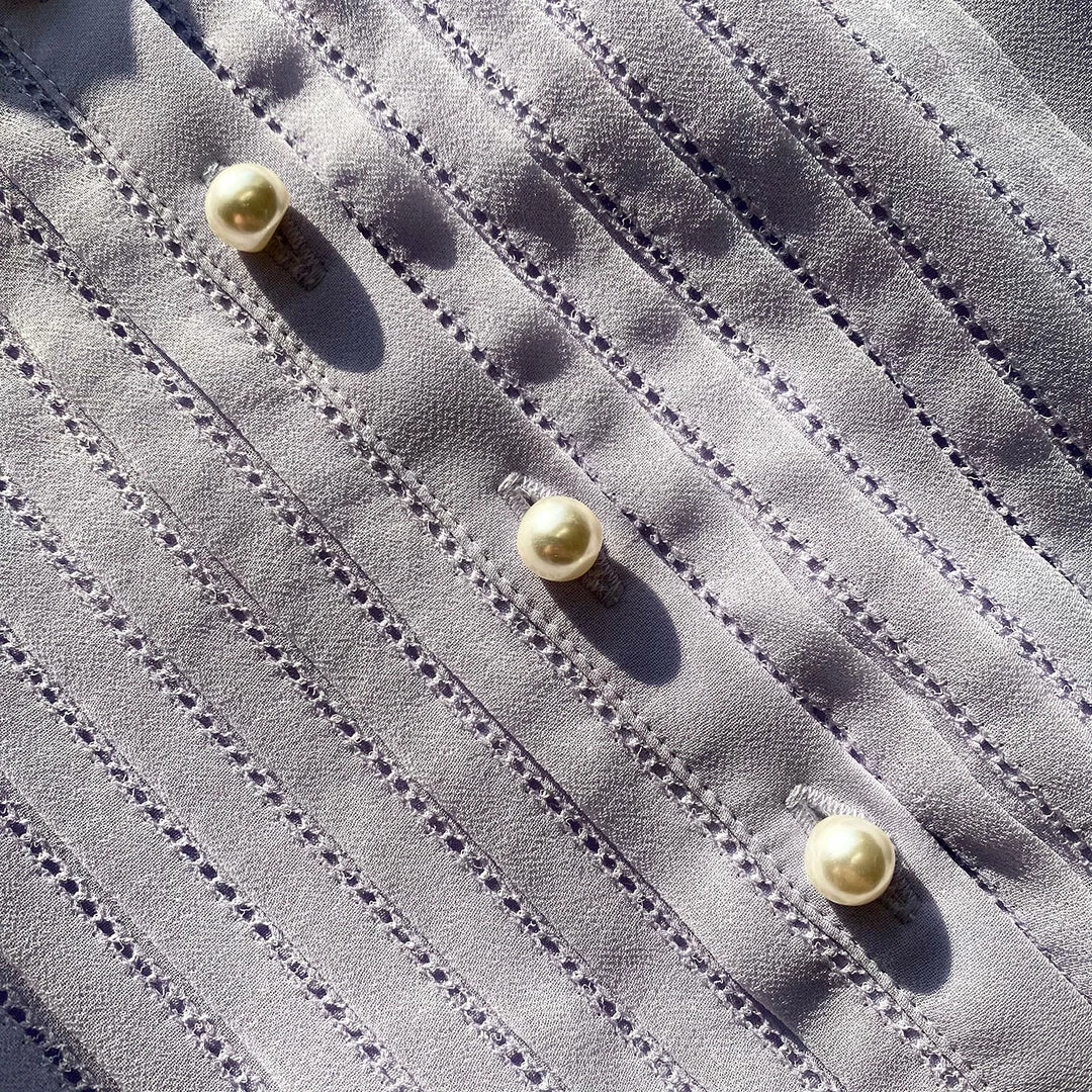 This midi dress is cut from lilac chiffon. It is designed with long sleeves and a pussy bow tie at the neck. It features pintucks at the front bodice and fastens with faux pearl buttons. It is fitted at the waist and falls to a pleated midi skirt. Check the Size Guide to find your perfect fit.