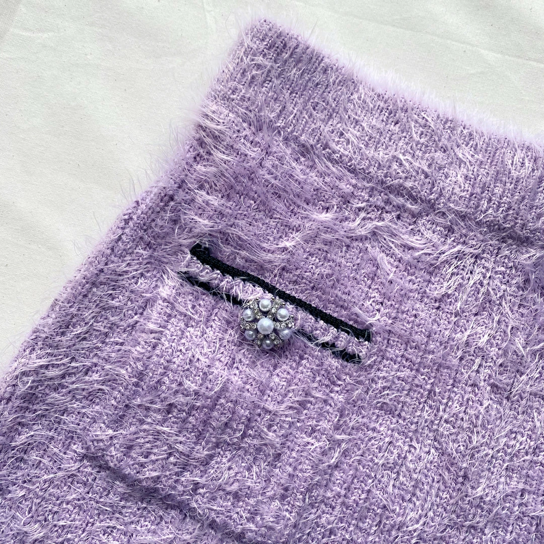 This lilac fluffy knit mini skirt is designed with a slim fitting silhouette and features a diamante button on front pocket. Check the Size Guide to find your perfect fit.